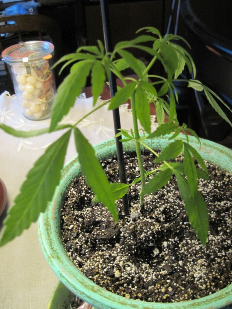 I was using a standard full-spectrum light at first but my roommate thinks it'll do just fine with natural light....maybe, but for numerous reasons I don't want it to get any taller than it is now (indoor grow, I don't have a specific space set up). As a seedling it was in a window and got pretty leggy before I had the grow light and now that it's been placed in a window again (what part of 'stealth' does my roommate not get?) it's getting tall again. Seems healthy, but I did notice that a couple of the larger fan leaves are curling slightly.