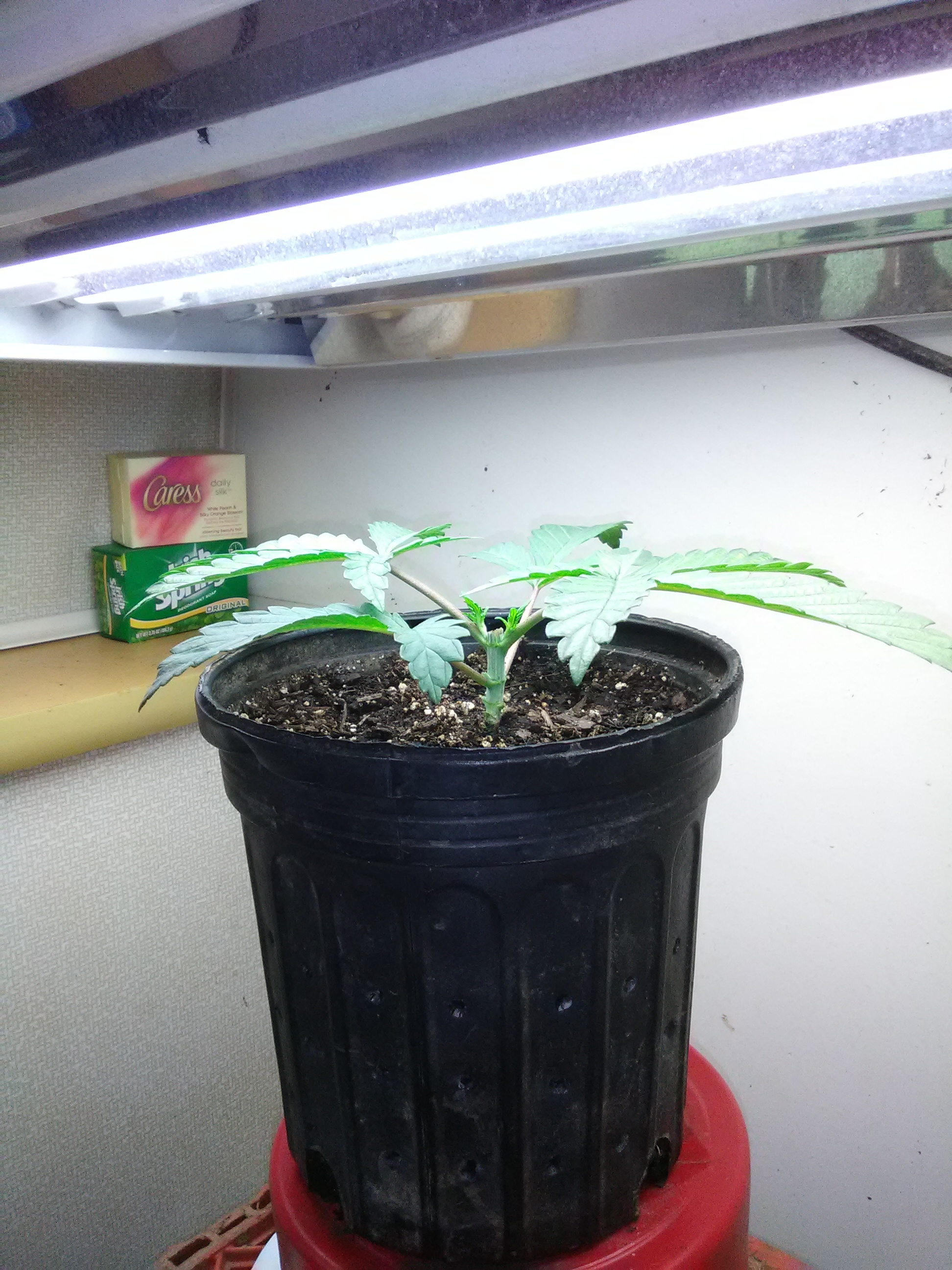 20 days from seed. Unknown strain/"twin peaks", soil grow, 6500k 24w t5s, 24/0 on lights. Mainlined roughly 24hrs ago. Was just starting to grow 6th node. Left 2nd node fan leaves for extra power on growing out my mains. Once they're big enough to tie down I'll take the rest of the leaves off and hopefully it'll do it's thing. Just hope I'm doing it right.