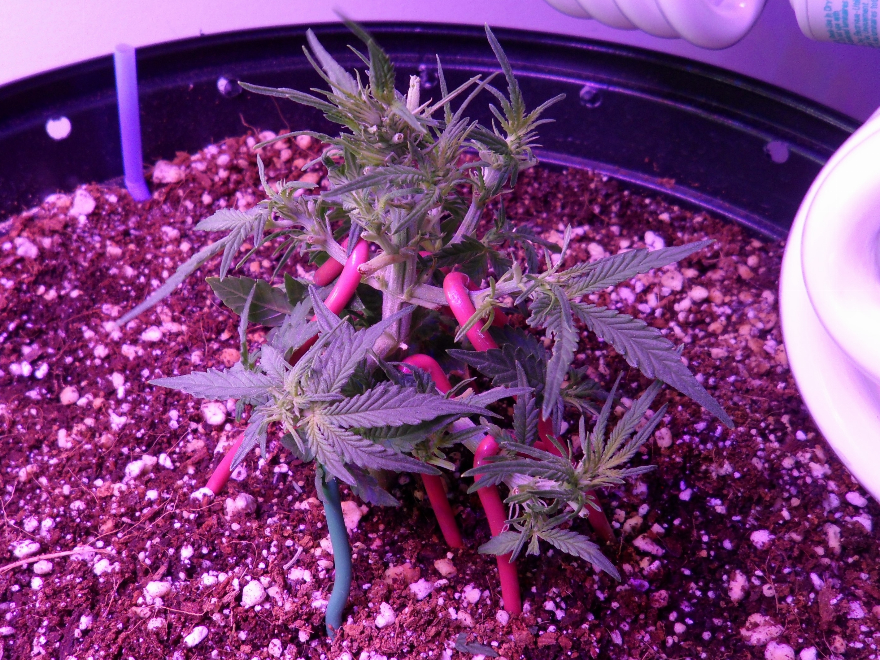 Feeling like I had nothing to lose, I've been tying down Bonsai Bud. She's entering flowering. Today, once again inspired by the Automechanics, I give her a trim. I've changed the CFL's to 2700 Kelvins