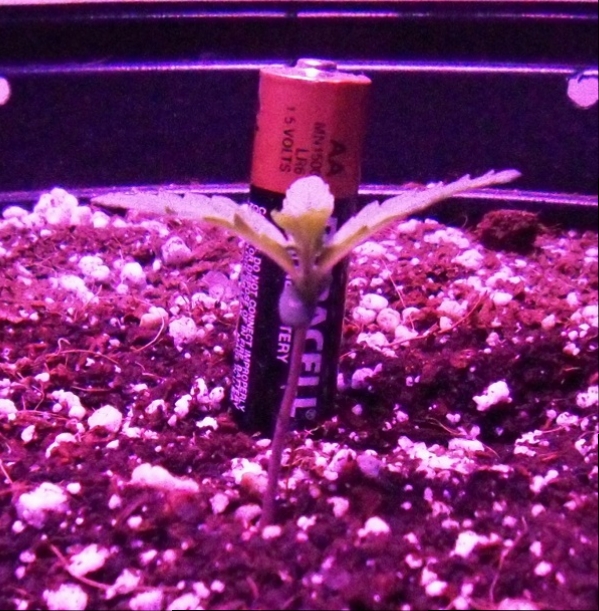 Note: I started feeding my latest seedling after 5 days. I had the CFL's within a couple of inches from her from day one. Within a week, I brought her under the LED as well as the CFL's. She looks amazing so far. Lower right of pic above