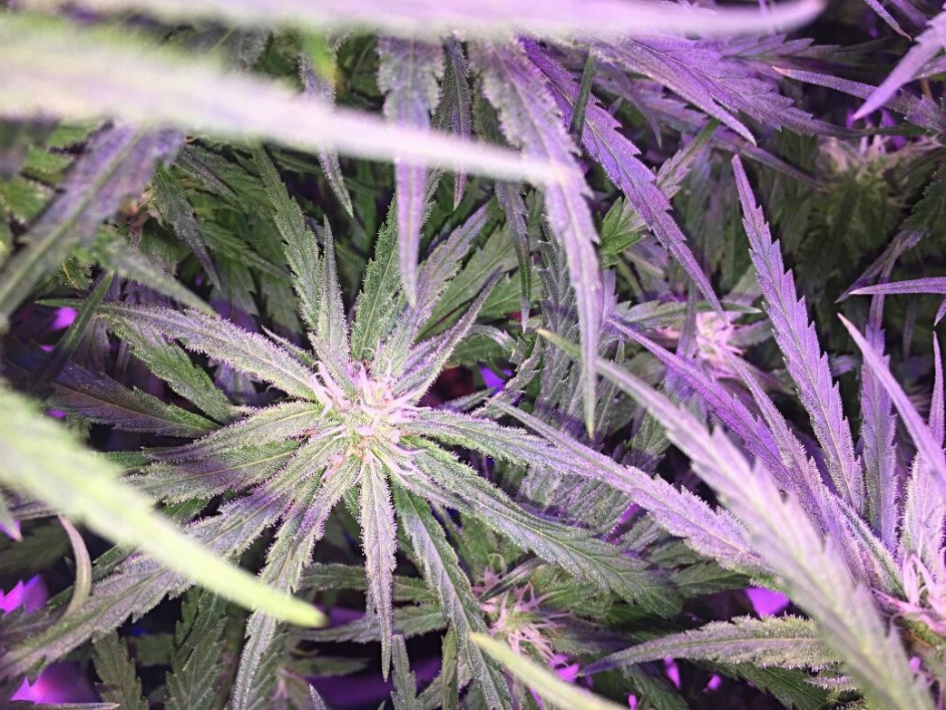 But at least looking on the bright side, every single leaf is laden with white, frosty, sticky stuff. So she is producing resin.