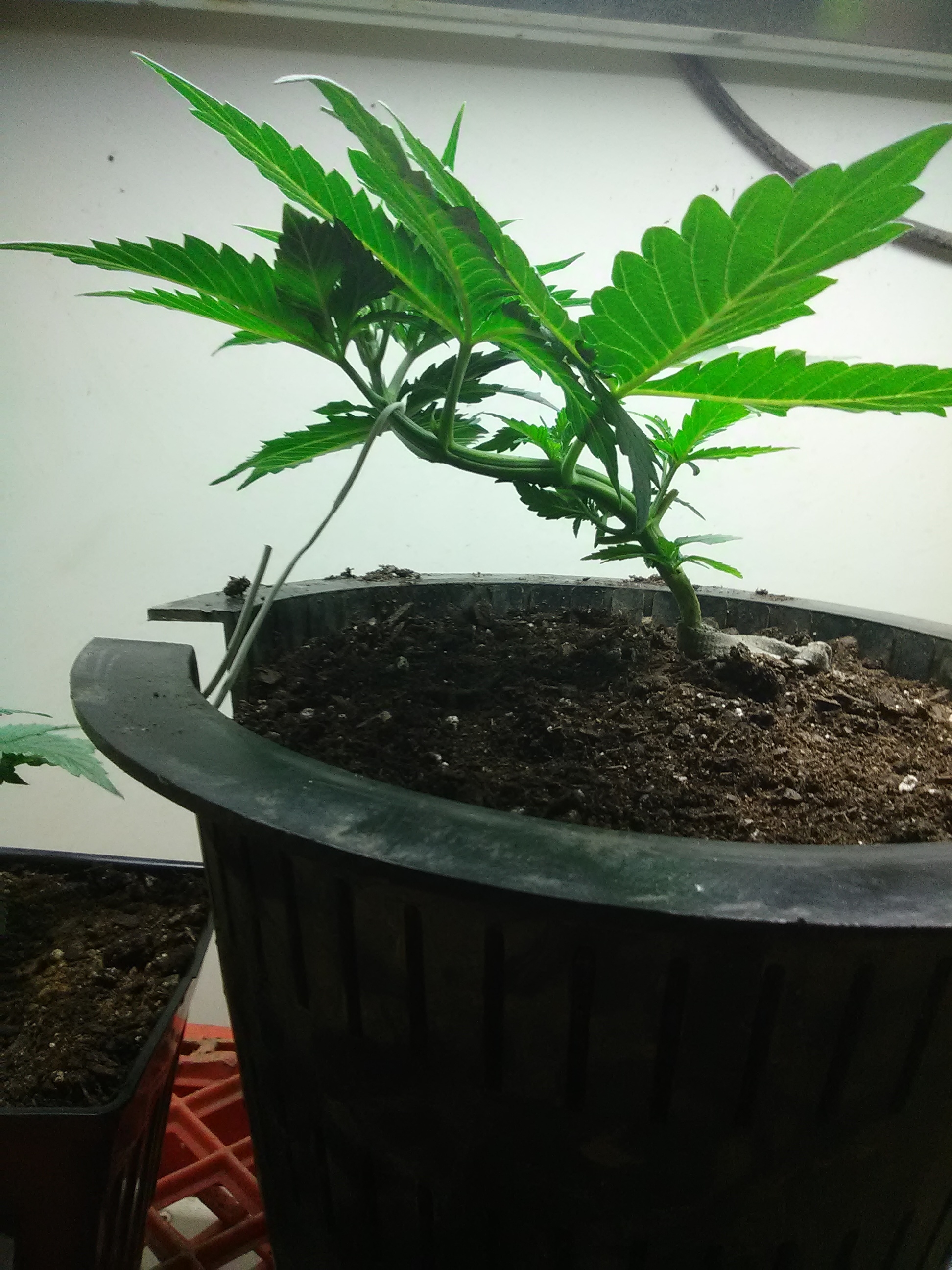 Okay well here's an update of Ol' Rando. Lol she seems to be doing good since lst. Trimmed two lowest sets of fan leaves for better light penetration. Trying to tuck as much as possible. But still on same regime as far as everything goea. Still no preflower also. Transferred to better pot though. Waiting for some storms to pass the next couple of days then she's being transplanted outside. Ready to see her blow up! 😀