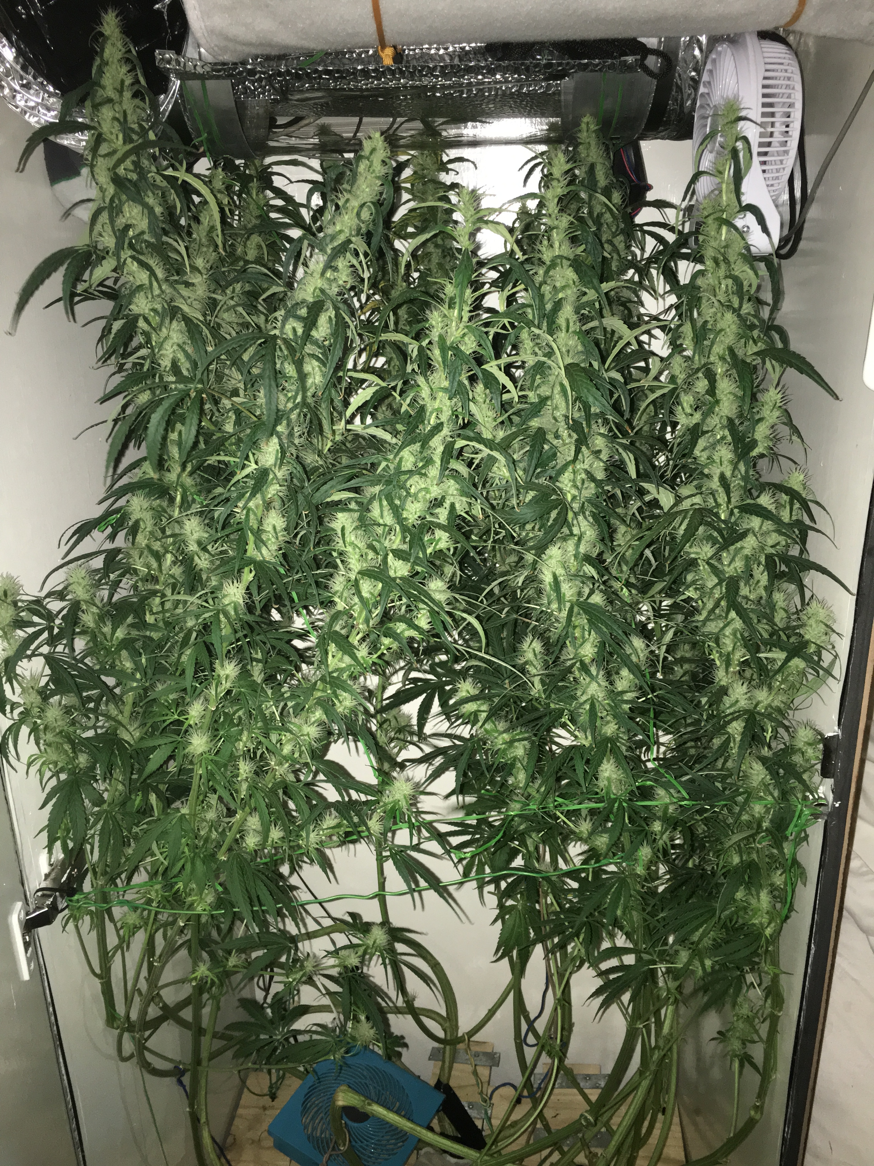 They are doing quite well, although the super cropping slowed her down slightly. This plant has been under stress pretty much since the beginning, constantly bending and tying down branches, she is growing way to big, you can see on the picture I had to bend some stems at a 90° angle , Hectic, never imagined she would grow so much, but she is slowing down on the growth finally, just a few centimetres every few days or so.