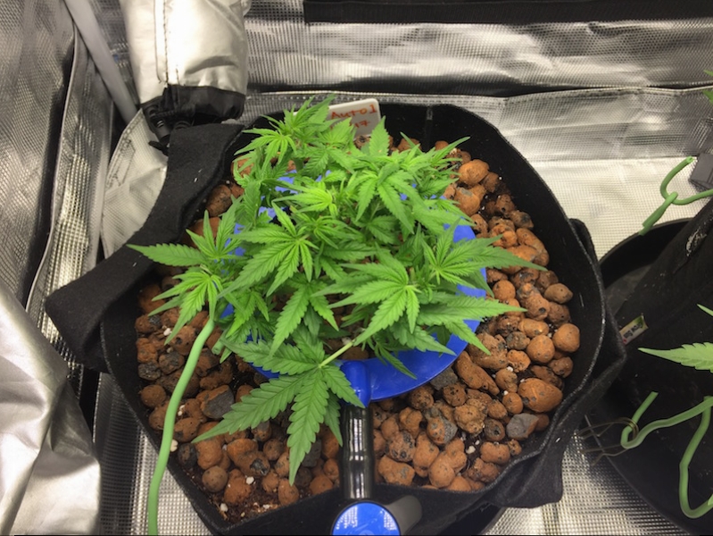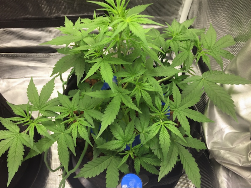 This lady is stranger. She's not growing as flat, but taller. Again, I defoliated, but I didn't need to defoliate much. And again, I used the velcro ties to loosely bunch up the top so that the middle part can get some light. She is NOT showing pistils yet. She's also 4 days younger as she took 4 days longer to germinate.
