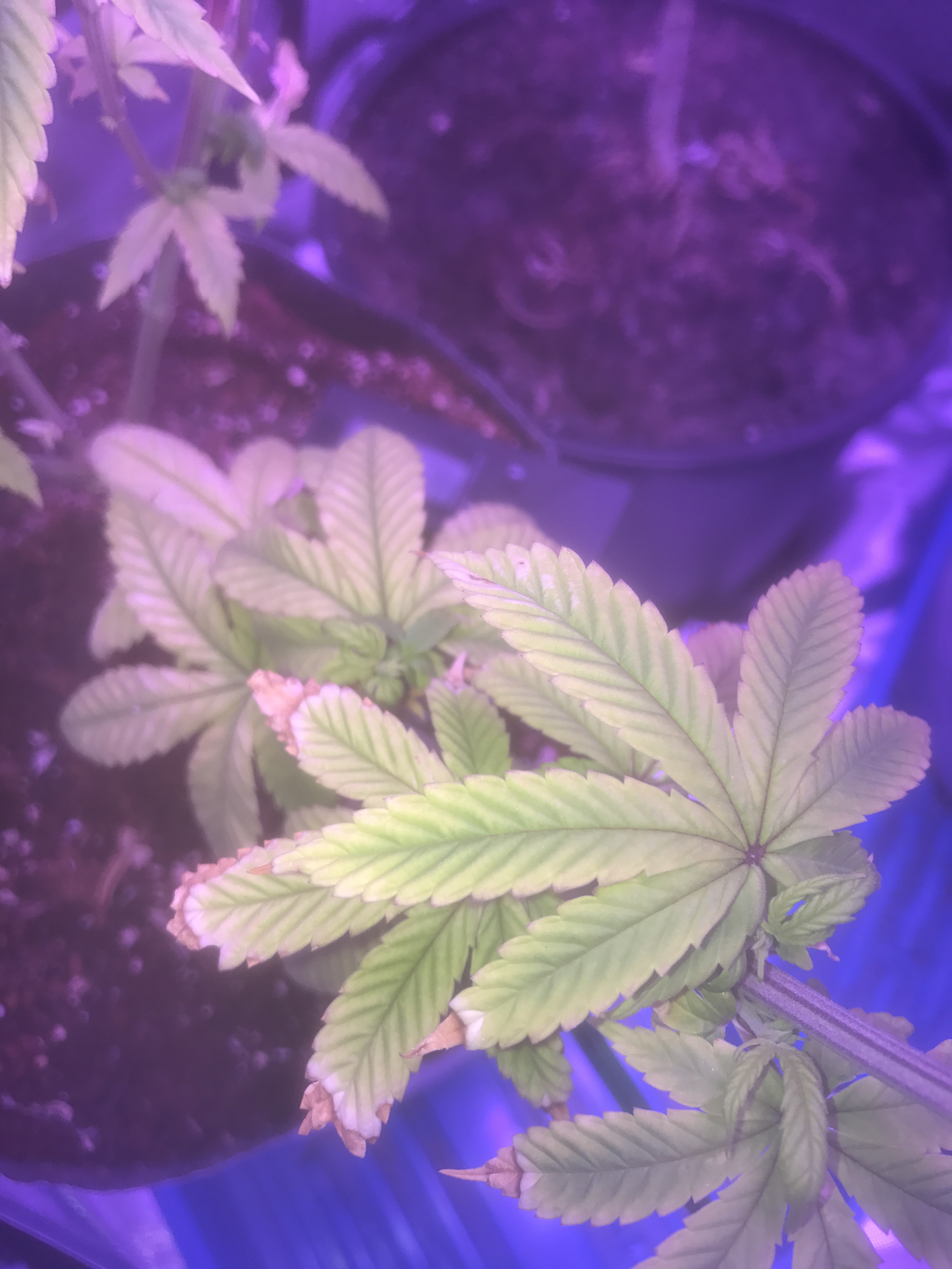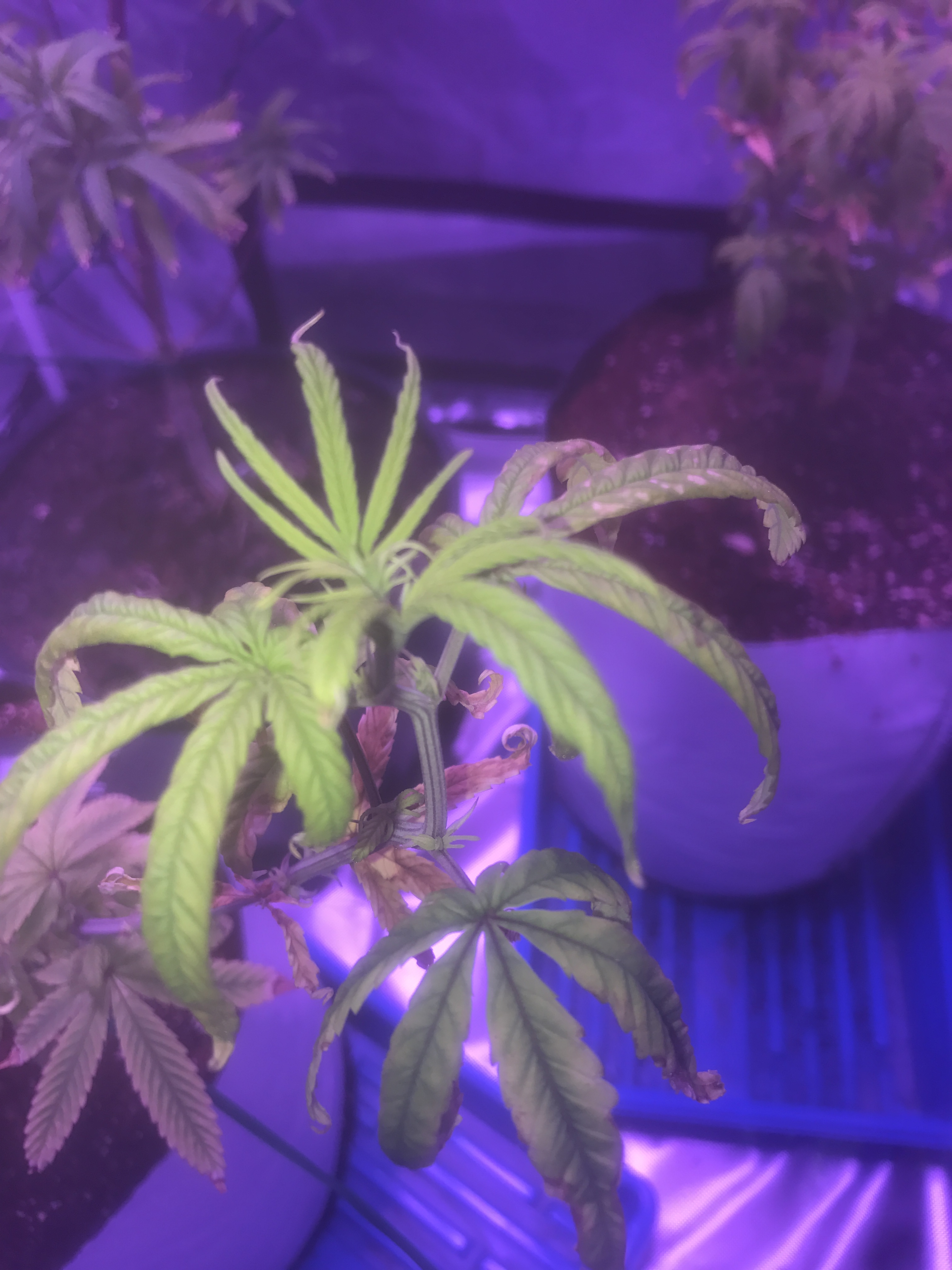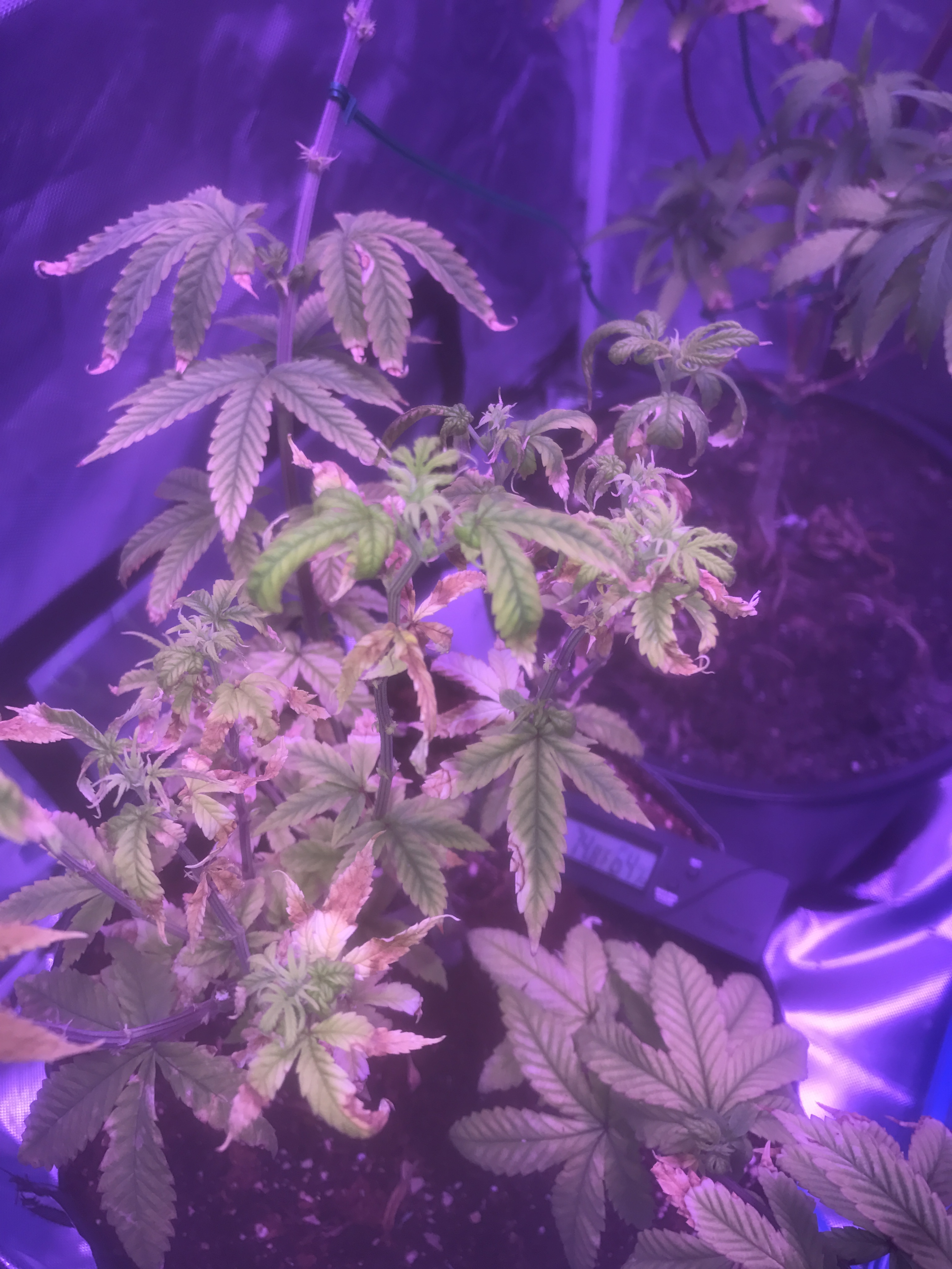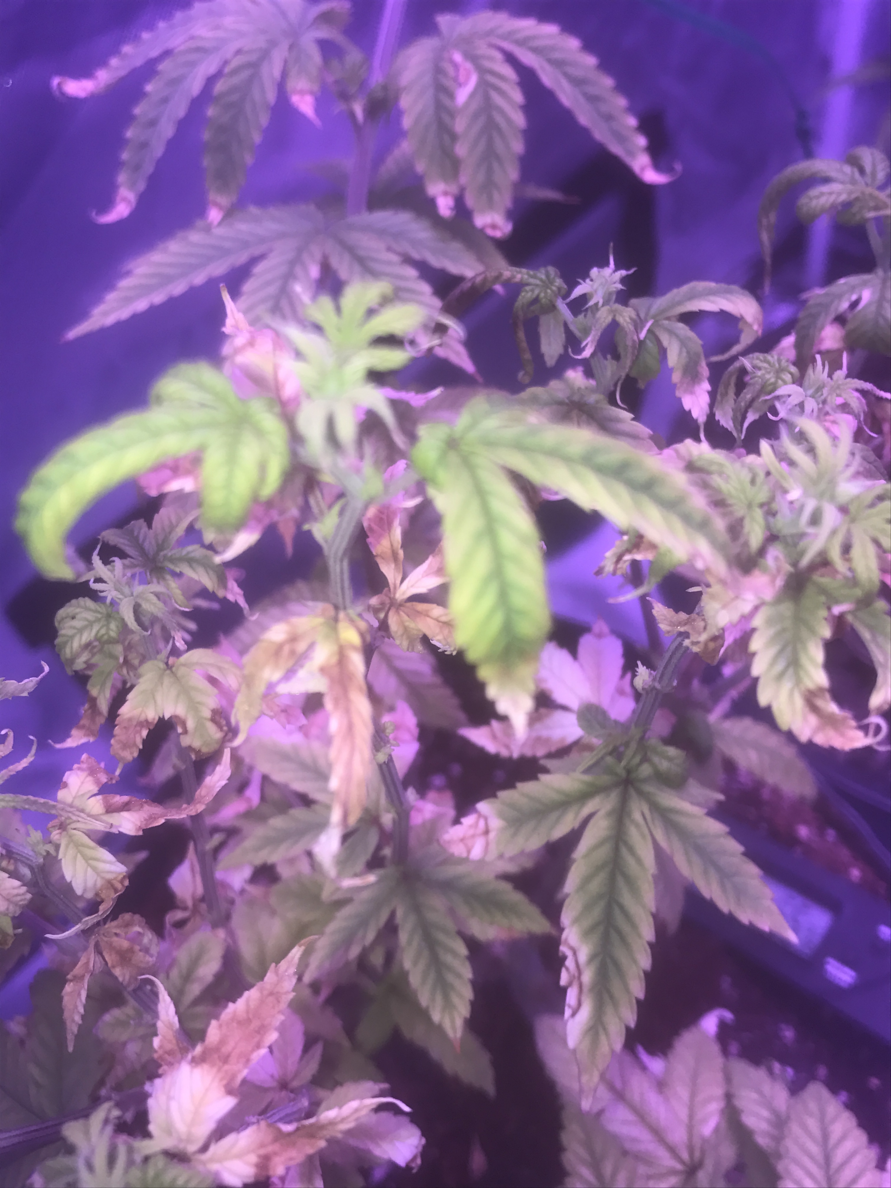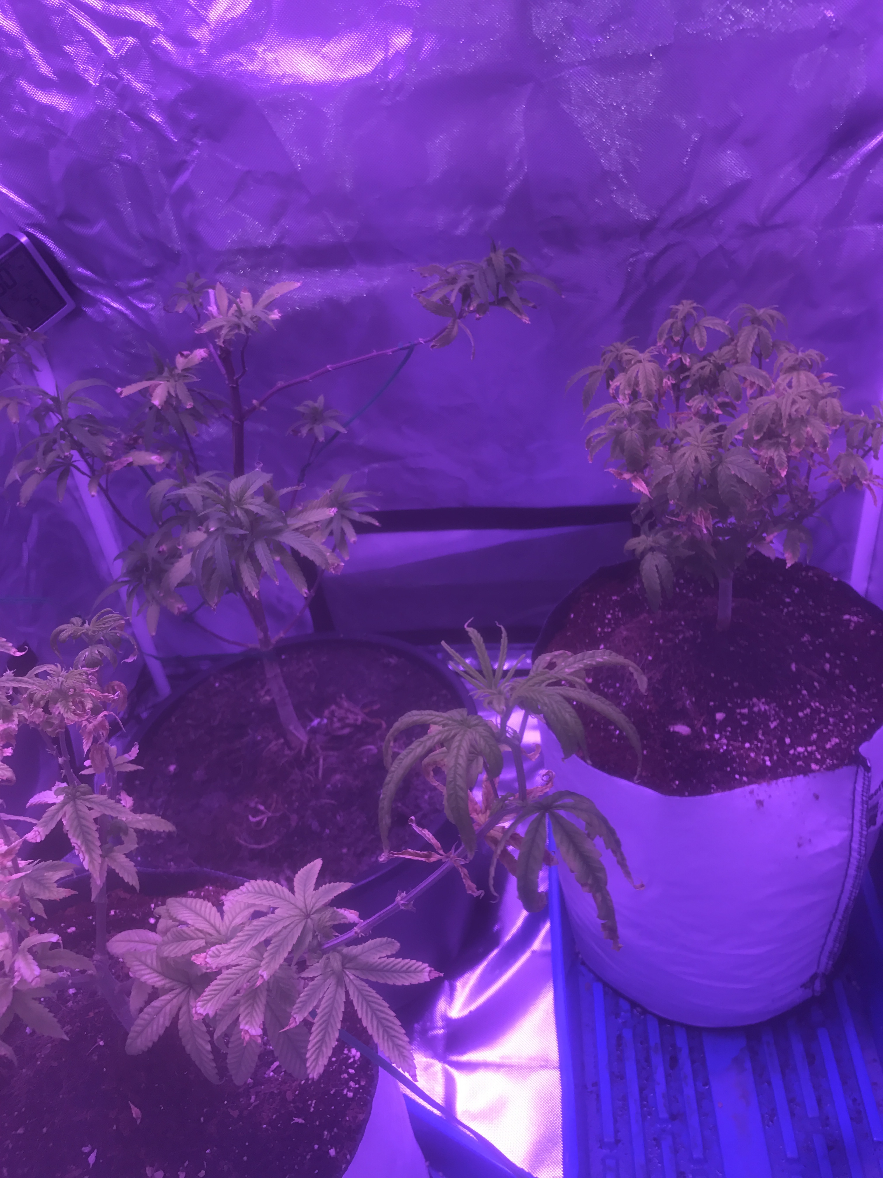 I've had these plants for 4days so far, I ended up taking care of them. I received them with little damage, and the plants looked like they have been put through a bit of stress. I have been giving them a cycle of 18hours light and 6 hours off. The 2 OG Plants were transplanted into 5 gallon pots, and watered with nutrients, ph around 6.3-6.7 and placed back in tent, but they seem to have got droopy, and they have pale white leaves and light pale green leaves on 2 of the plants. The edges and tips of many leaves crispy and dried up. I was keeping the LEDs 12-14" from the plants, but moved them to 18-20" away now incase it is light burn that's causing my problem. Hope my set up and pics help explain what's going on with my females. Any suggestions on how to get them healthy again?