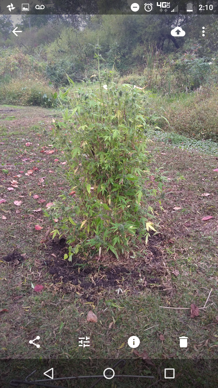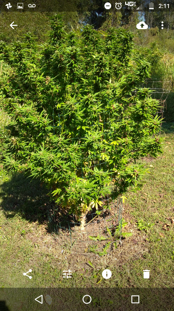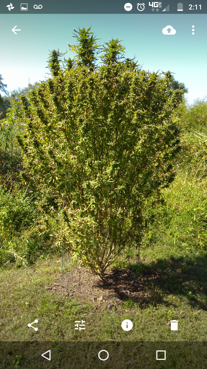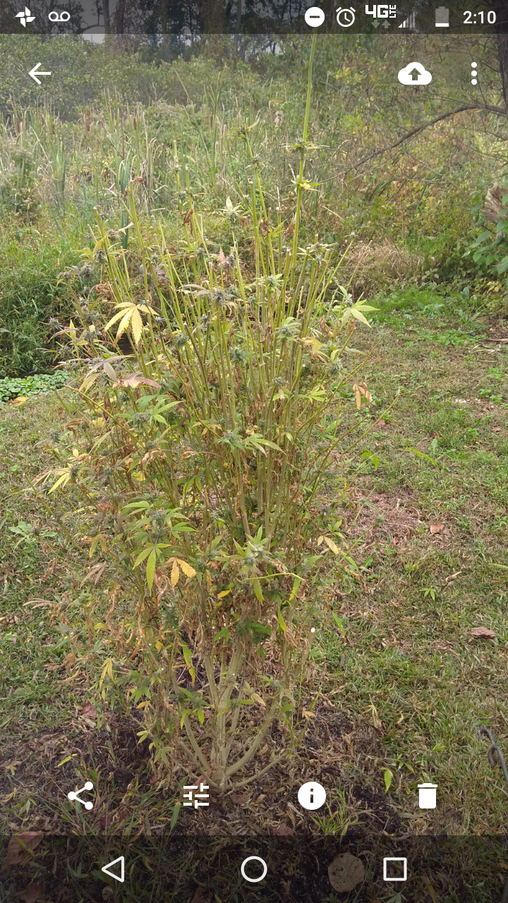 Well was gonna add some new pics but had other more pressing matters to deal with.. I been helping my pops water, feed etc his girls that are outdoor because he hurt his leg well apparently my junky little brother stumbled upon them when he was staying there a few months ago when they were babys because that dick came back an cut the top 6 feet out the 2 that were still there.. I just helped him cut down the 6 other bigger ones..thankfully but I think he's been cutting some here an there an just came an got the whole thing this time.. well may as well have.. was. Northern lights an skunk #1 they were about 8-10 feet tall.. this what they look like now 😖😖😖😤😤👿👿👿👿👿👿👿👿 needless to say I got blamed for the shit cause the 2 weren't ready yet they still needed a couple more weeks to fatten up an I told him don't cuttem yet cause he cut the other ones to early an later that night... Dickhead gottem... Luckily a buddy text me an told me he was trying. To sell everyone wet bud that he didn't dry... Or I should say trade for dope or whatever else his dumb ass is doing .. so I had him set him up an got back a little... No where near what he took but cleared my name anyway... I'm glad he doesn't even know about mine... Cause I prolly would have choked him to death if he hurt my girls......to give u guys an idea the other 2 aren't those plants but to give u an idea on the size this how big they all were ,we already cut these down thankfully