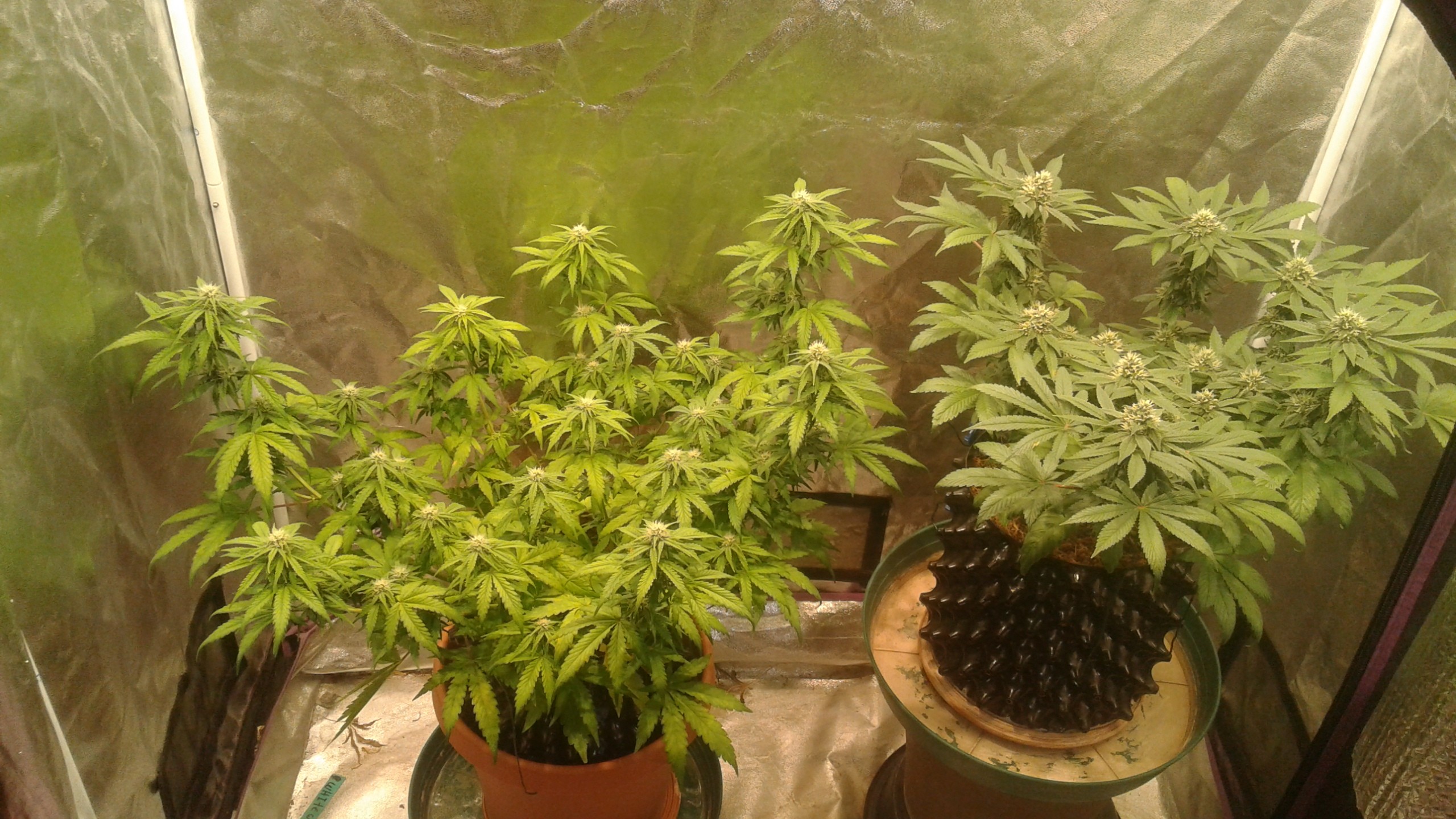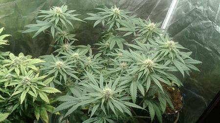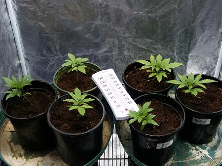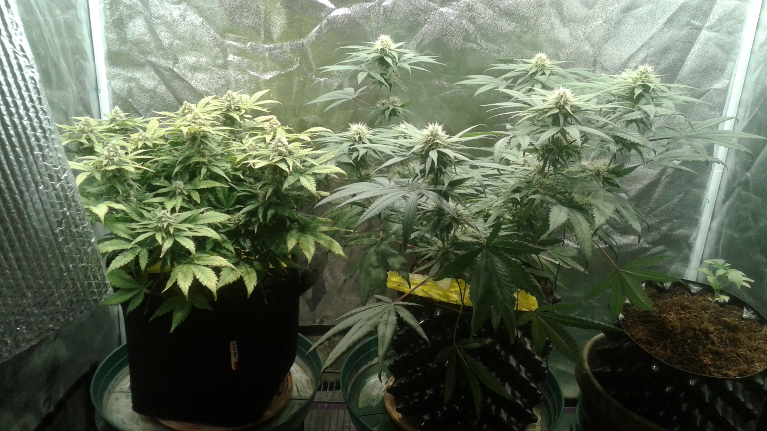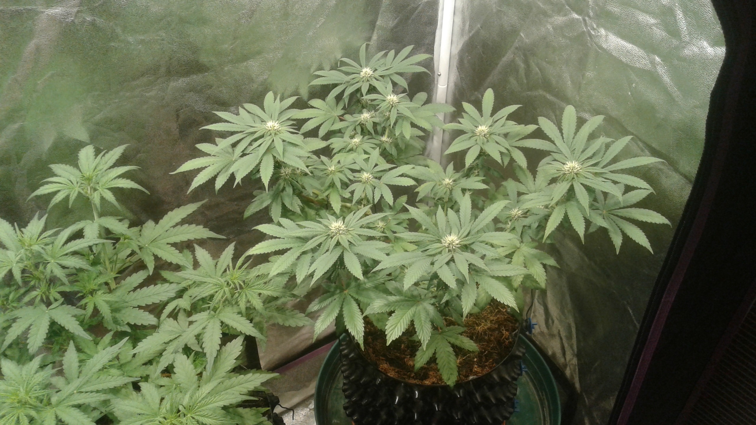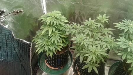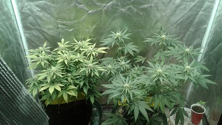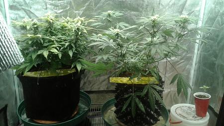 ID:	266215 far left is orange hill special, photo fem, topped at 4th node. Today is day21 she will begin 12/12 tonight.