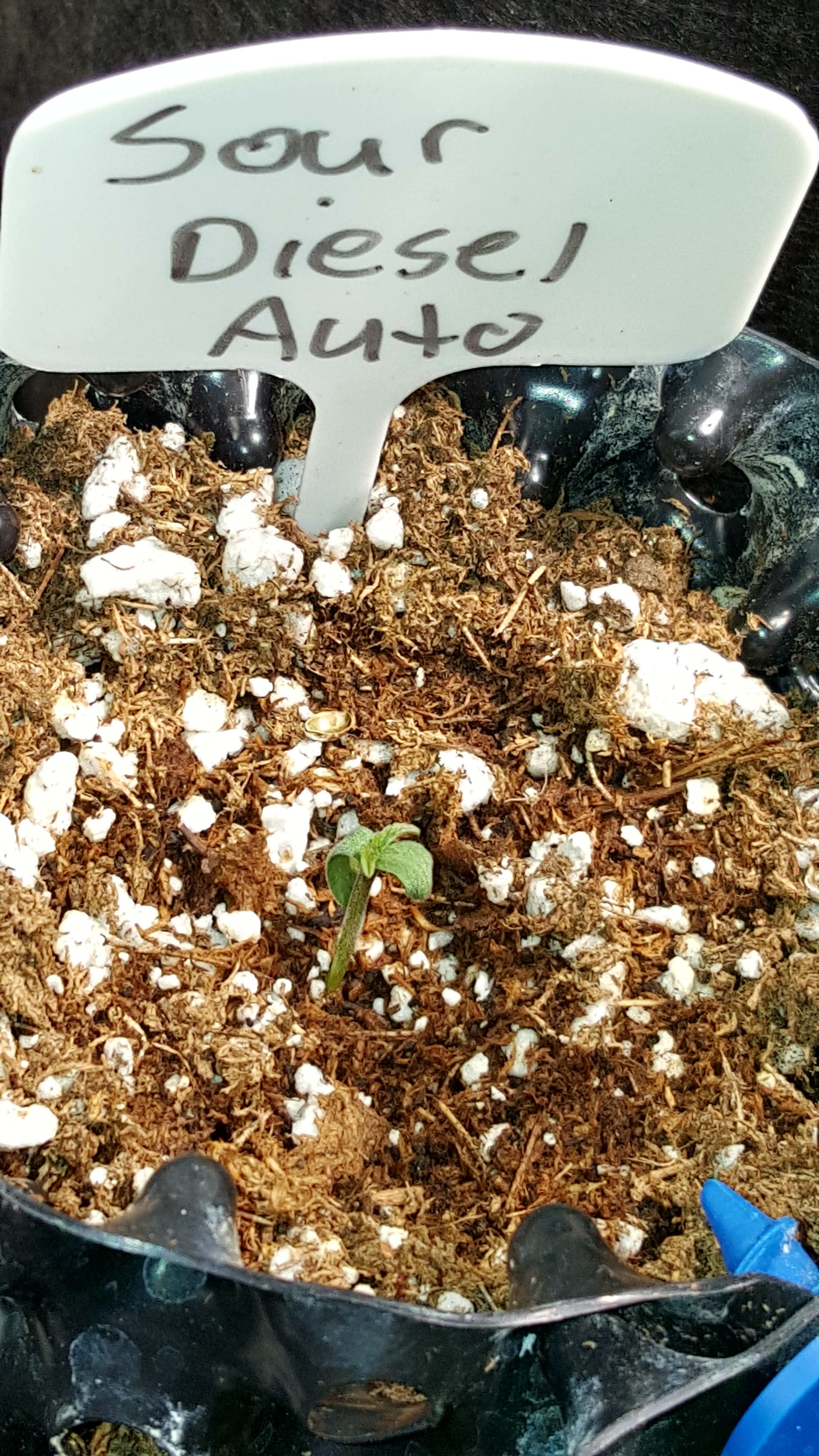 Day 1.. Sour Diesel Haze Autoflower...I'm trying out a new medium by ION ORGANICS... She will only get unph'd distilled water and a tea once a week... I took two of the smallest air pots they make and wired them together one on top of the other.. So it's like a really tall solo cup grow... I got about a gallon of medium in it.. Should be fun to watch..