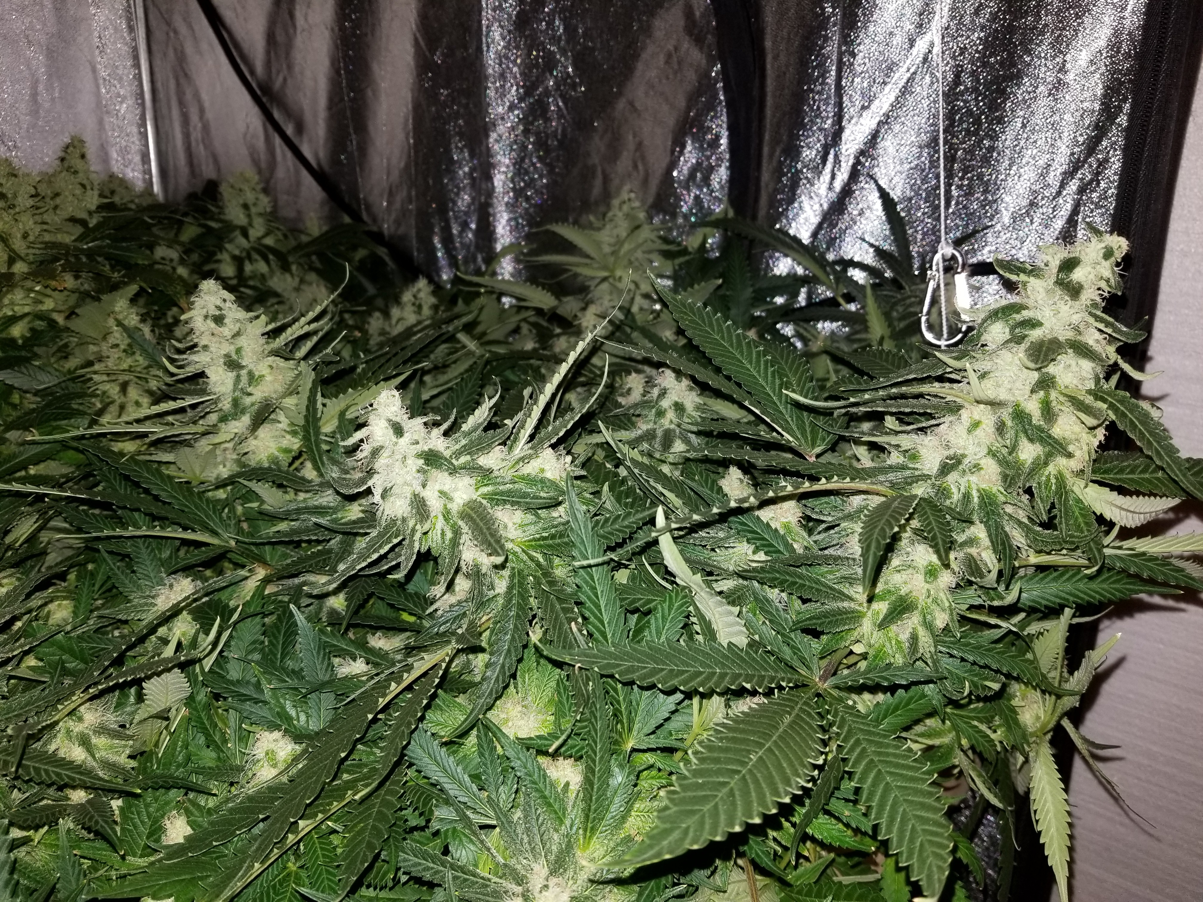 First picture plants in week 6 of bloom in the second are the second round of this grow I just put them into bloom yesterday.Sorry the first is not 6 weeks into bloom its of the same plants I put in yesterday the second has the 6 week plants in it as well as the third but I think thats about 4 weeks into bloom3 Photosnew grow room built summer of 2017 ,argo max tent for veging ,big kahuna reflector, 1000hps with added leds for the full spectrum . 15th indoor grow ,5 years outside gorilla grows(stealth is the key),veg under t5s growing autos under 300w leds