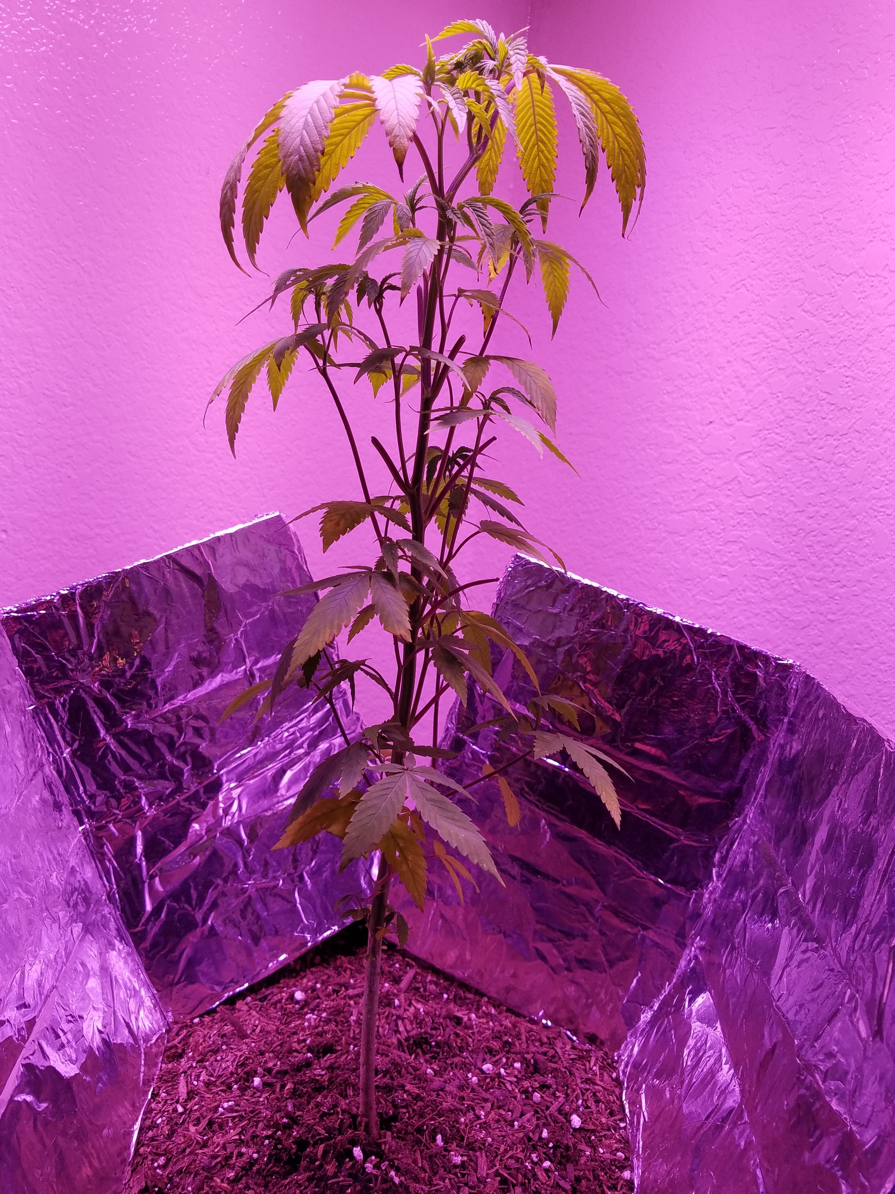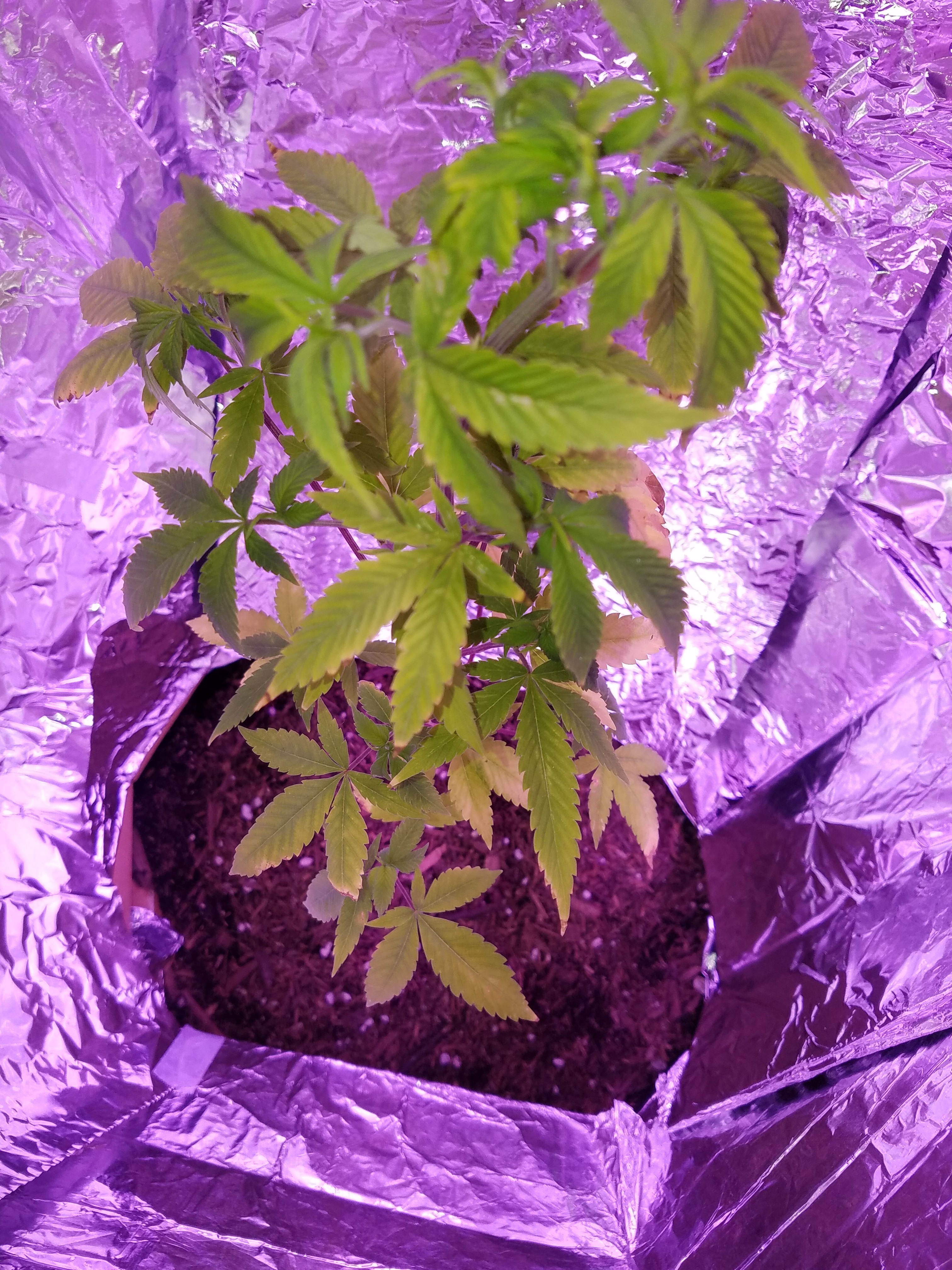 It could've been the cold, it gets pretty chilly at night in the living room and I got a fan going to cycle the air not directly blowing at it but that could be it. I'll try making it warmer but not really too sure how seeing as it sits in the living room. Purple a little on the top leaves I'll take better pics later to show it more. Ph is balanced going In yellow with slightly green and comes out yellow. I did start the cal mag and the older leaves still show a slight deficiency but all new growth looks good. I am a little concerned on the new growth it looks like the claw a little bit.