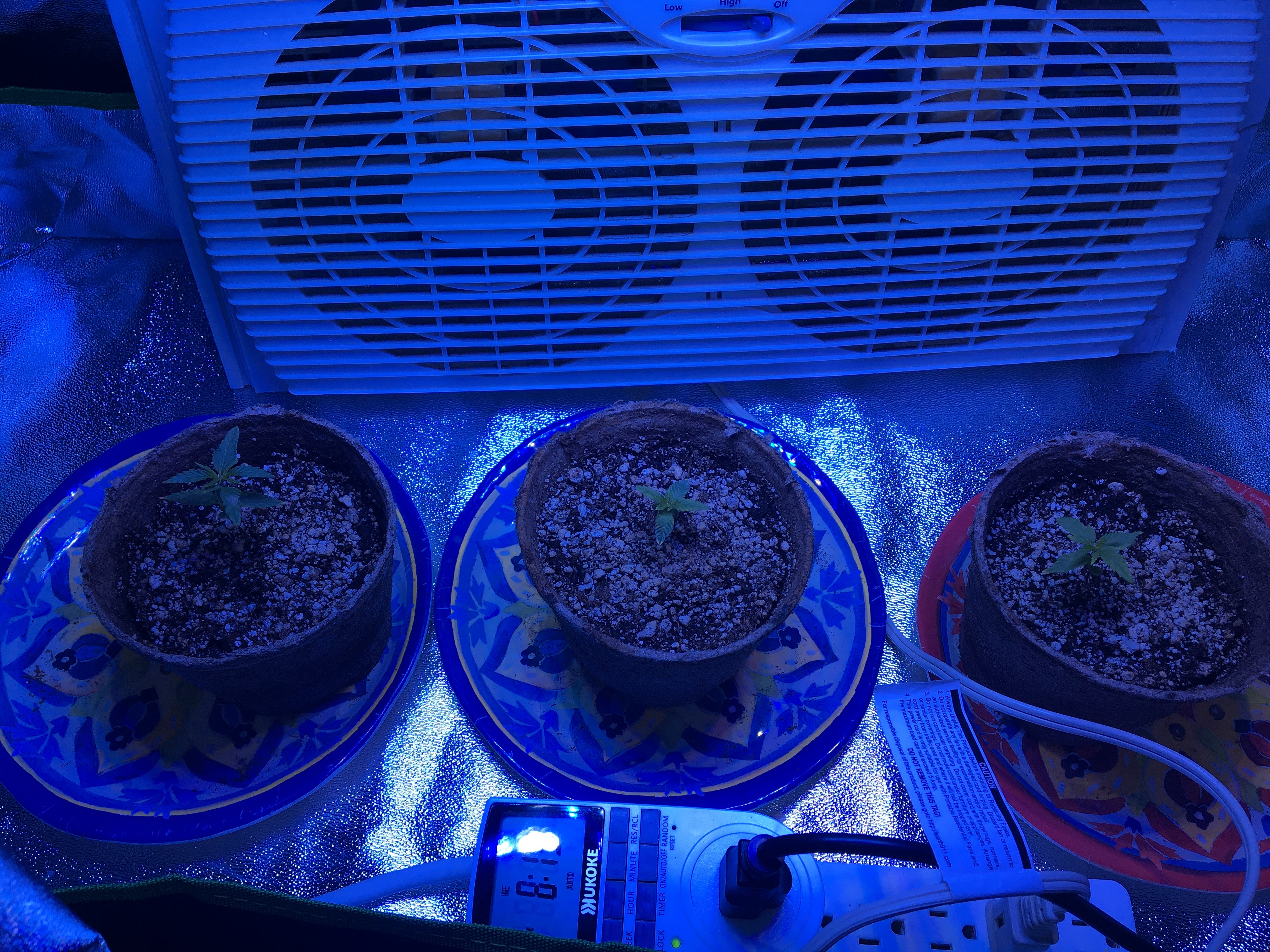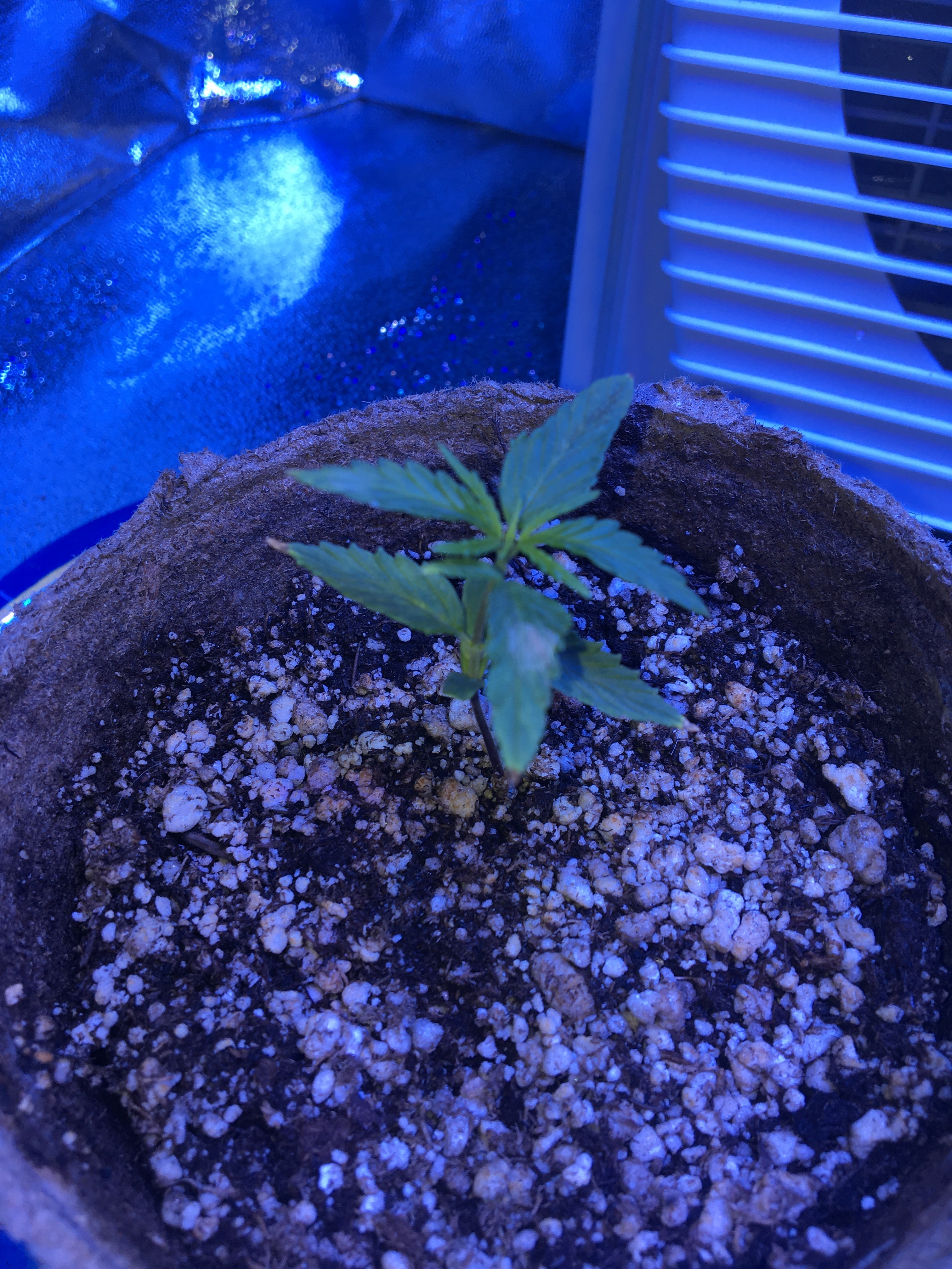 So I just set up my first grow and I am about 14 days in. Looking for advice for where to go from here. I started the seeds in FF Happy frog, they are definitely growing but seem to have a few deficiencies. Up until Monday I added no supplements. they're growing in a tent with a 600W LED light. Monday I added FF nutrients for their first feed. Definitely got some nute burn but flushed them out. I currently have a fan going in the space but not outtake. 2 of the plants had the nutrient burn and those are the ones growing the fastest. Currently the biggest plant has some weird white stuff on the leaves but I can't figure out what it is. The other one growing fast seems to have a nitrogen deficiency as one of the leaves is curved sharp at the end. Last plants growth seems to be stunted. It's my first time doing this and I've done quite a bit of research but am looking for advice to get these things on track. I'm adding some pictures here to hopefully gain insight from you all.