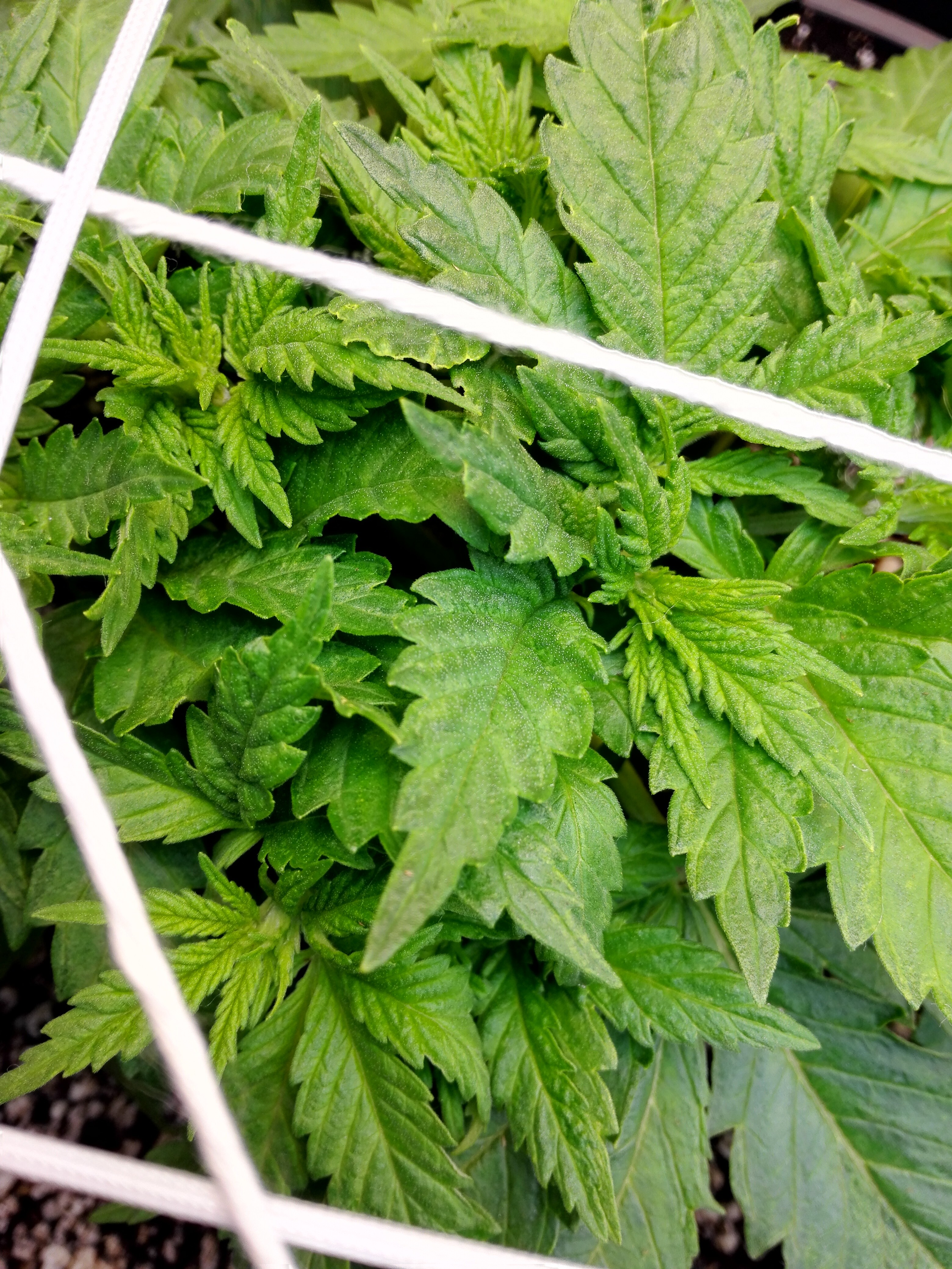 The ScrOG screen had kind of large "squares", and I could not imaging this small plant growing through there efficiently. So what I did was to tie some cotton string all over and in between the net, making more uneven and smaller "squares". Hopefully they will suffice in the long run.