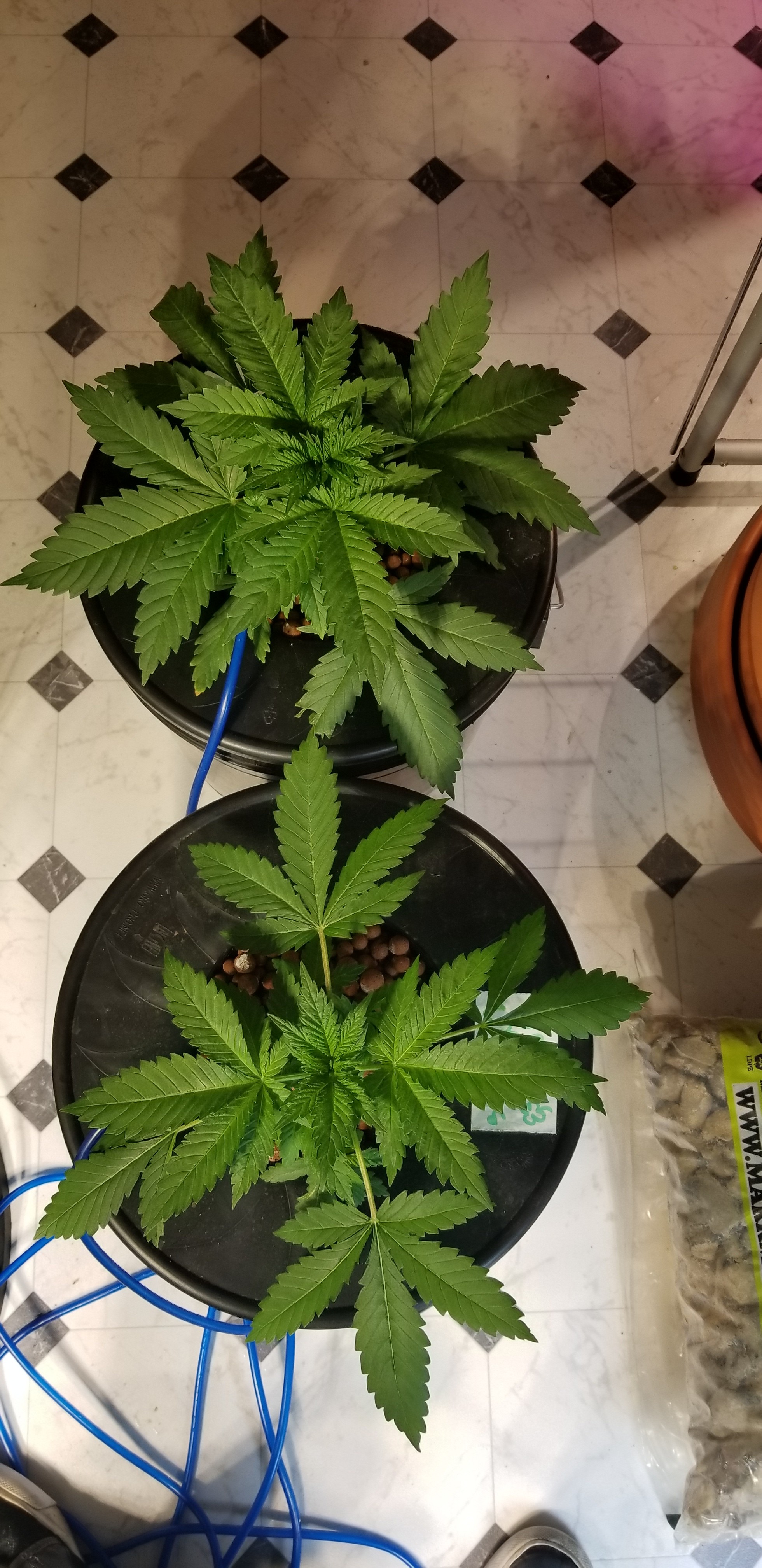 The soil girls are looking better! A little tip burn but doing good and have grown past the second ring on the cage. After the last post about these I brewed some alfalfa meal and kelp meal tea. 2 tbsp each and 24 oz of water, let sit for 24 hours and strain. Added water to the strained liquid to make a gallon. Watered them with half of that and some tap. Waited a day, then watered with the nute solution I had been using, minus 5 ml Buddha grow, plus 15 roots organic HPK. I had taken the soaked kelp/alfalfa meals and soaked them again in 32 oz of water over night and made a foliar spray. I top dressed with earthworm castings and the left over soaked meals and worked it into the top layer of soil. Then watered with the rest of the kelp/alfalfa tea. I removed the worst looking leaves which were well down the branches by now. They need a good hair cut...