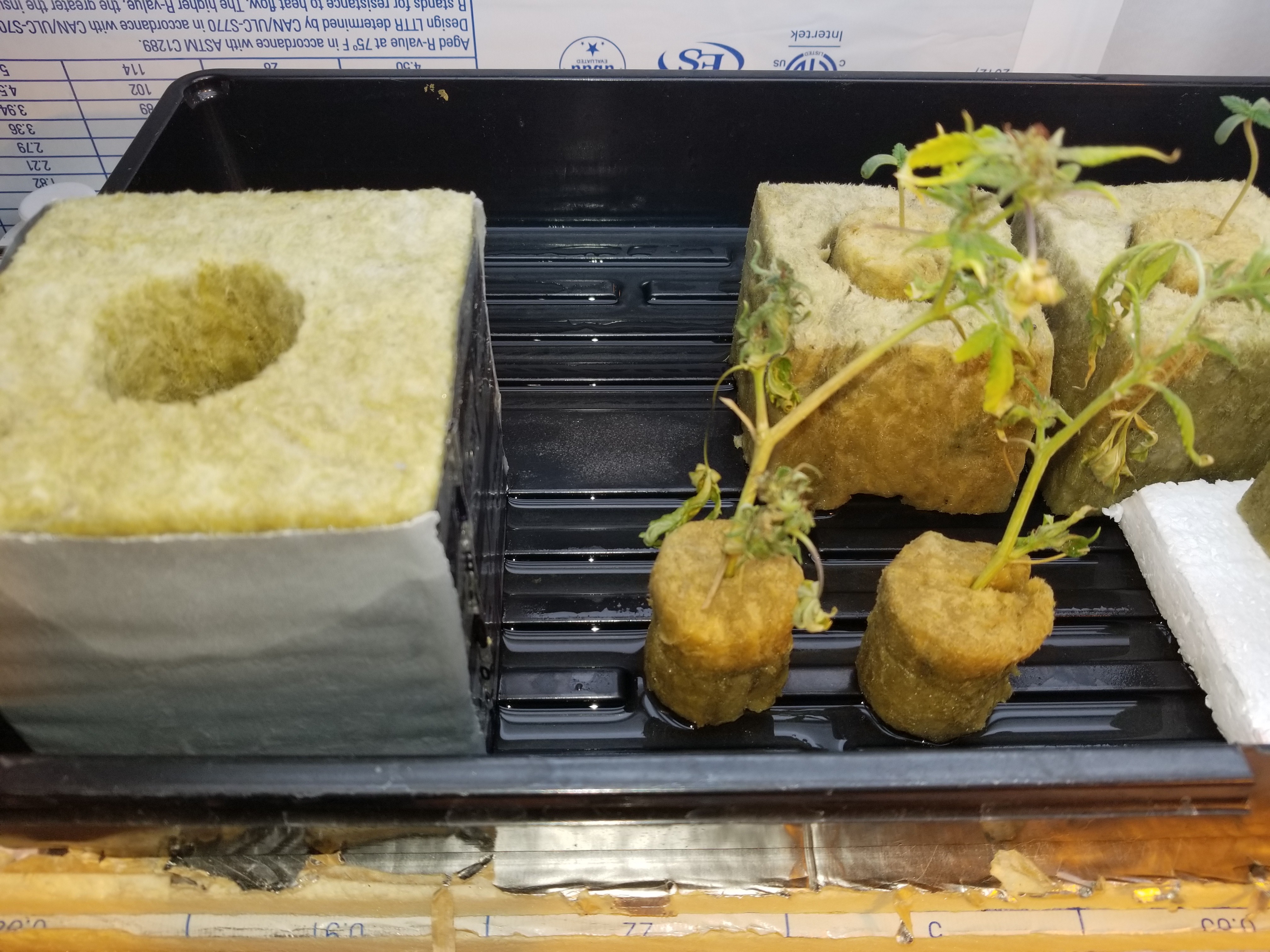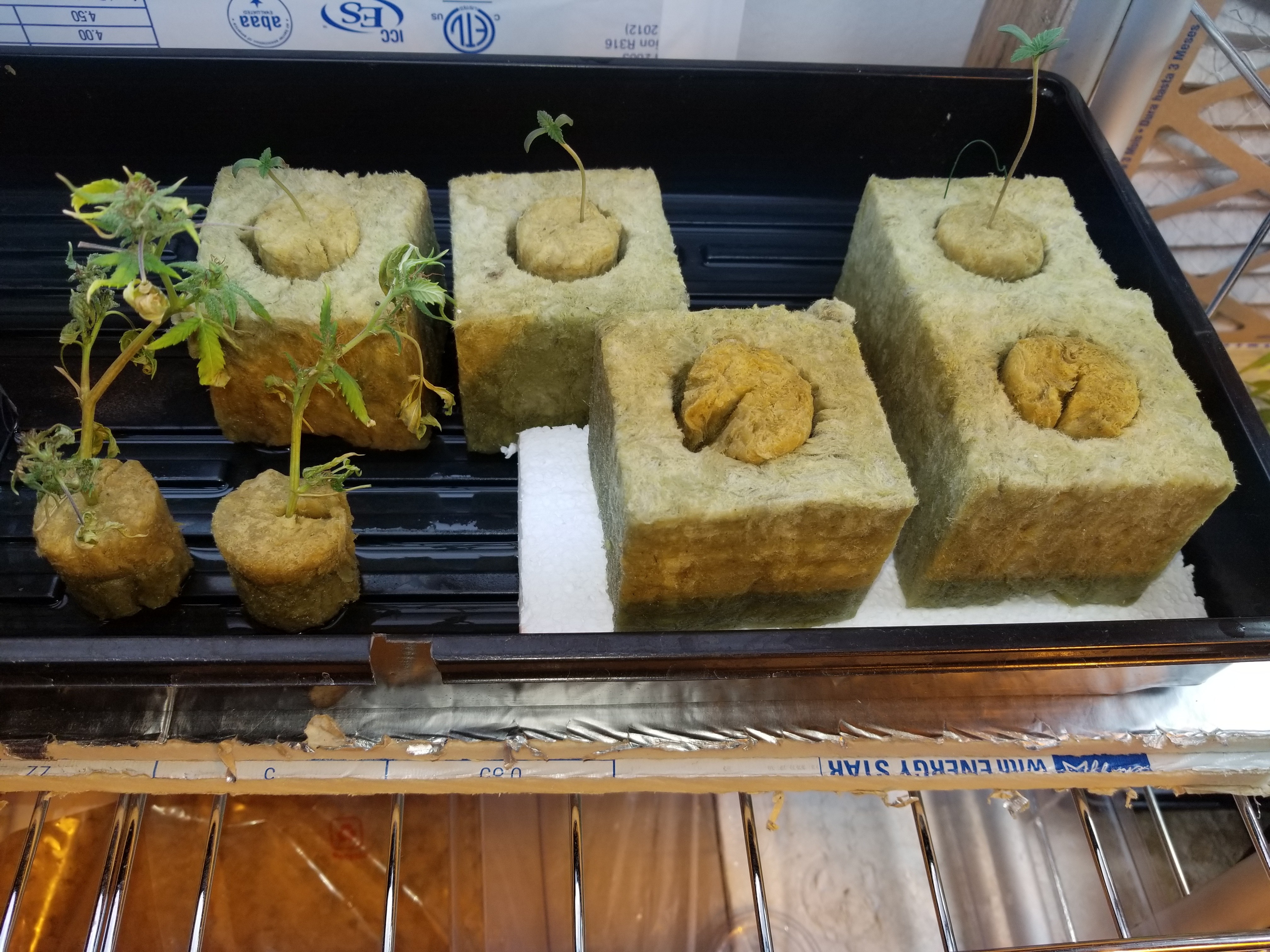 There's still only 2/4 pineapple Express x white widow popped. I can see the root and the hull is open, they just need to start their journey. I also soaked 4 three inch cubes, same solution, and put all the plugs in cubes. Moved two smaller girls under the light with the two soil girls.
