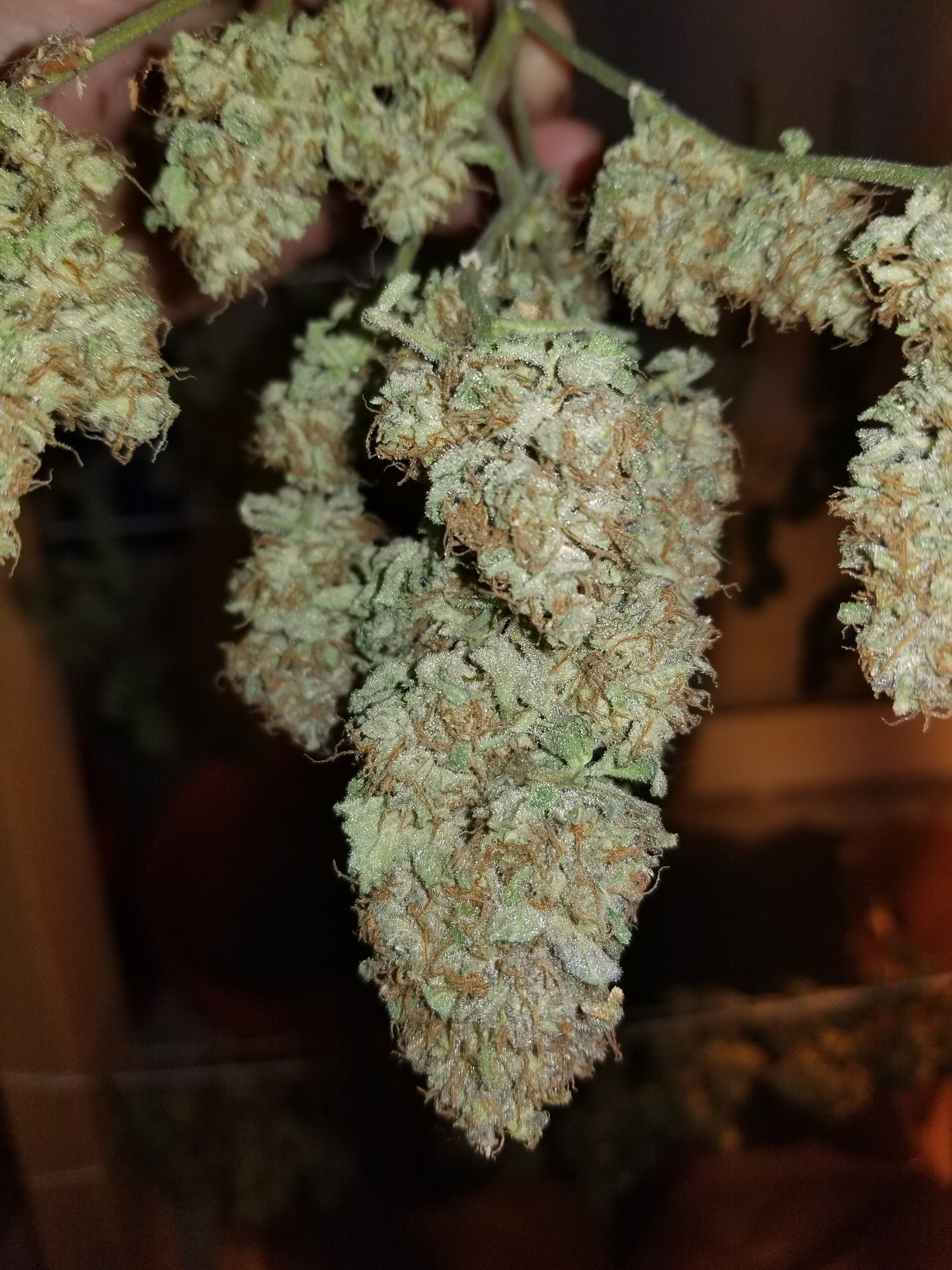Well....my hand is broke thanks to a fellow employee dropping a piece of plywood on my hand. That should make things interesting the next month π I harvested the pineapple Express last week and it's in jars on the cure.