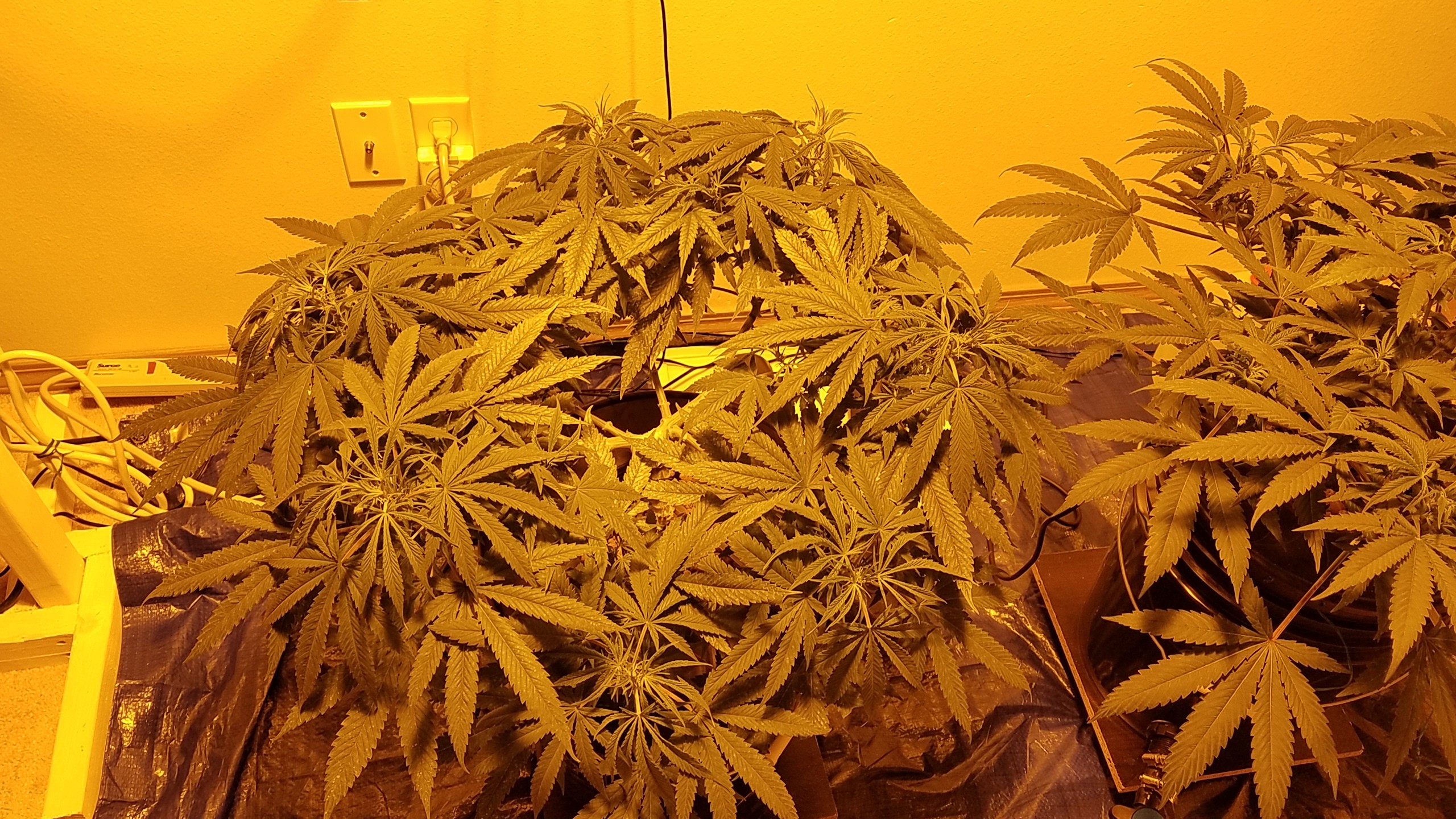 Flipped them to HPS bulbs 12/12 right after Thanksgiving. So like wk6. Notice the taco leaves on the OG Kush? Also can you see the leaf tip curl and burn? Yes, probably too much N for the Kush...