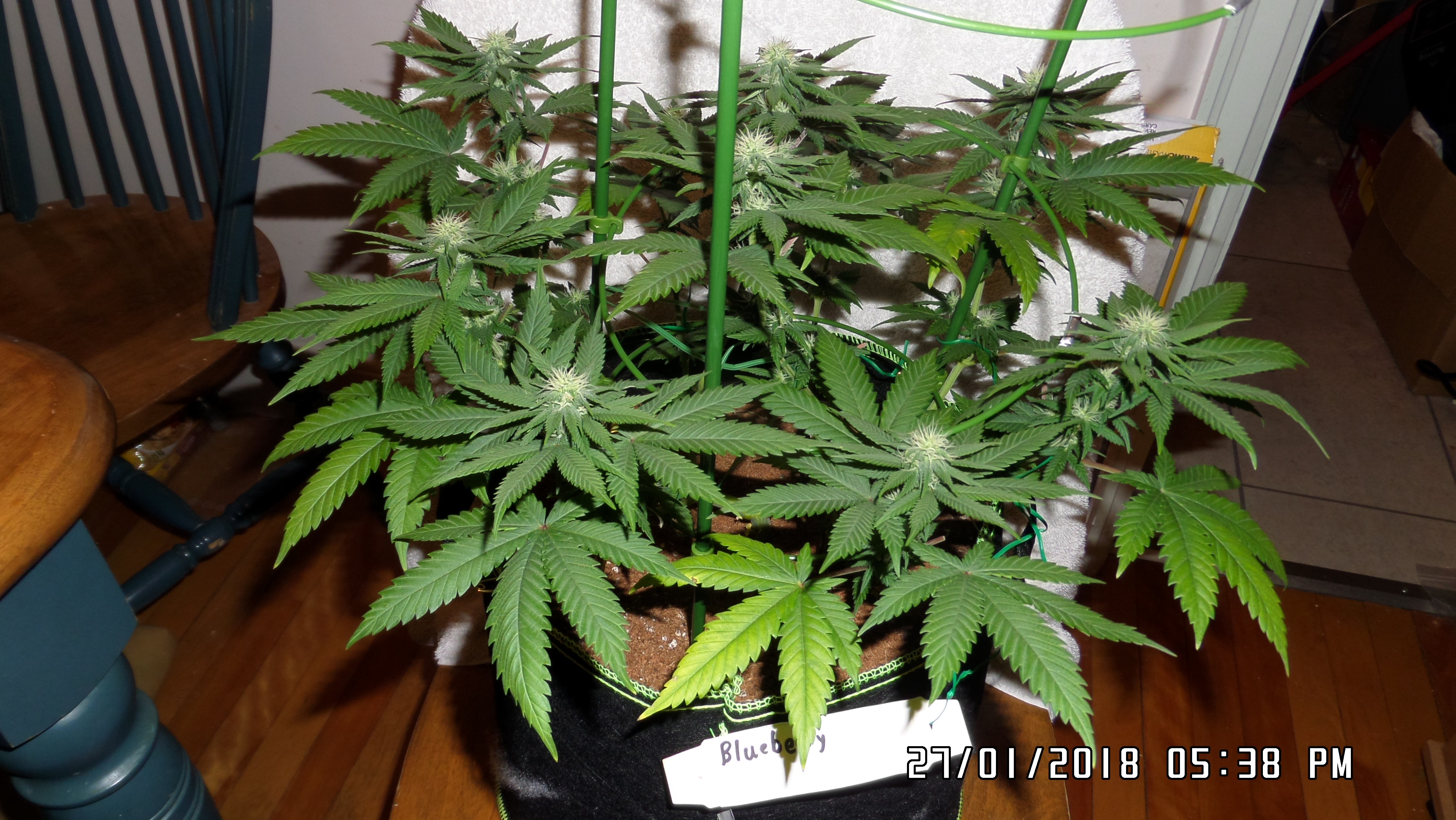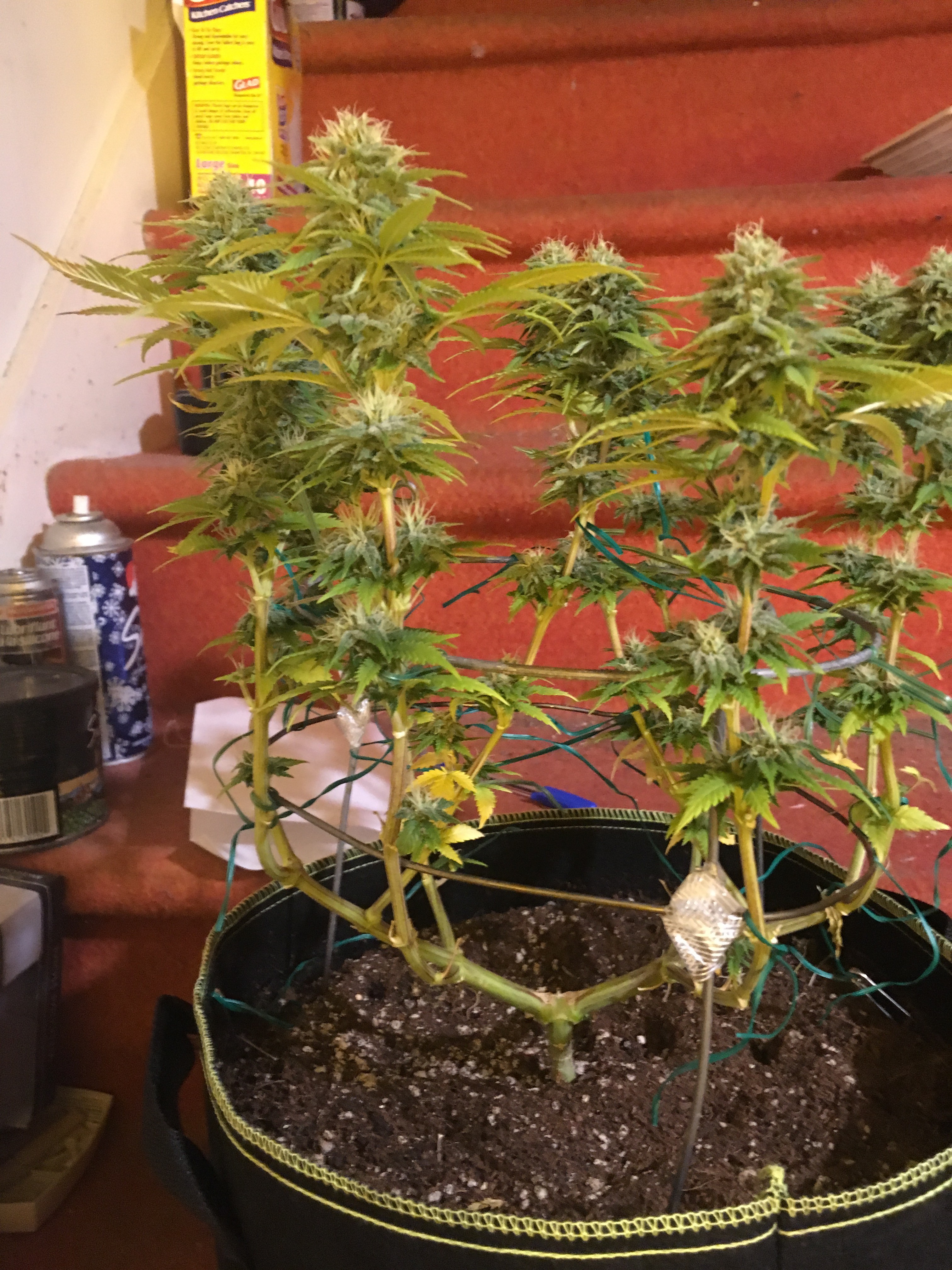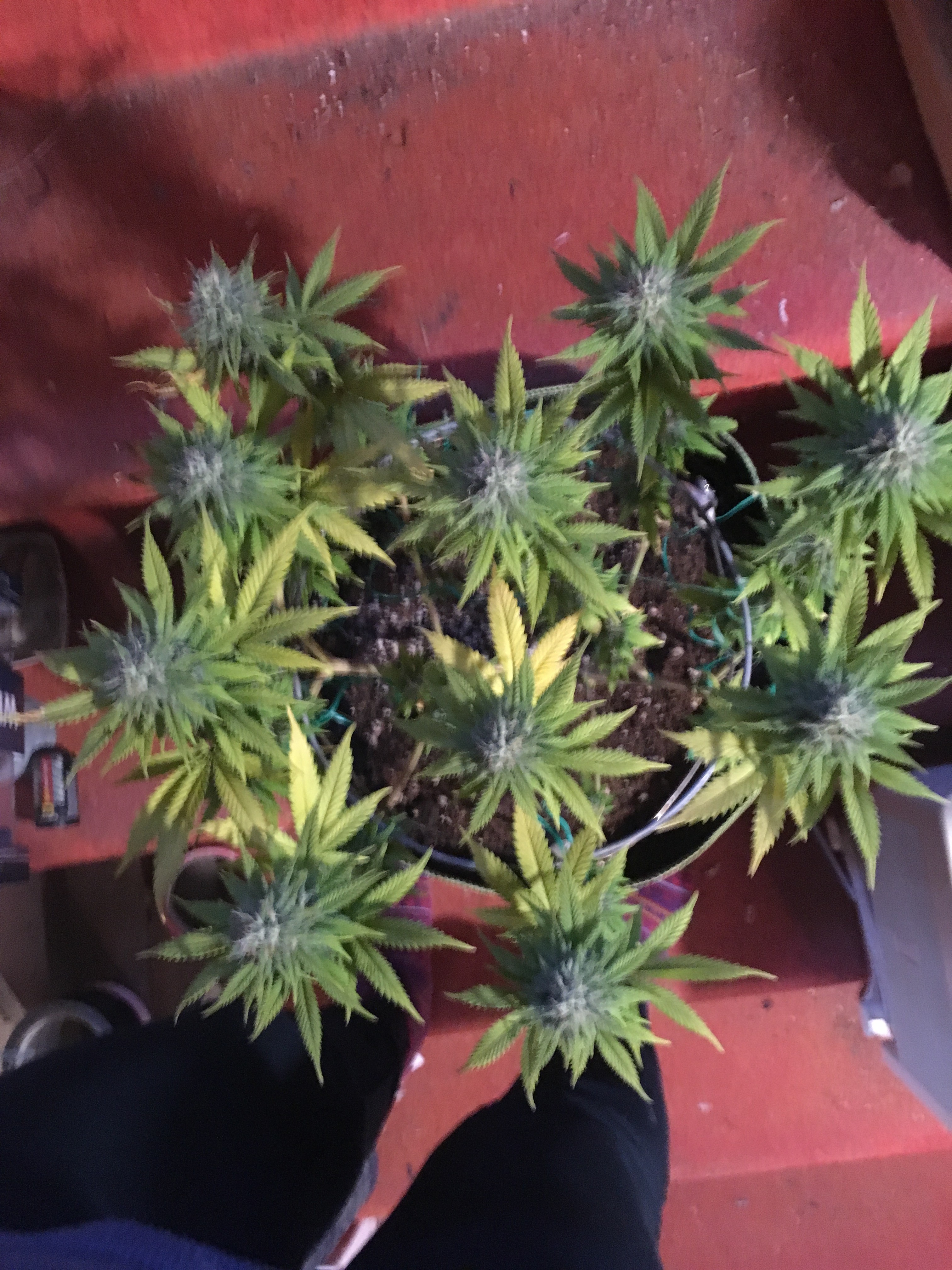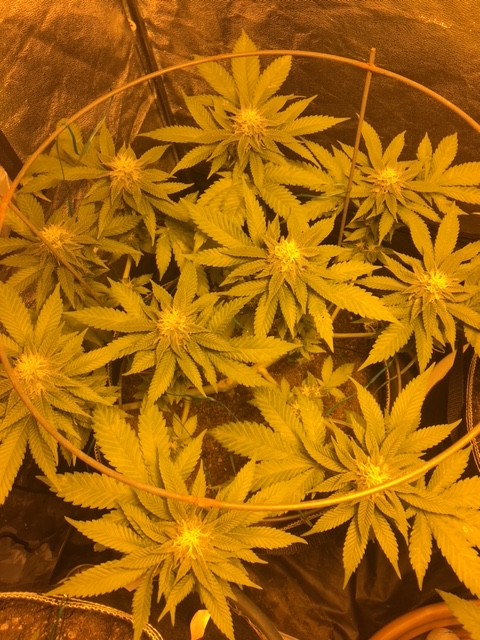 Hi. Another set of photos from today. Taken after some yellow leaves were trimmed, they are watered with liquid seaweed and molasses just after the photos. In my opinion, they seem to be doing ok as the flowers and little leaves all look robust, but I would appreciate the opinions of those experienced. They are now at 46 days after switch to flowering. we trimmed aggressively compared to other grow journals I see, and then have been losing yellow leaves. will see how it ends up. would anyone offer opinions as to probable harvest timing? I know there's lots of variables, but just guessing. I think I will have her leave a couple of branches on each for extended to try the different effect it is supposed to cause. Flowers don't look as big as i hoped, but many variables this first grow happened. Still really happy, especially considering the great care they have gotten by their adopted parent. If I'm putting up too many photos, please someone let me know. it only takes a minute now, so i have a lot. I get to see them in person this weekend.A happy Canuk. this grow will be using Flora Flex nutrients in coco/perlite. 9 plants in 3 by 3 tent and 8 plants in 2 by 4, in 1 or 2 gallon pots (whatevere is there). manual fertigation planned. veg till around 1 ft high. 2 by 4 tent light is Bloom Plus 2500 and 3 by 3 tent has Mar Hydro Ts3000, both of which seem awesome.