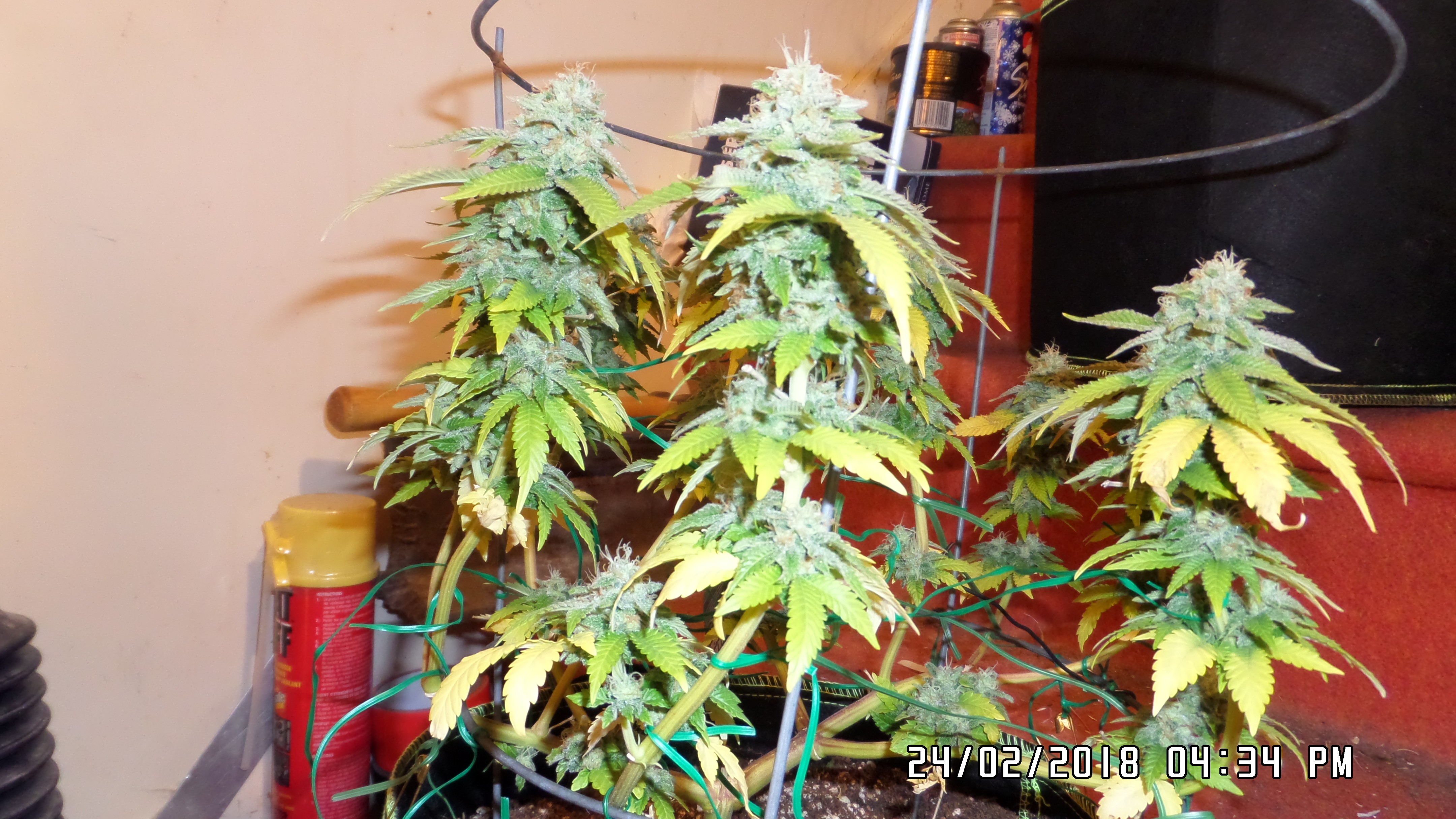 more photos. Now that i have seen them in person, the ladies are smaller than I thought. and there are a lot of yellow amongst the leave remaining - which is fairly concerning. Hopefully there is enough green stuff to finish the buds off. First time for me at all, and I find them fascinating to see, smell and touch (only a bit). the trichromes are very pretty under the magnifier. I am surprised how brittle feeling the buds are, since photos make them look soft. There seems to be some density to the buds, and even if each one is decent , there should be a nice yield. We have decided we will go with what DingusKhan mentioned and even leave 1/3 to a later harvest to sample different effects. Might as well get as much experimenting as possible. I played with the lighting levels to try to get max on the plants. with current basement temperatures, I can keep the 600 W HPS at 50% along with the 300W LED, and the tent temp goes to almost 76. The tent is small, so I cannot get the LED evenly directed at all the plants (considering it the supplement, and the HPS primary light) but it is hitting them all. I am leaving again tonight for a month, so the harvest is now in the hands of my wife. She is a very precise listener, so I bet she really will do well. Wish I was around for the curing. I was only going to add blackstrap molasses from now on, thinking the seaweed and other bloom stuff could affect taste, but with the lack of leaves left, there might not be much growing left. Could be a sample to show people what can happen with enthused defoliation. I think the pictures are 1 blueberry, 2 white rhino, 3 critical widow, and 4 cinderella 99.A happy Canuk. this grow will be using Flora Flex nutrients in coco/perlite. 9 plants in 3 by 3 tent and 8 plants in 2 by 4, in 1 or 2 gallon pots (whatevere is there). manual fertigation planned. veg till around 1 ft high. 2 by 4 tent light is Bloom Plus 2500 and 3 by 3 tent has Mar Hydro Ts3000, both of which seem awesome.