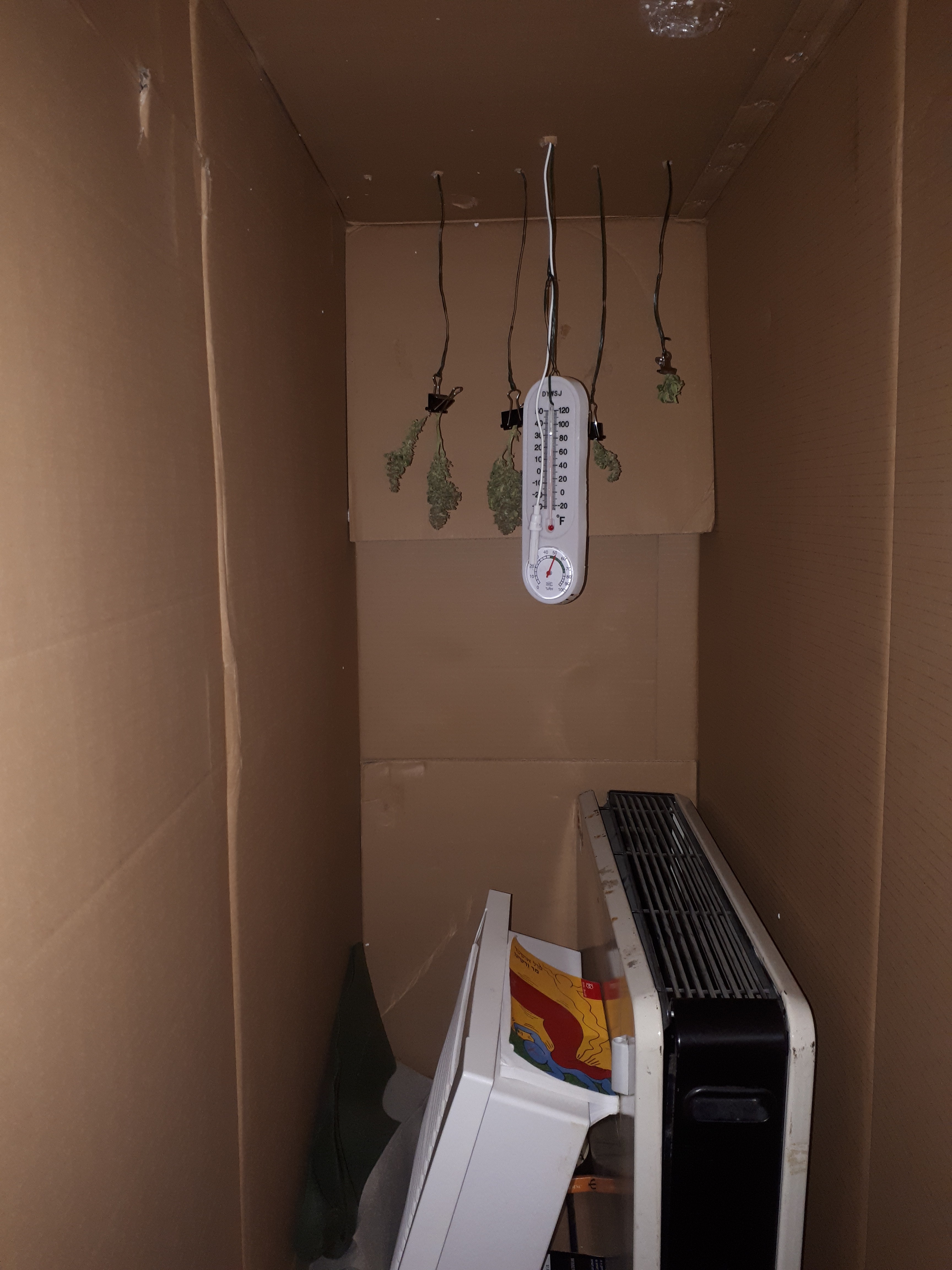 i hanged the the cut buds in a drying box with a heater (that just heat not pushing hot air..) on it lowest level, and added a fan that pushed the air aginst the wall of the drying box. and hanged the buds from the top of the box. the temp is 19-25 Celsius and the humidity 50-65...