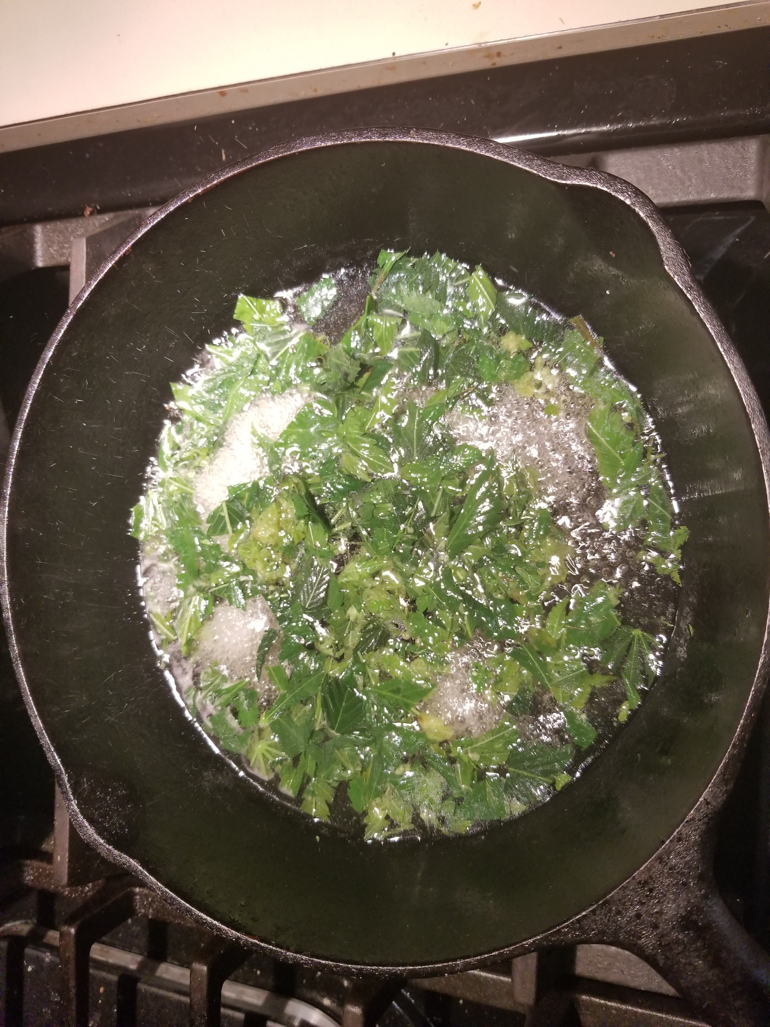 I cooked up a "small bunch" of leaves this morning. A very little water in the pan and a lil pinch of coconut or olive oil, butter, whatever, but you want that oil in there.