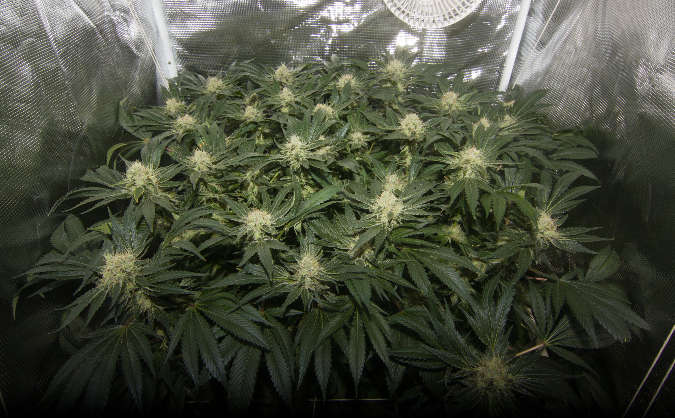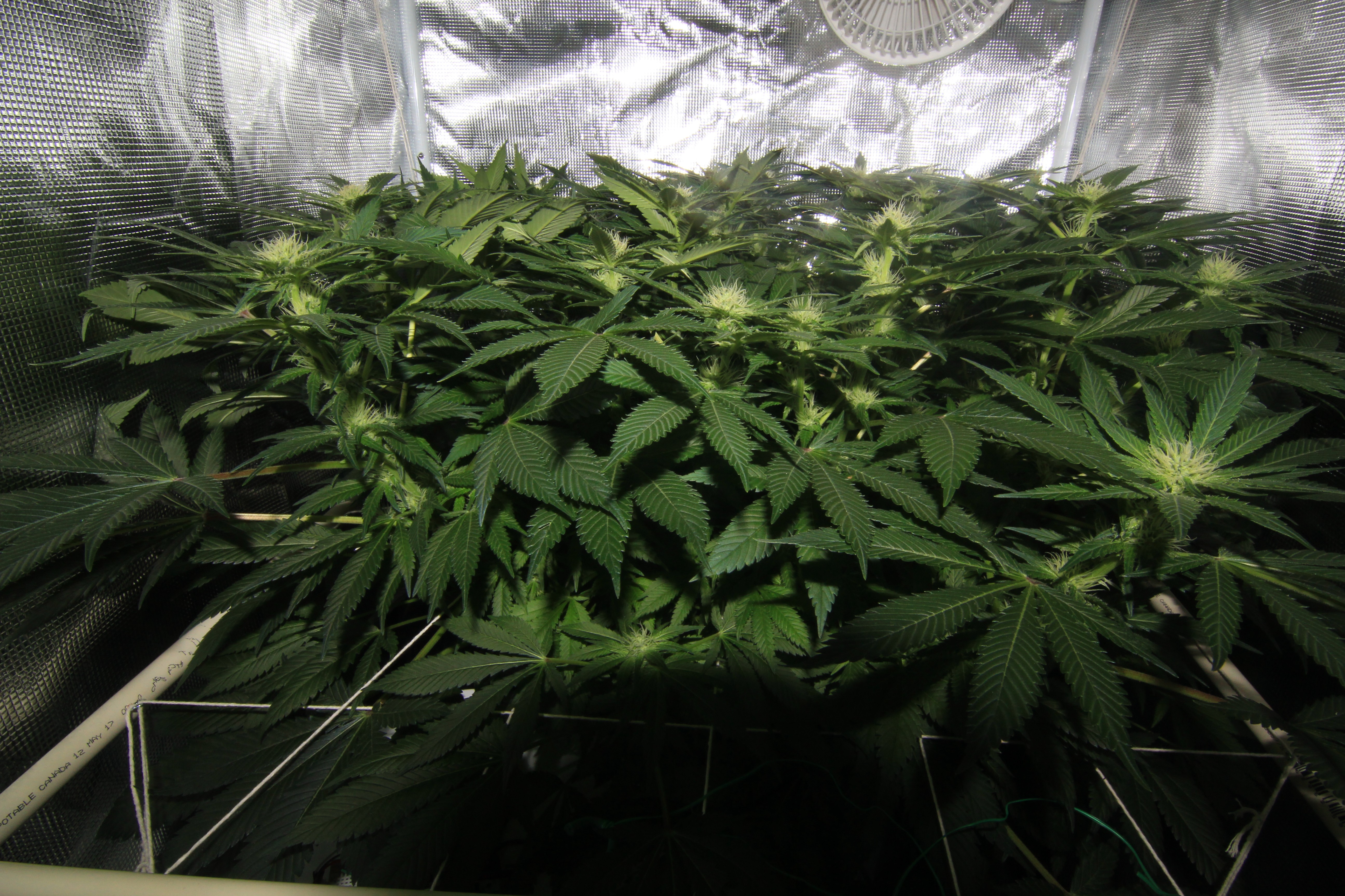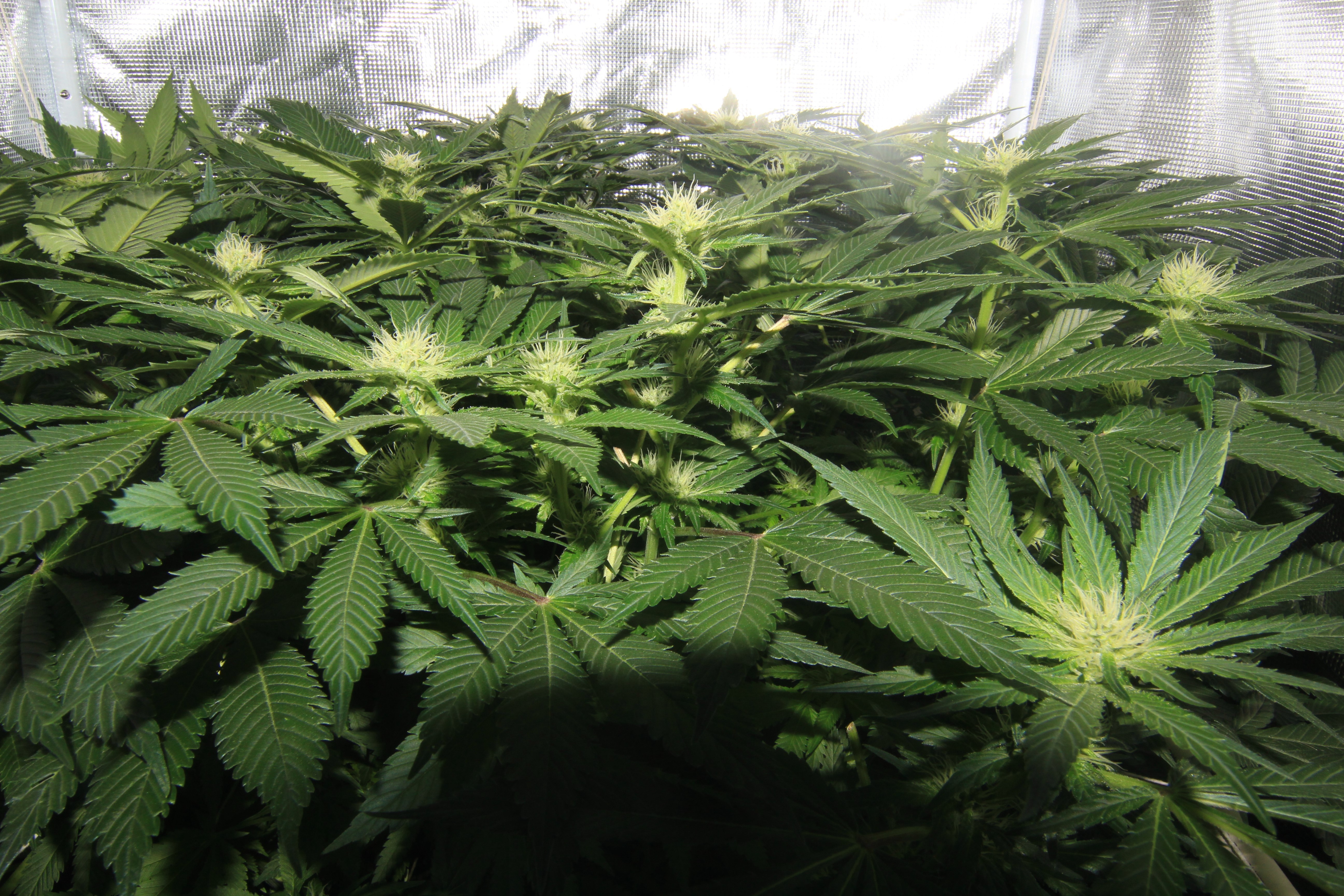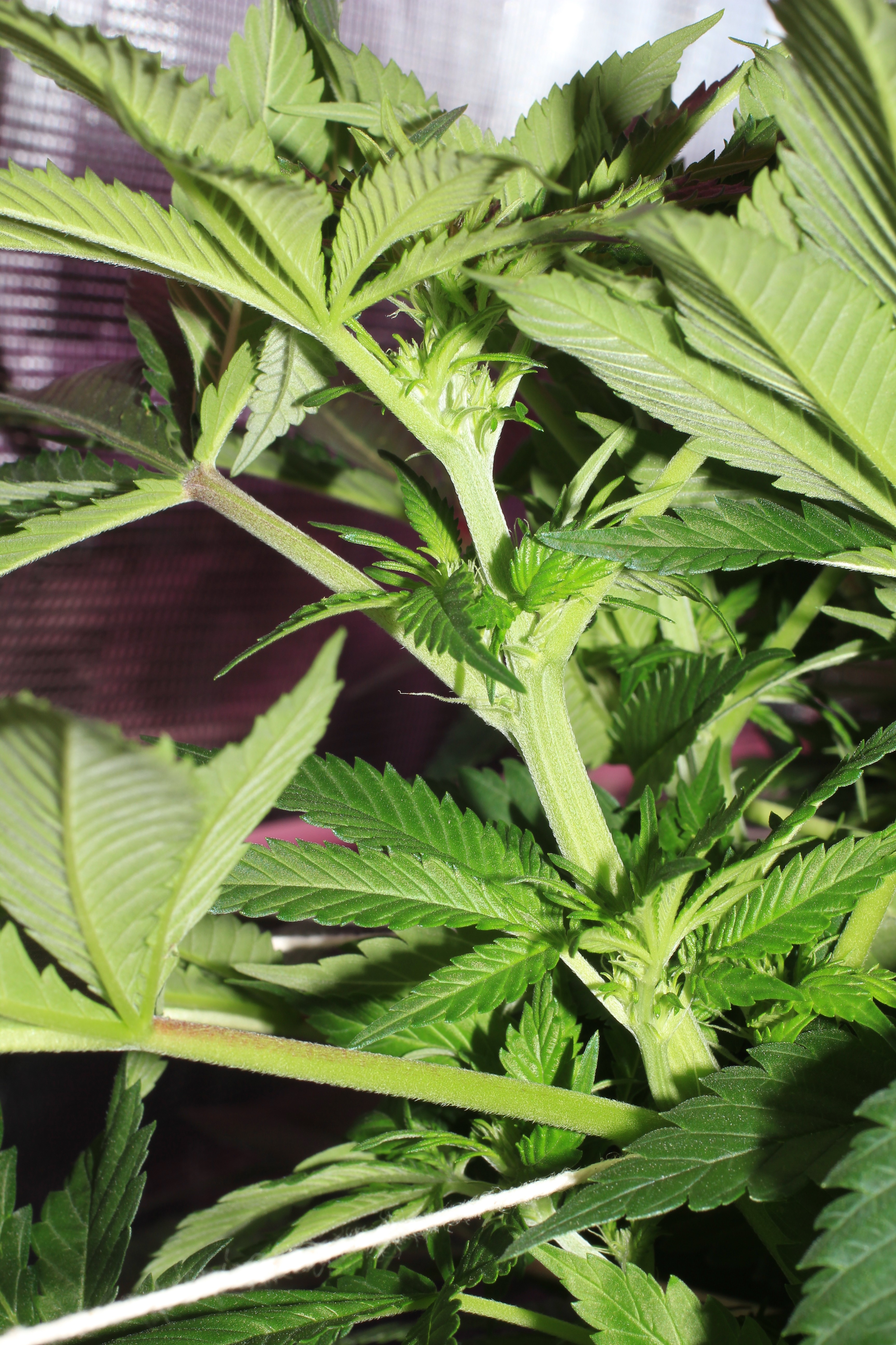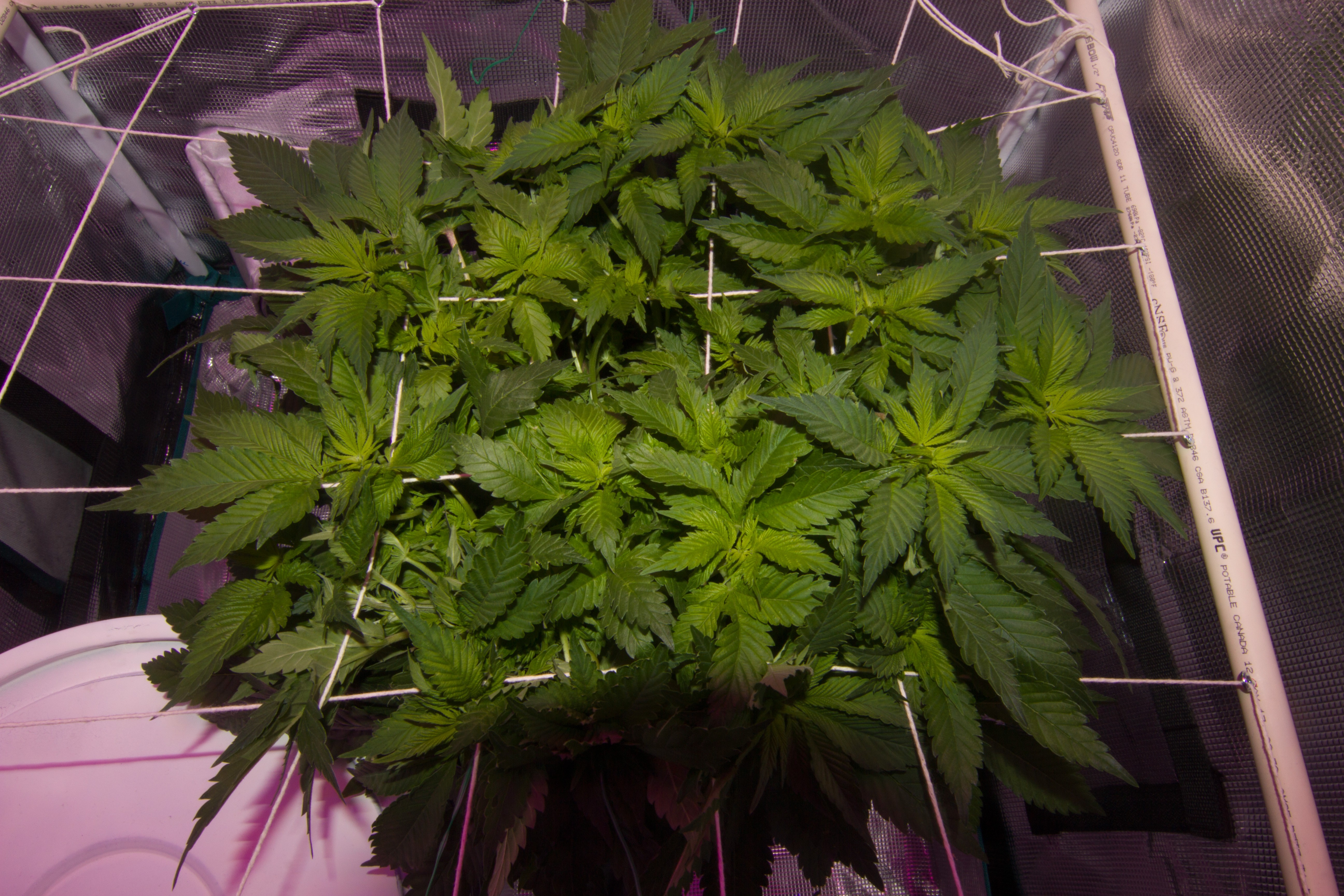 It looks like the stretching may have finally slowed down almost completely. It stretched up to over double its height, even despite all the scrogging! I did a bit more defoliation in the past few days to try and free up the bud sites for light, now that they're showing themselves.