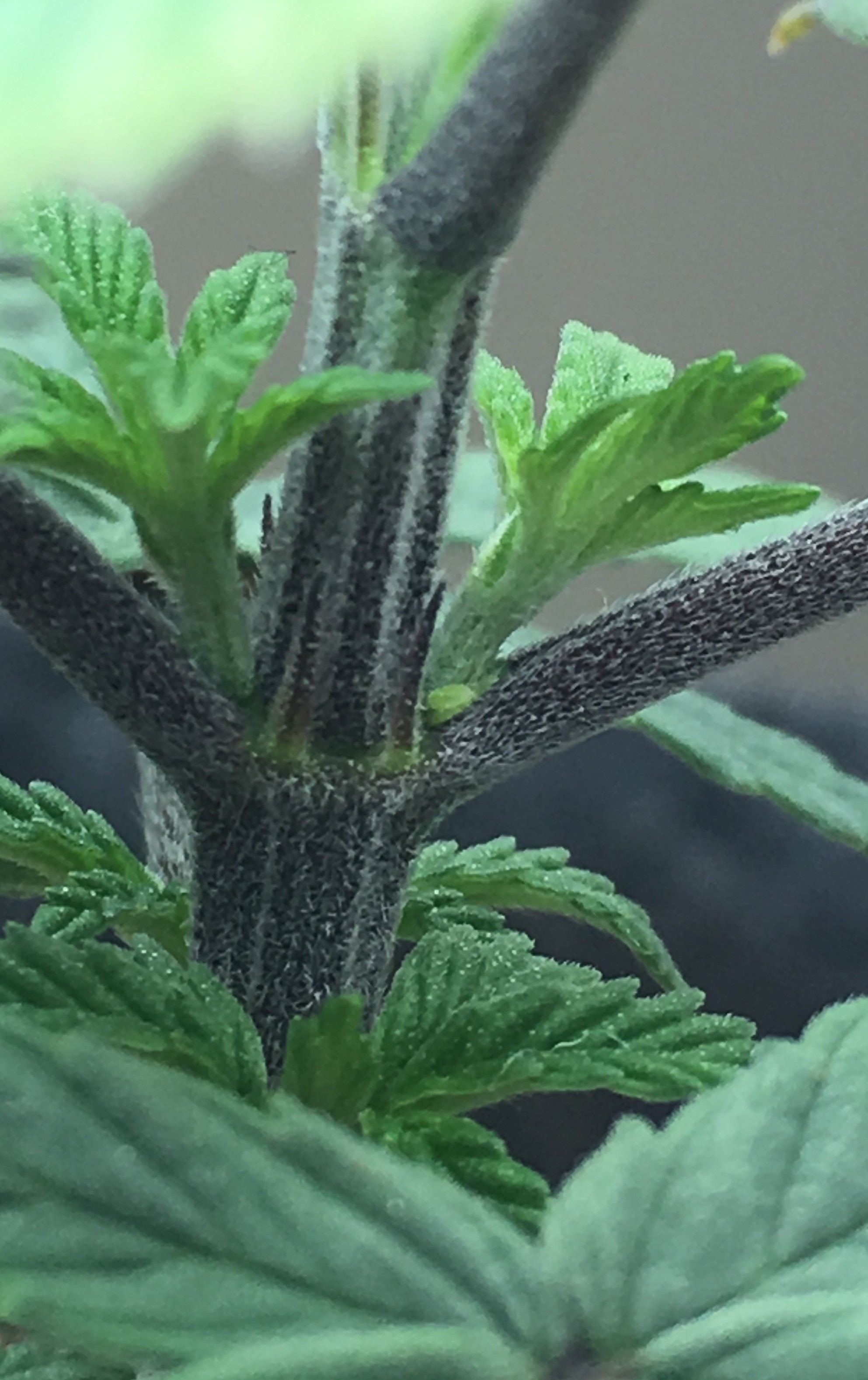 The pictures I've included were taken a bit more than 2 weeks after the initial cotyledon leaves sprouted out of the soil. As you can see, the stems, veins, and undersides of the leaves are all a beautiful deeppurple color- I'm hoping this is a genetic trait, as it seems to be universal among all of the plant's growths. The edges are also slightly tinged a dark purple, which I initially thought to be nute burn, but it also seems to be universal among all the foliage and the plant seems happy regardless.
