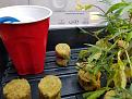 3/23 I mixed a 1000 EC solution from 5 ml each of A and B grow/ 1 gallon. Added 16 oz of it to the bucket to bring the EC up to 850 from 525. Slight curl to one side of a lower leaf. I'm guessing too high pH, I read this strain can be picky about pH and high temps. No problem there since my grow environment is very stable.