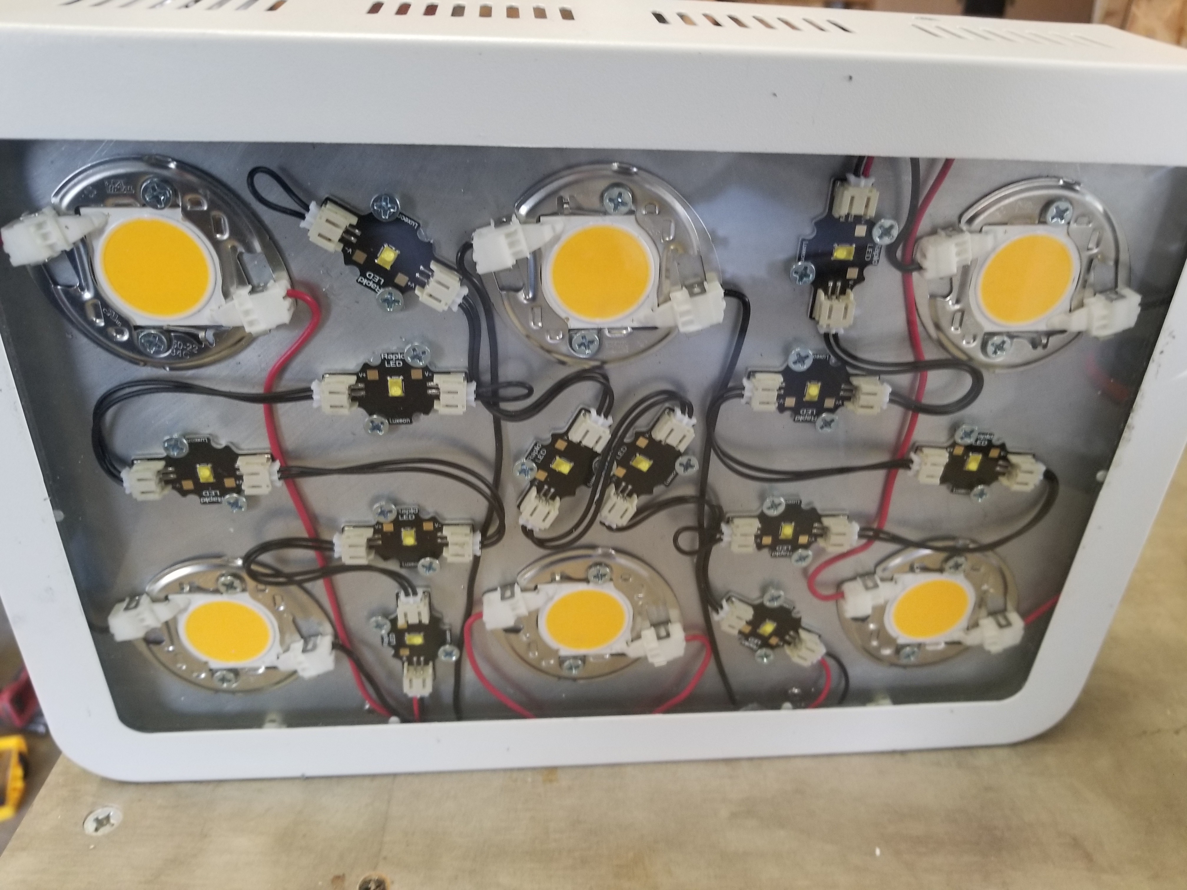 Second light is finished. 4 cree cxb 36 V 3070s 35k, 10 luxeon 3 V 65k. It's running @ 665 mA, pulling about 110 watts. Luminous flux is about 22200 x .014= PPF 311 /110 watts =2.8umol a watt. Am I correct DrPhoton