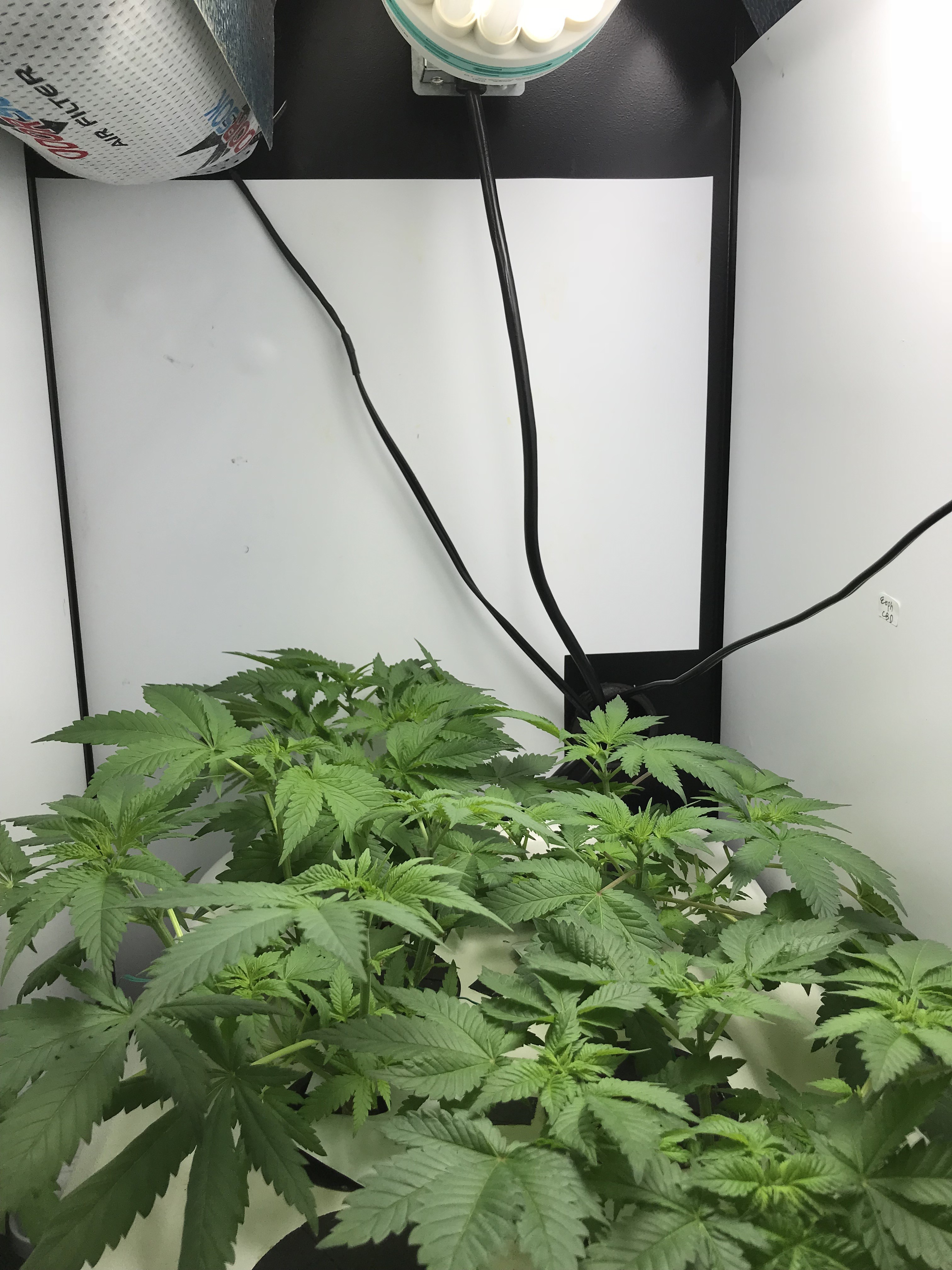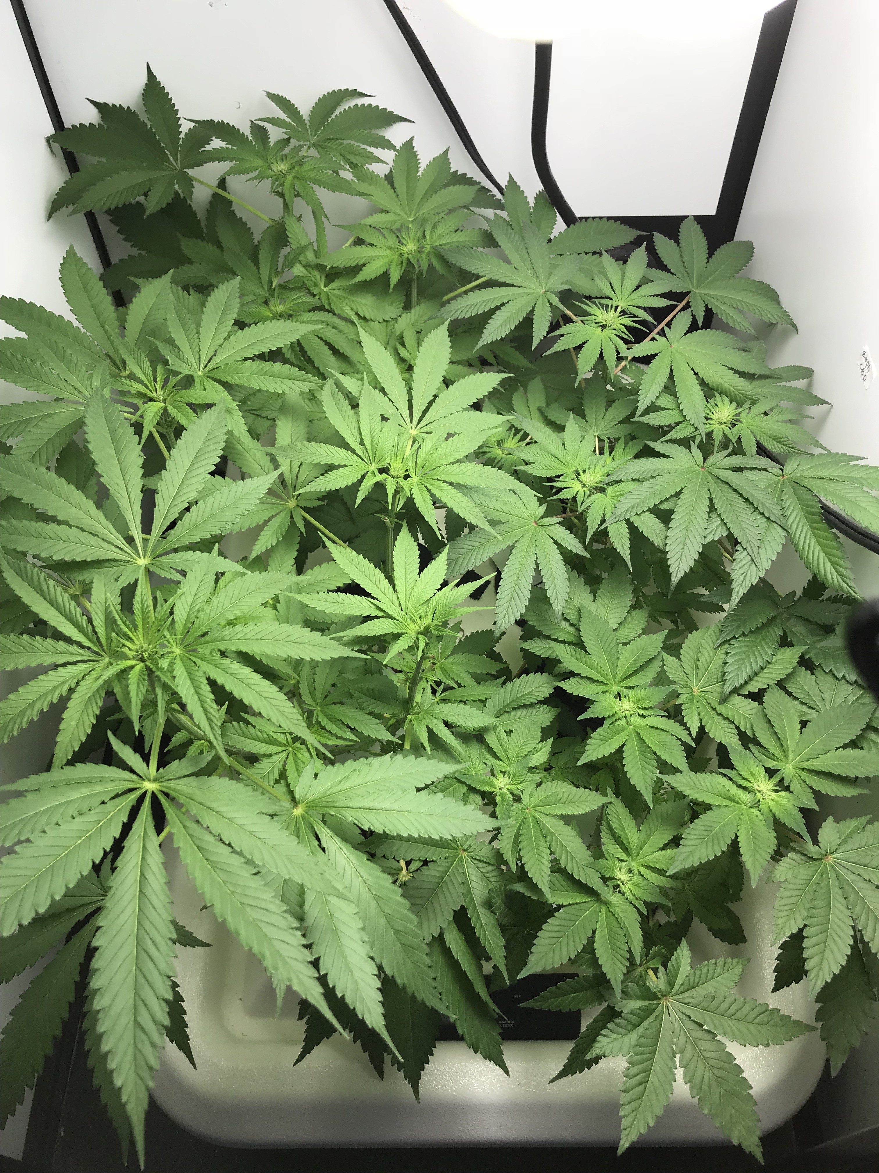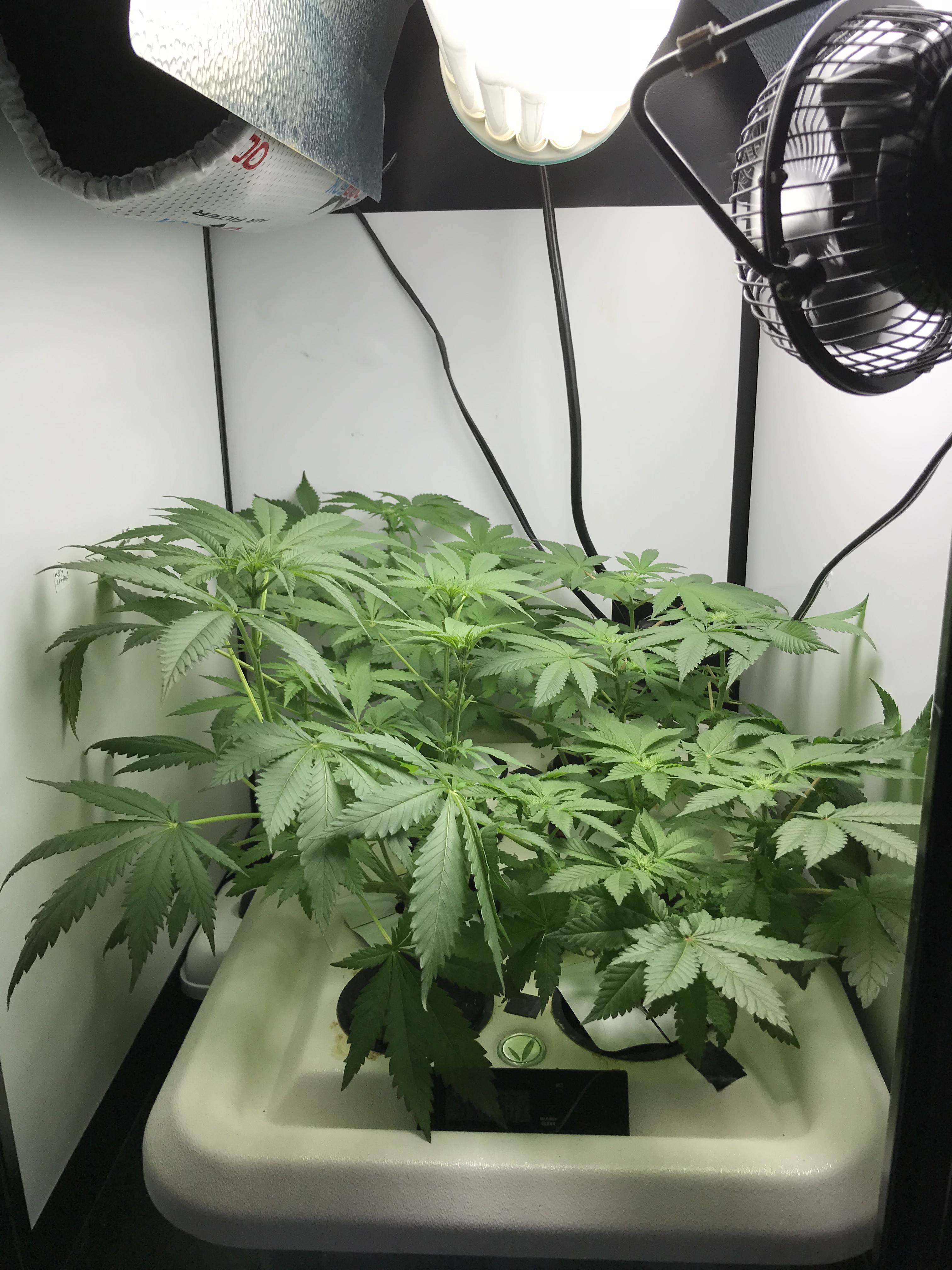 The girls are in week 1 of flower after 30 hours of darkness. Using Advanced Nutrients. This is the small grow box with a 200 watt CFL. The stretch is on!