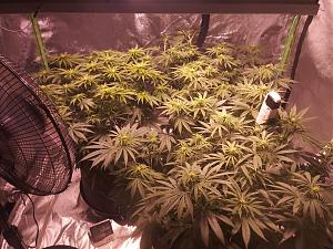 Stretch slowed down and we're working on some bud formation here. Debating on taking off some lower skinny branches to promote more growth to the mains. But they're so full of life and budlets I'll probably just keep them. De worked and tent is gnat free...for now. Everyone's plants look great and can't wait to see some trichs now 😆. ✌