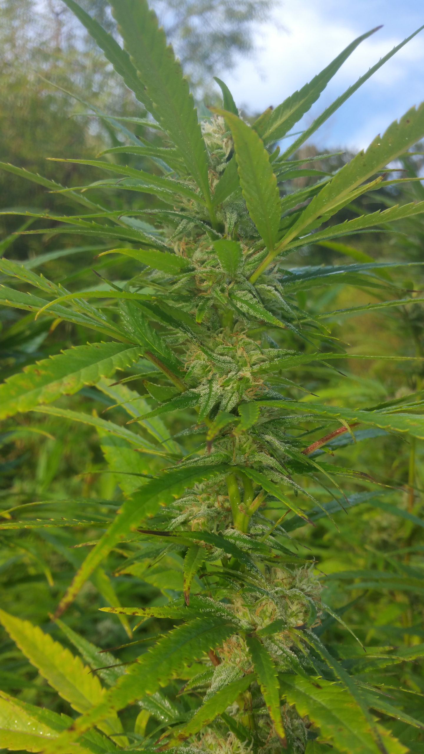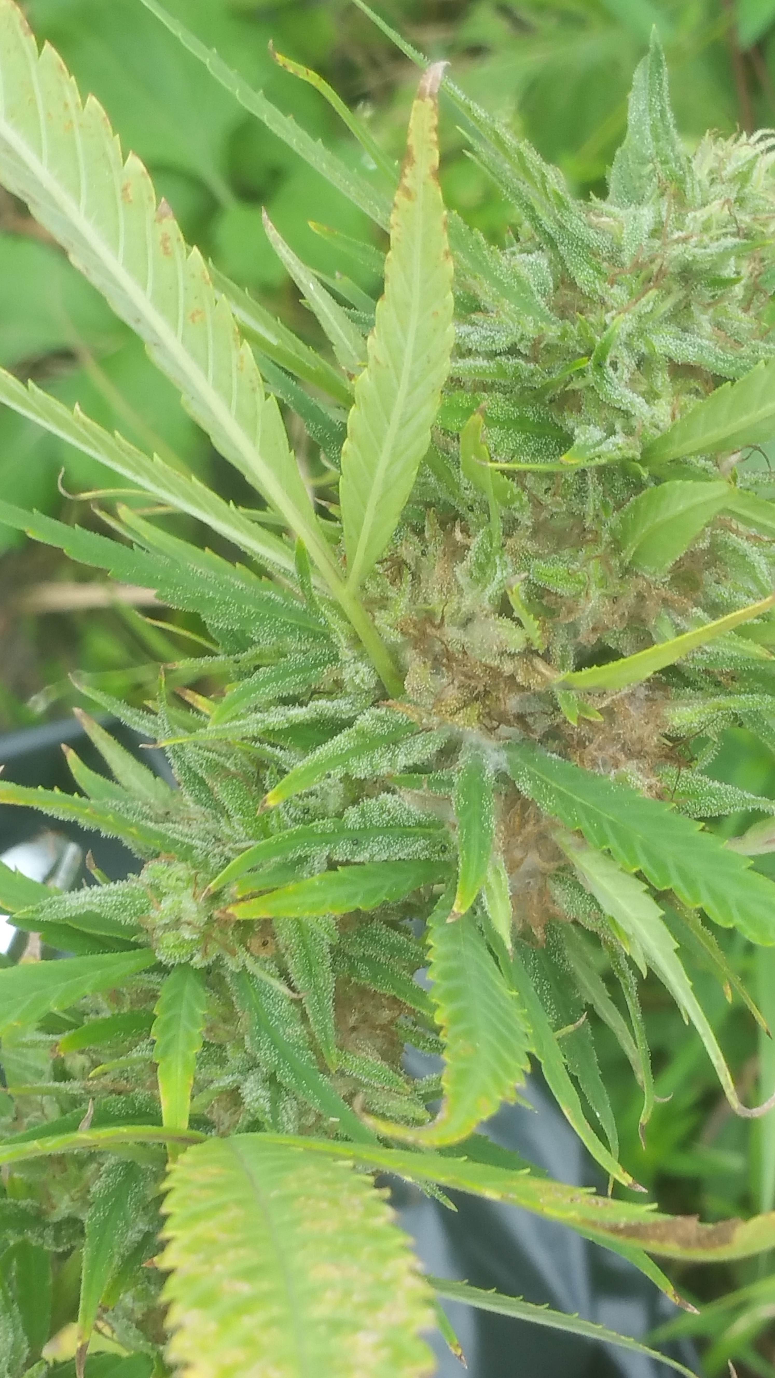 whelp just went to check on them before the rain storm hits... got giant buds... an giant bud rot.. smfh..... on almost every single bud now... the grey death has struck... except... 1 plant that still doesn't have any.. not even 1 spot.... yet.. knock on wood.... the tangerine kush by exotic...the tallest one smallest buds so far but she started budding later then the rest an pretty sure the more sativa dominant then the rest.. tallest bud is atleast 10 ft up...an u can see right thru her she's not very bushy... maybe she's a more mold resistant strain... she's pretty far from the rest ofem to so hopefully it doesn't spread... all my eggs in one boat now... oh well will see how this one lone survivor does...