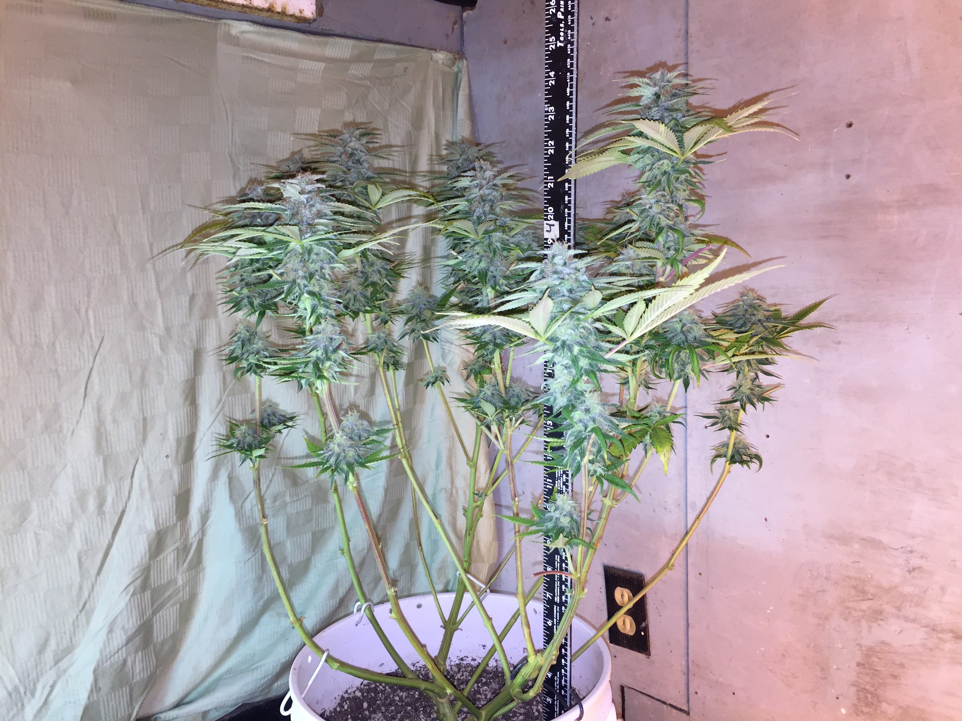 Exploring plant training techniques, this time it's Manifolding with an early Flip. At Flip, looking downover her, she didn't even cover all the dirt on the bucket with her leaves. But she filled out nicely, a testament to manifolding.