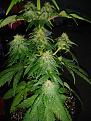 This is my first grow using cfl for it got 2 32 w 3500k cfls 3 23w 2700kcfls and 1 13 w 2700k cfl thinking about adding a 19 watt led shop light i use bcuzz nutes pk 13 14 and bloom im 28 days in to flower how does she look?