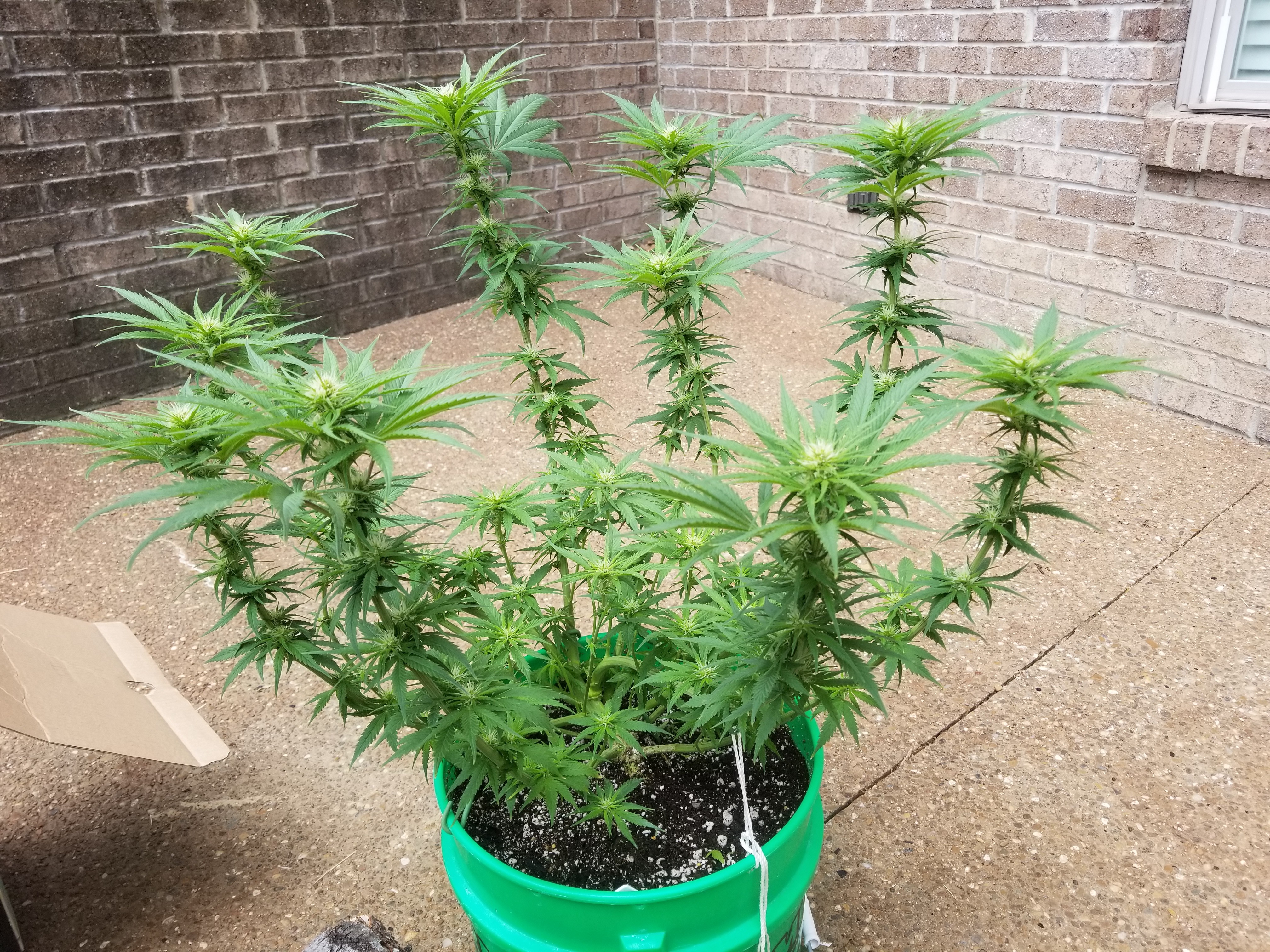 Oh yea, nothing like natural light to bring out the true colors of a plant. I agree, she's looking good n healthy. Good spacing between nodes too. On your next growth I would recommend perhaps using a trellis or more aggressive LST to help bend those outer colas down a bit more so that the smaller inner colas can catch up so you'd have a more even canopy. That way all your buds have a better chance of getting some even light penetration. Enjoy the rest of the growth. Great job.