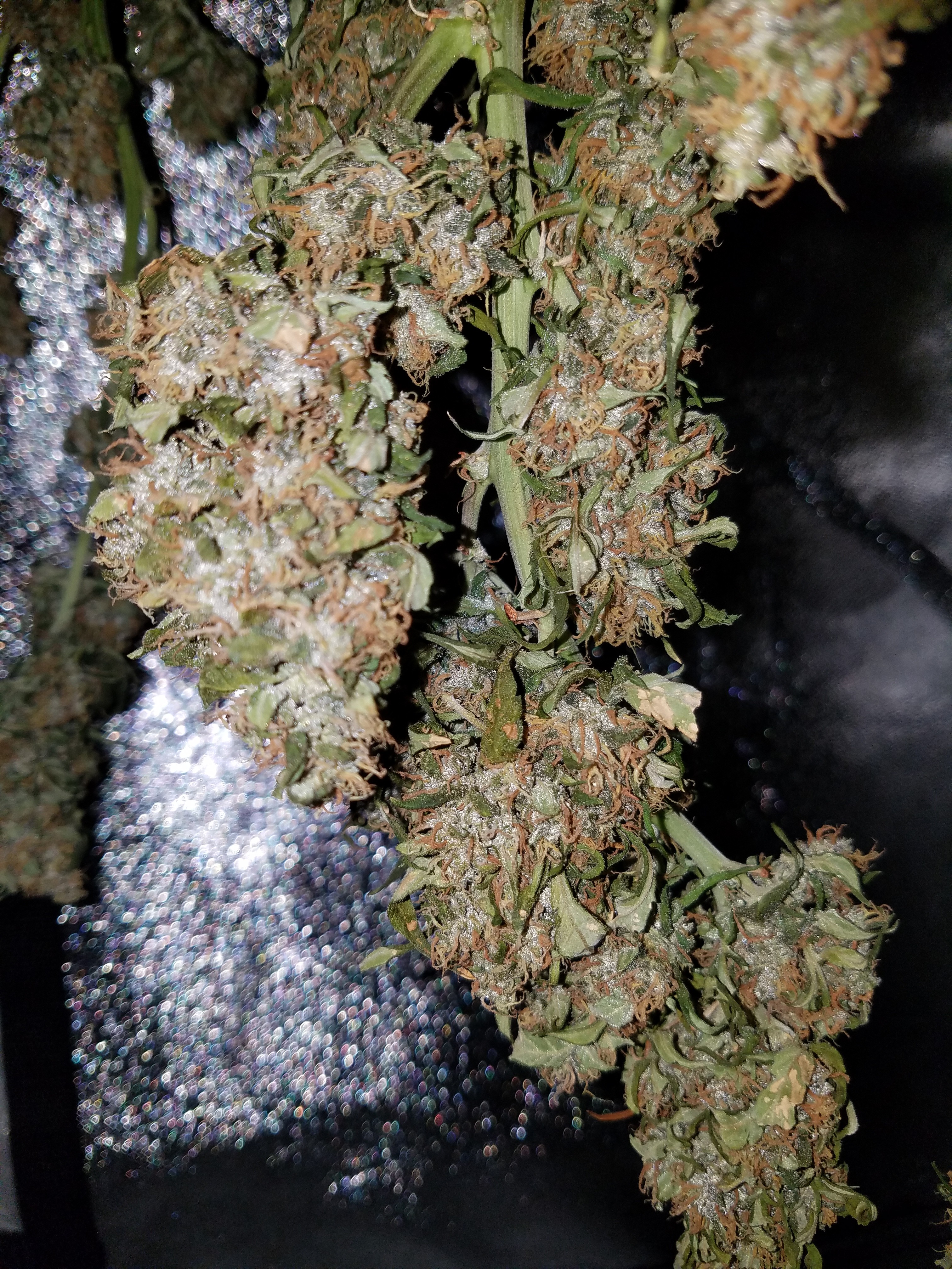 Plant 1: This was the highly trained and defoliated plant. It stayed the shortest and doesn't have very dense nugs likely because of its distance from the lights given the height of plants 2 and 3. Ended up with 2.5oz after 9 days of hanging.