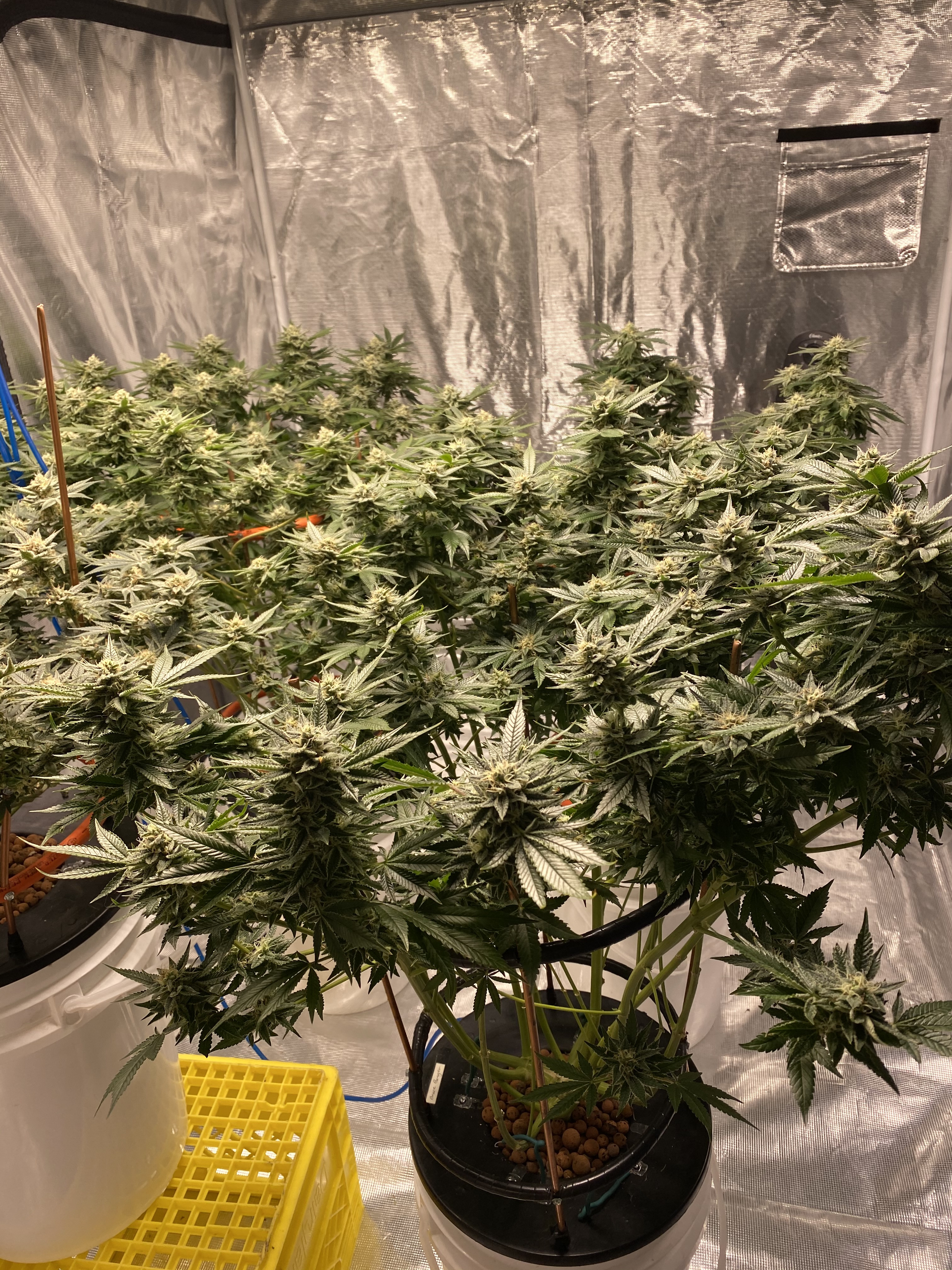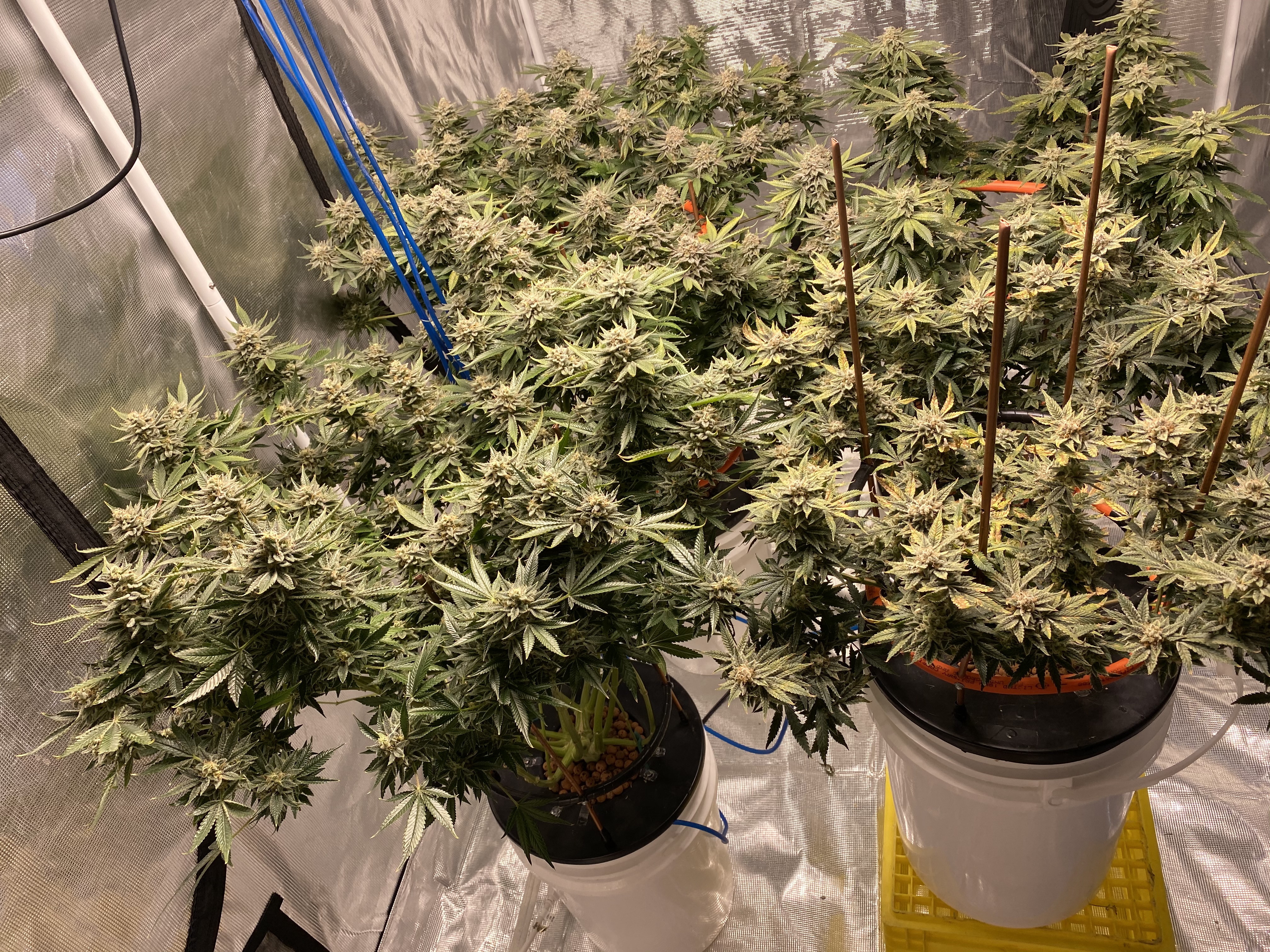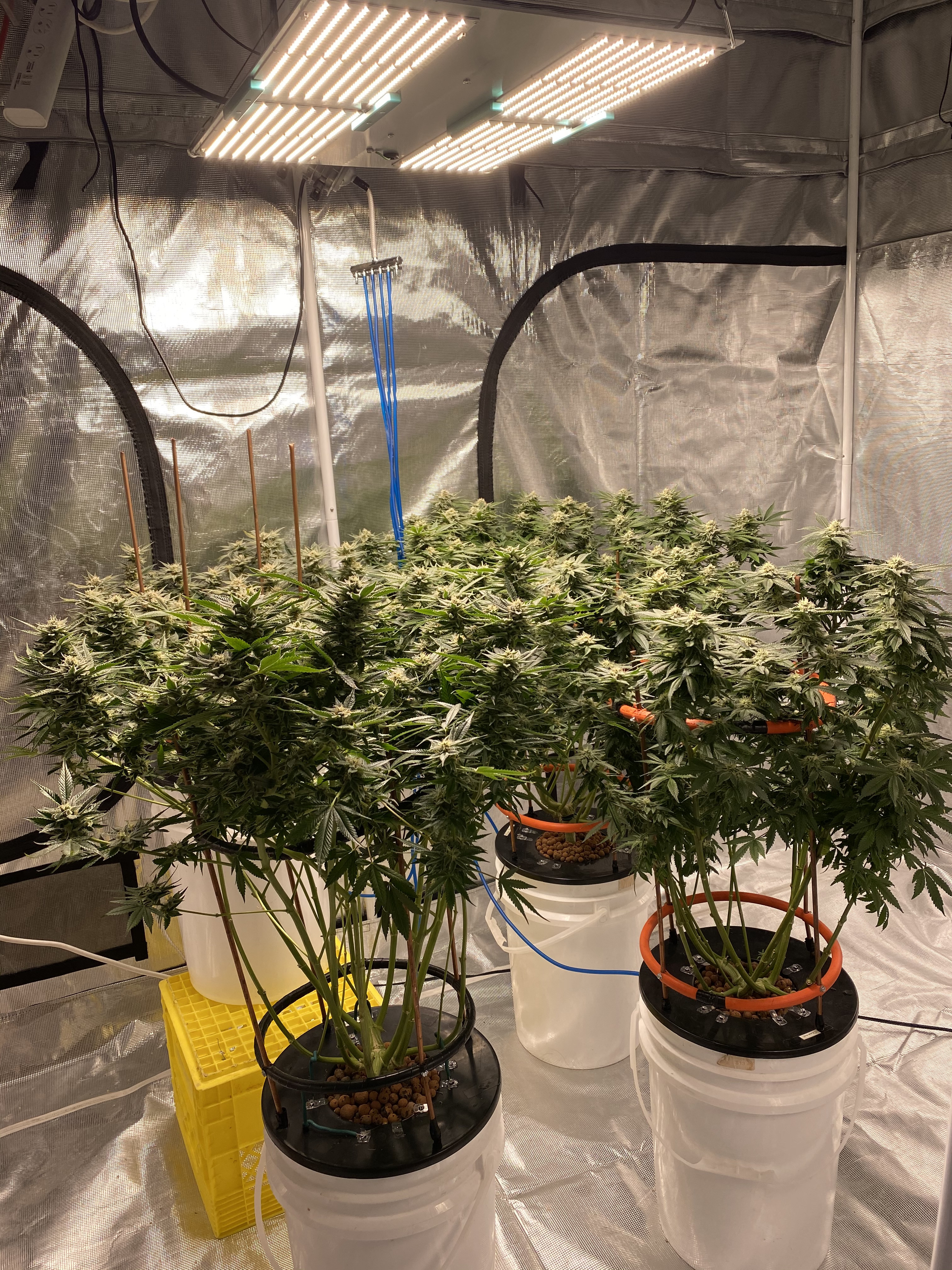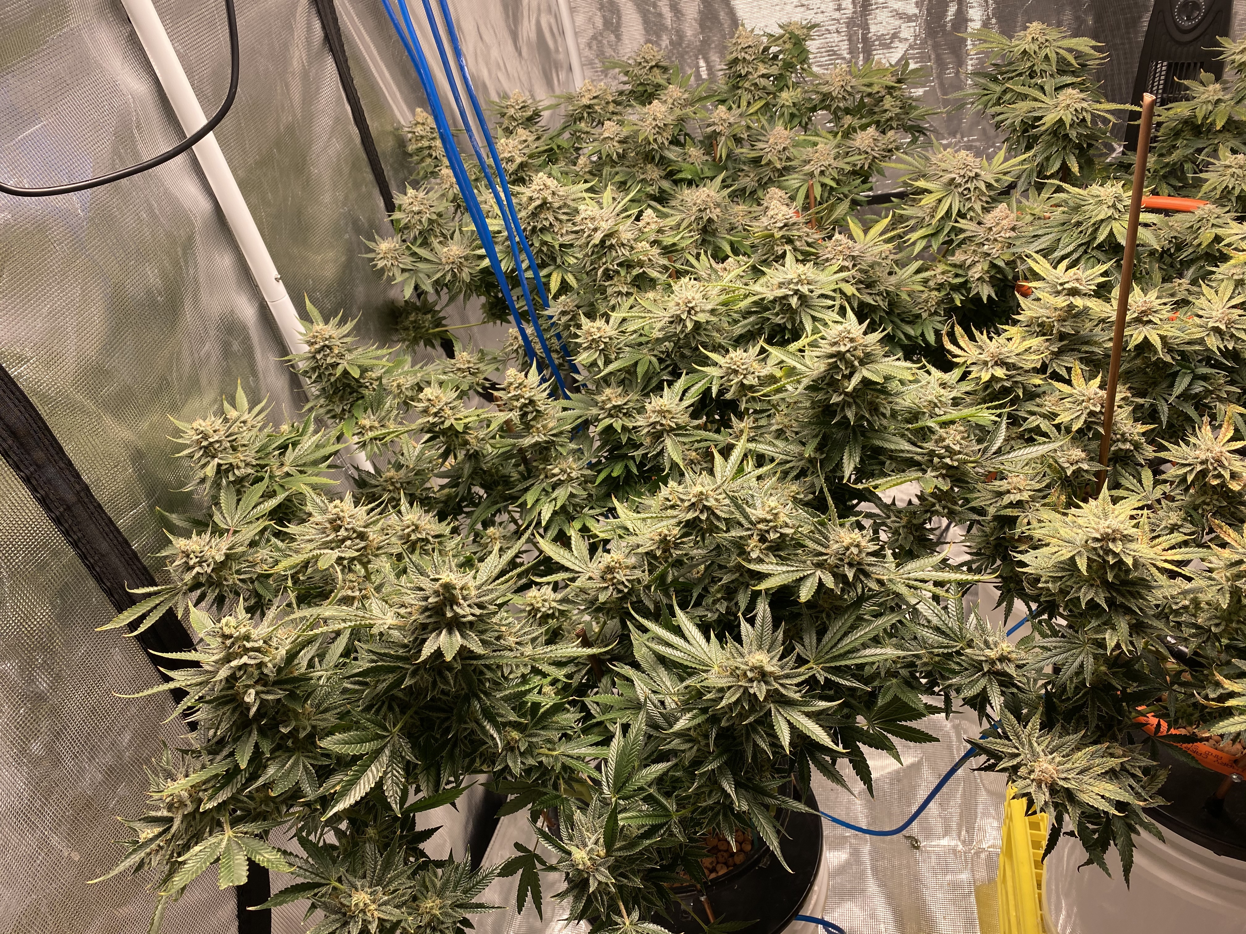 Plants got away from me a bit while on holidays, scrog didn't get filled properly so i took screens off. They not doing to bad all the same. 1 plant is a runt about 1 foot shorter than others but i have it up on a milk crate to try to keep the canopy relatively even. Few weeks away from harvest. seems like only couple of weeks ago i pulled down 19.3 oz on my last grow. Wife still on 1st Jar of 12. This crop won't be anywhere near 19 oz but should be ahead of the curve now so that's good. Wont need to purchase to supplement the grow.