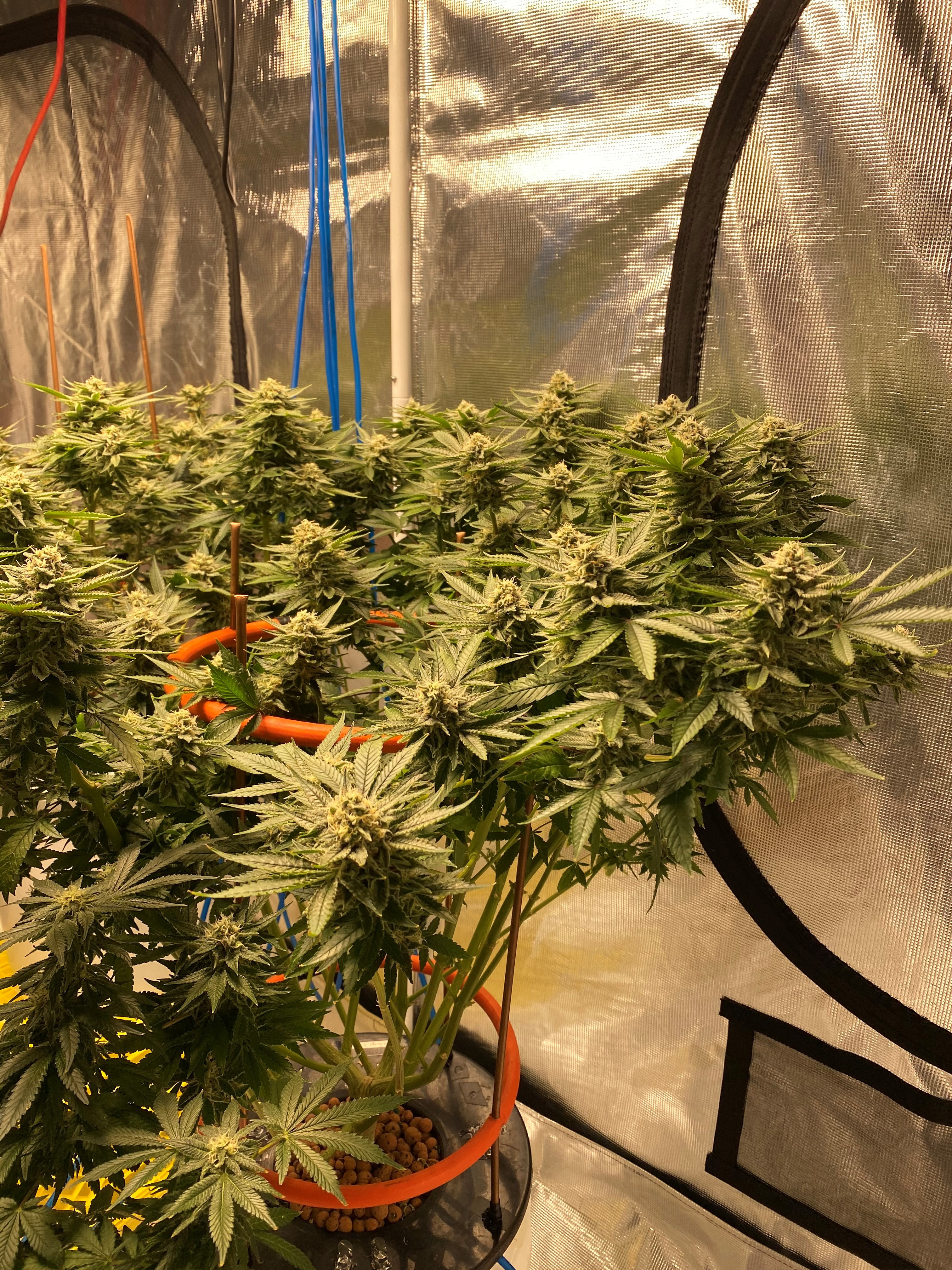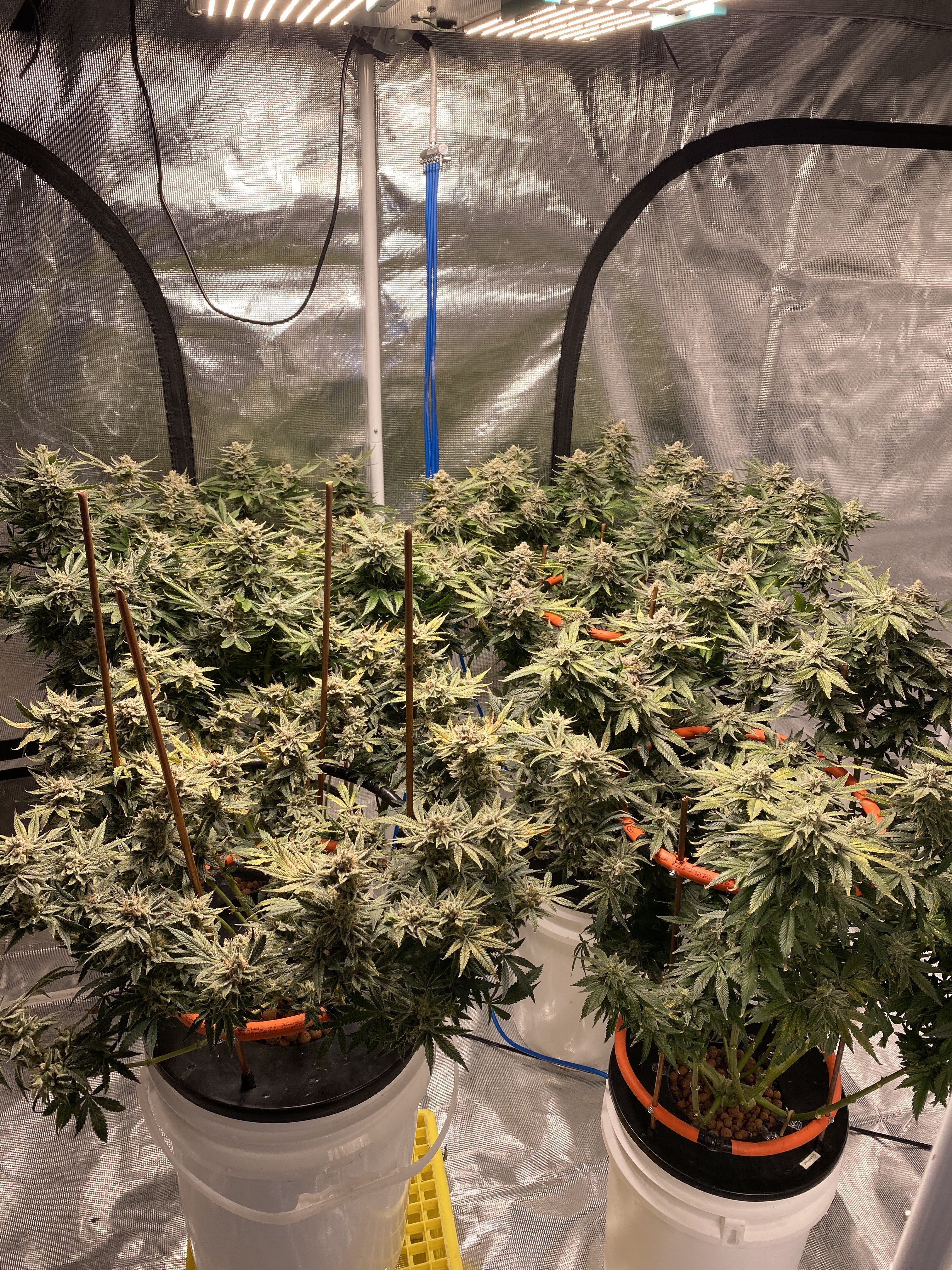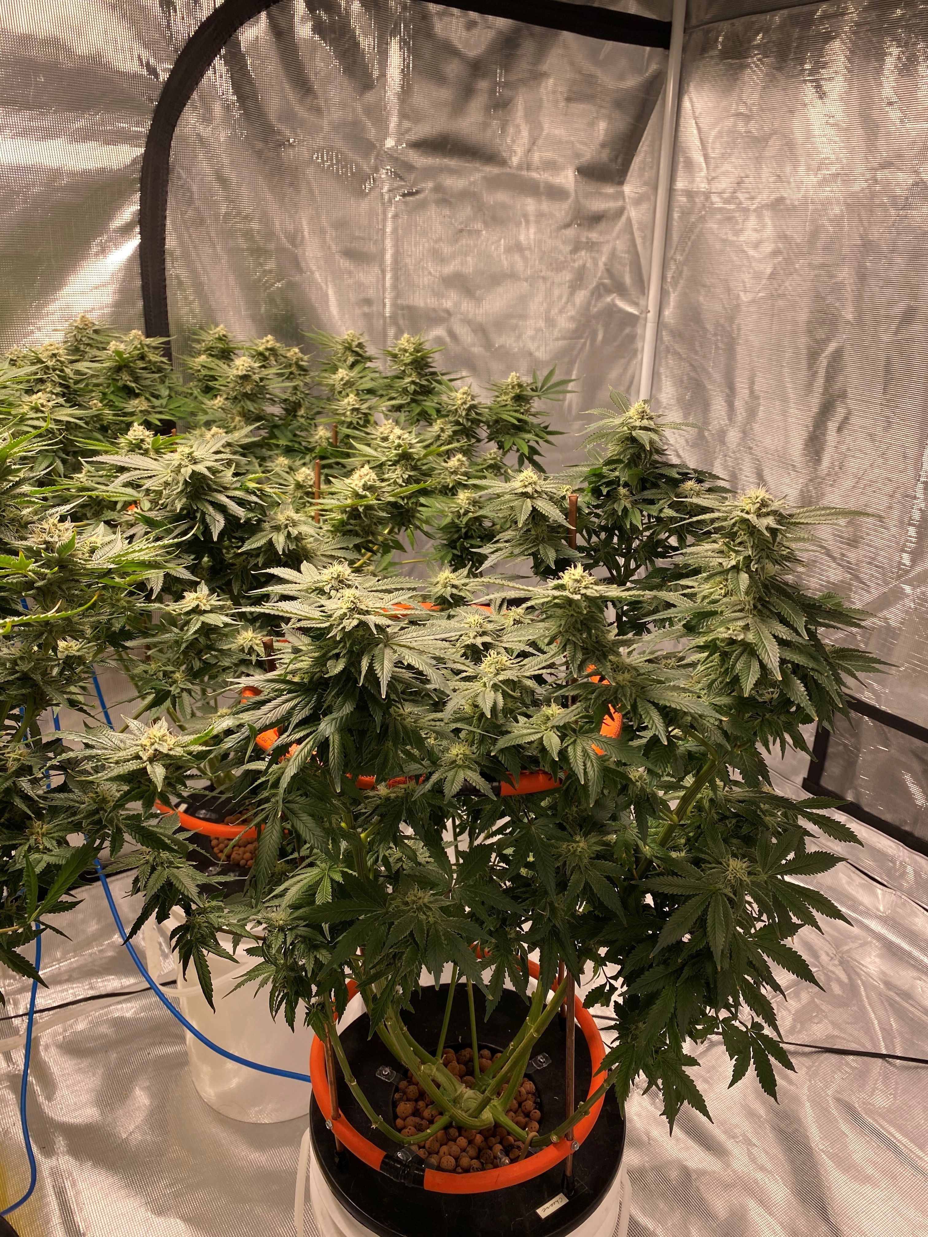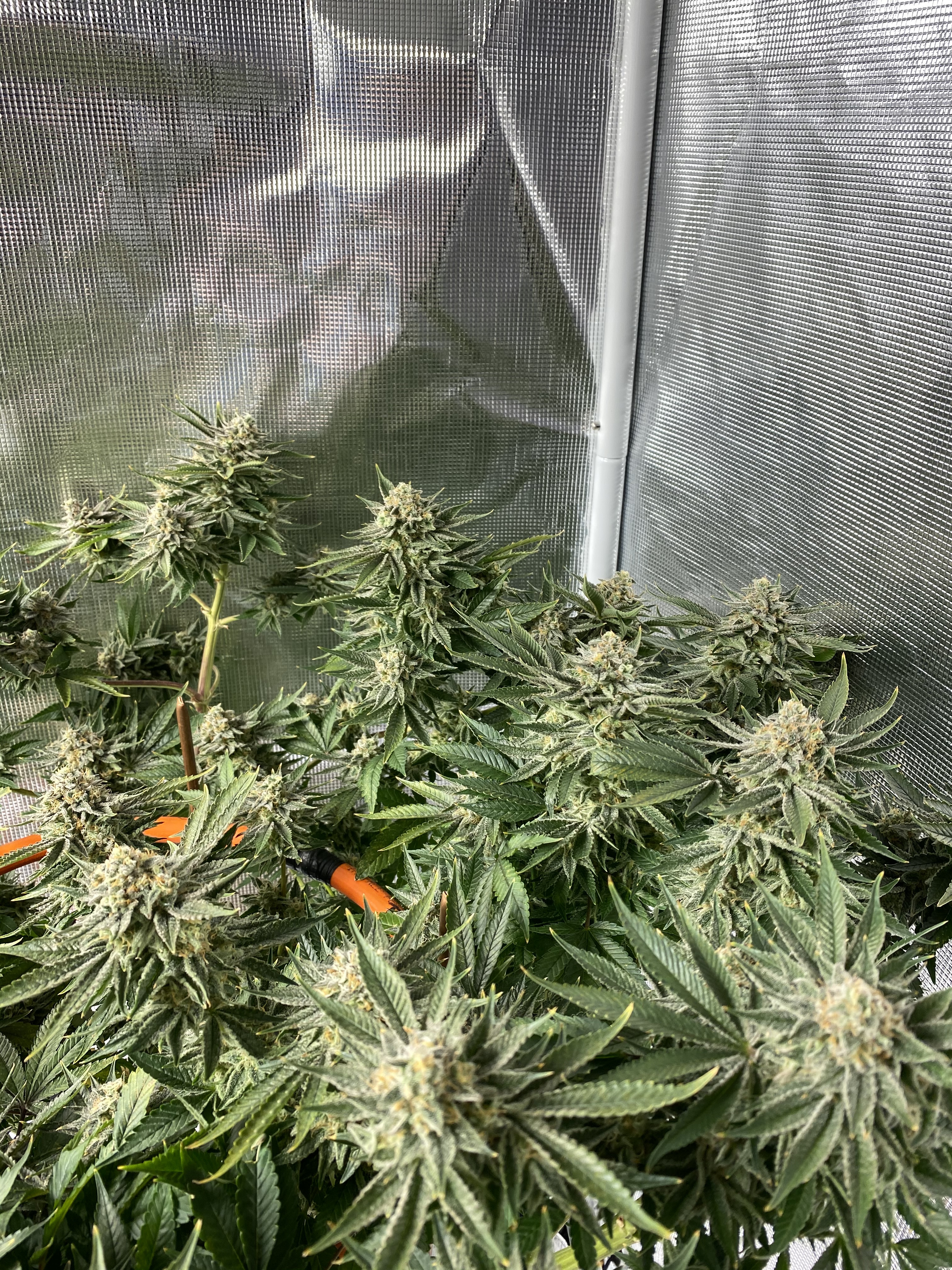 Plants got away from me a bit while on holidays, scrog didn't get filled properly so i took screens off. They not doing to bad all the same. 1 plant is a runt about 1 foot shorter than others but i have it up on a milk crate to try to keep the canopy relatively even. Few weeks away from harvest. seems like only couple of weeks ago i pulled down 19.3 oz on my last grow. Wife still on 1st Jar of 12. This crop won't be anywhere near 19 oz but should be ahead of the curve now so that's good. Wont need to purchase to supplement the grow.