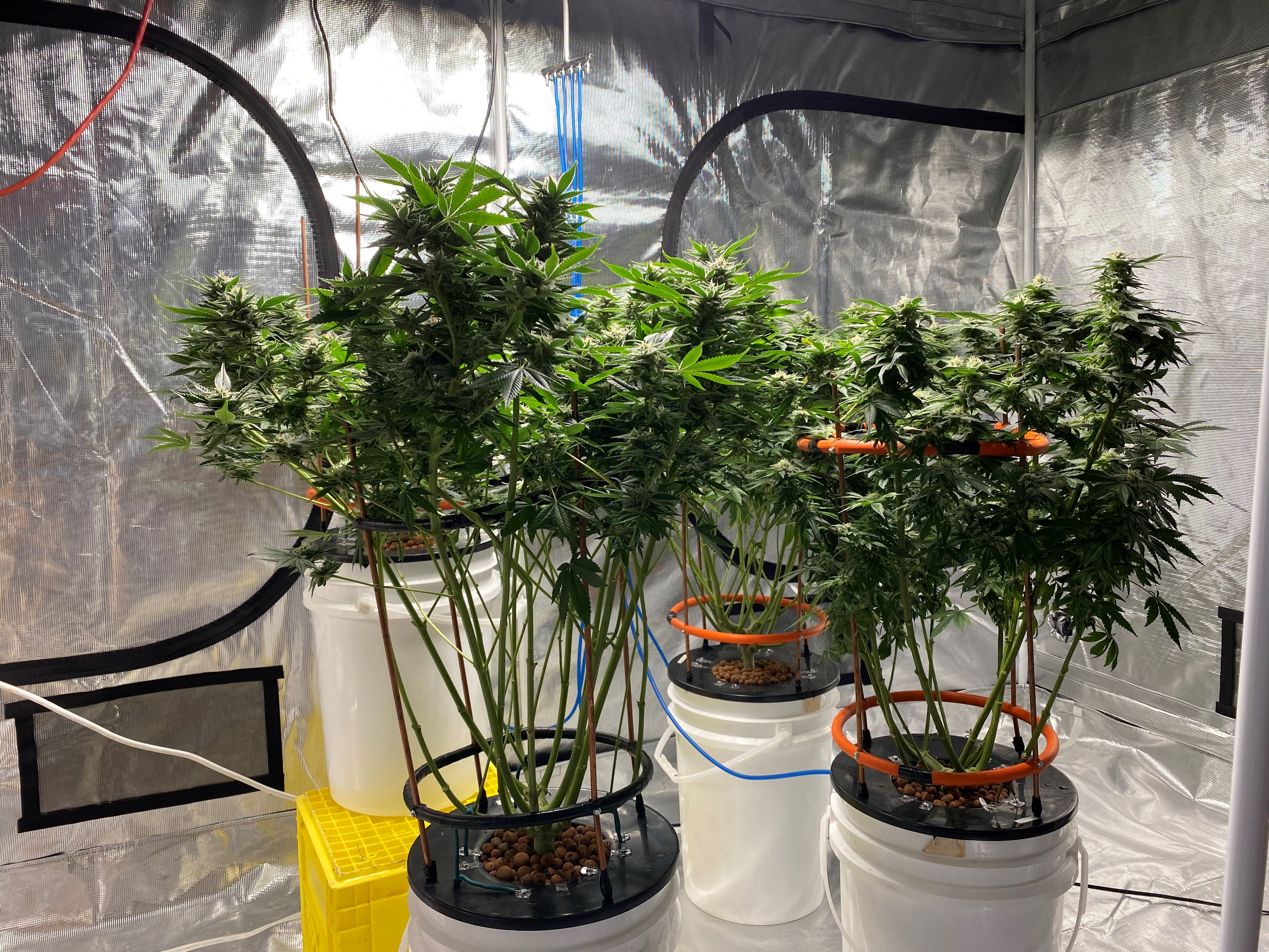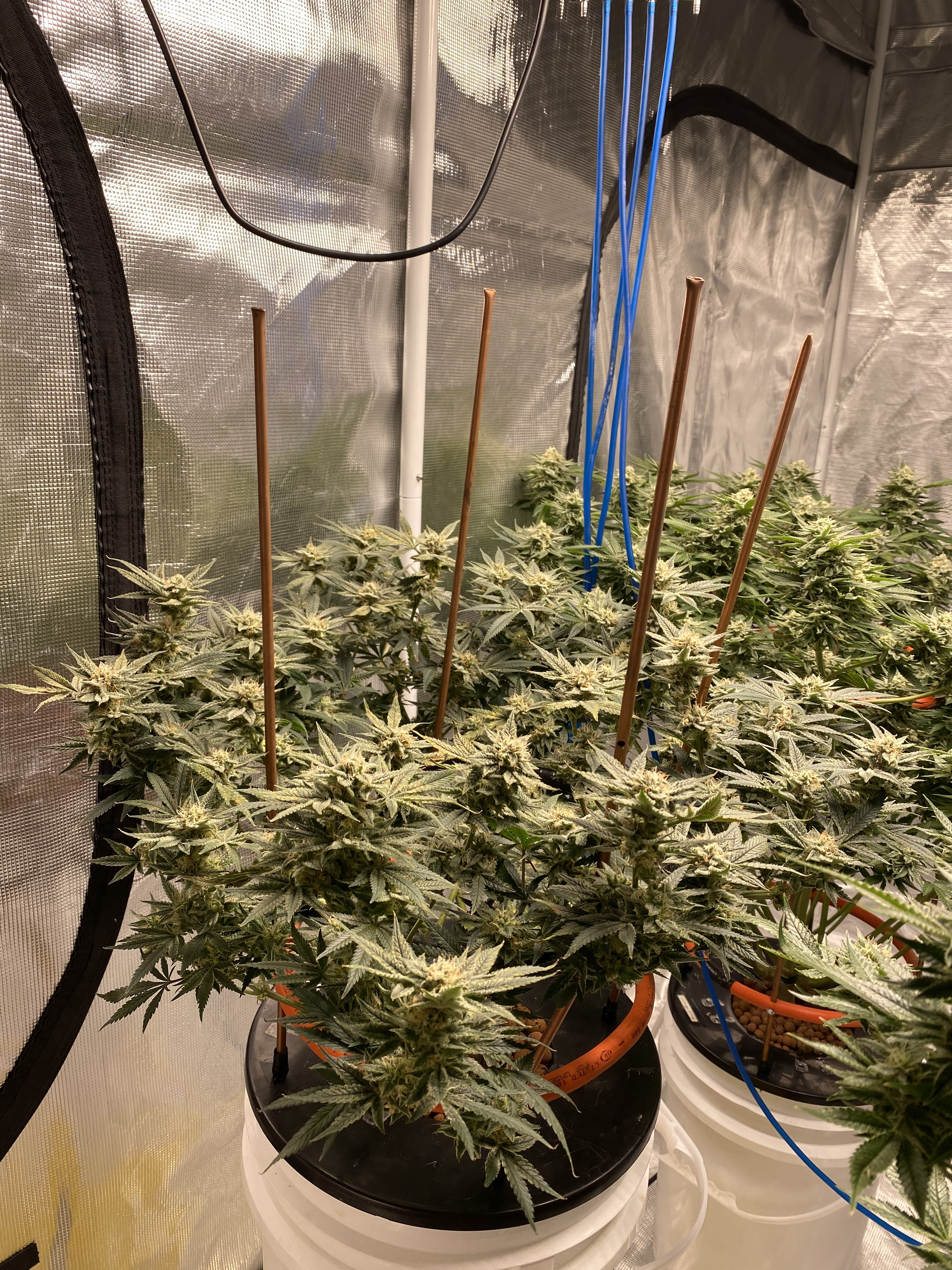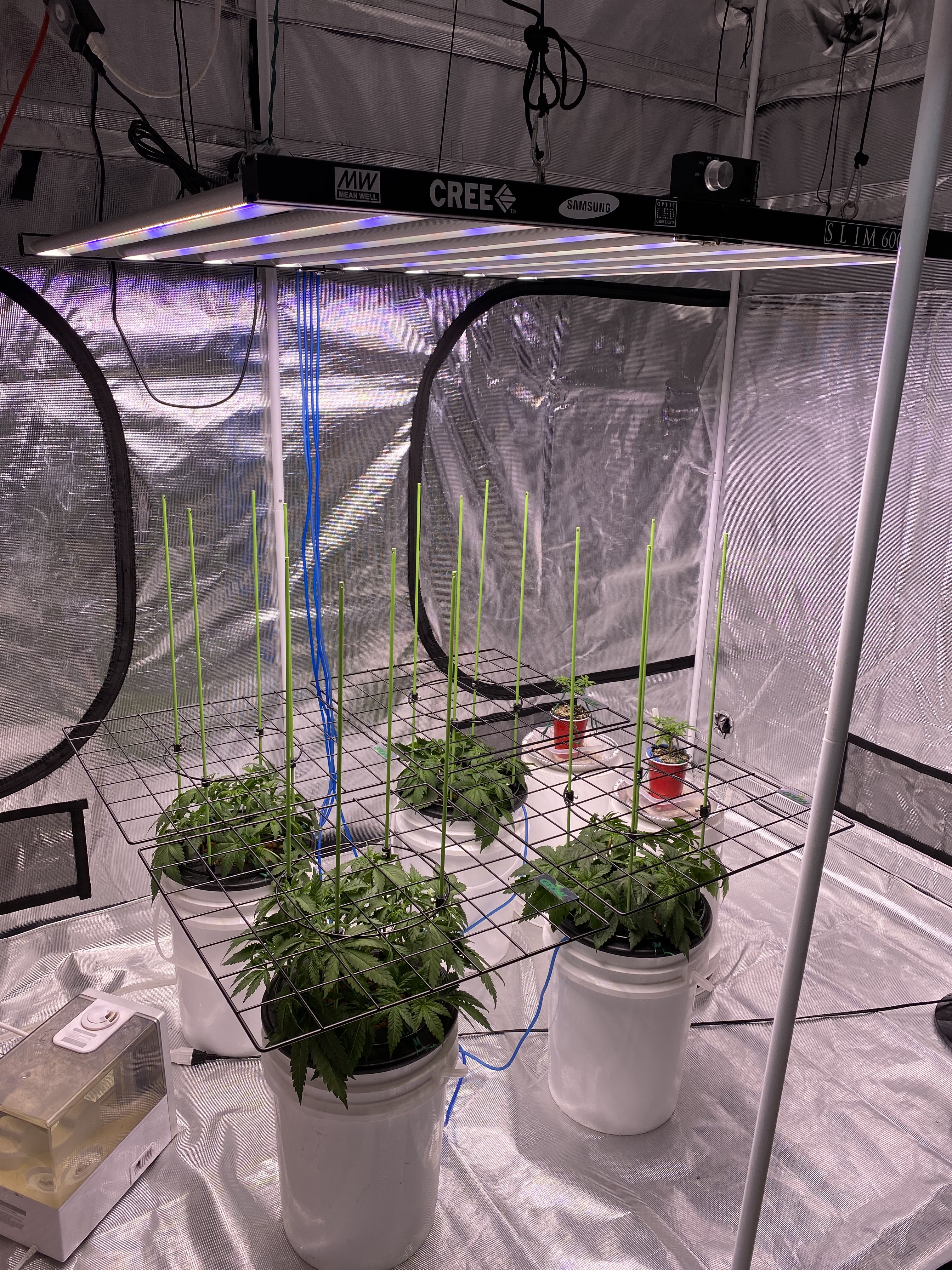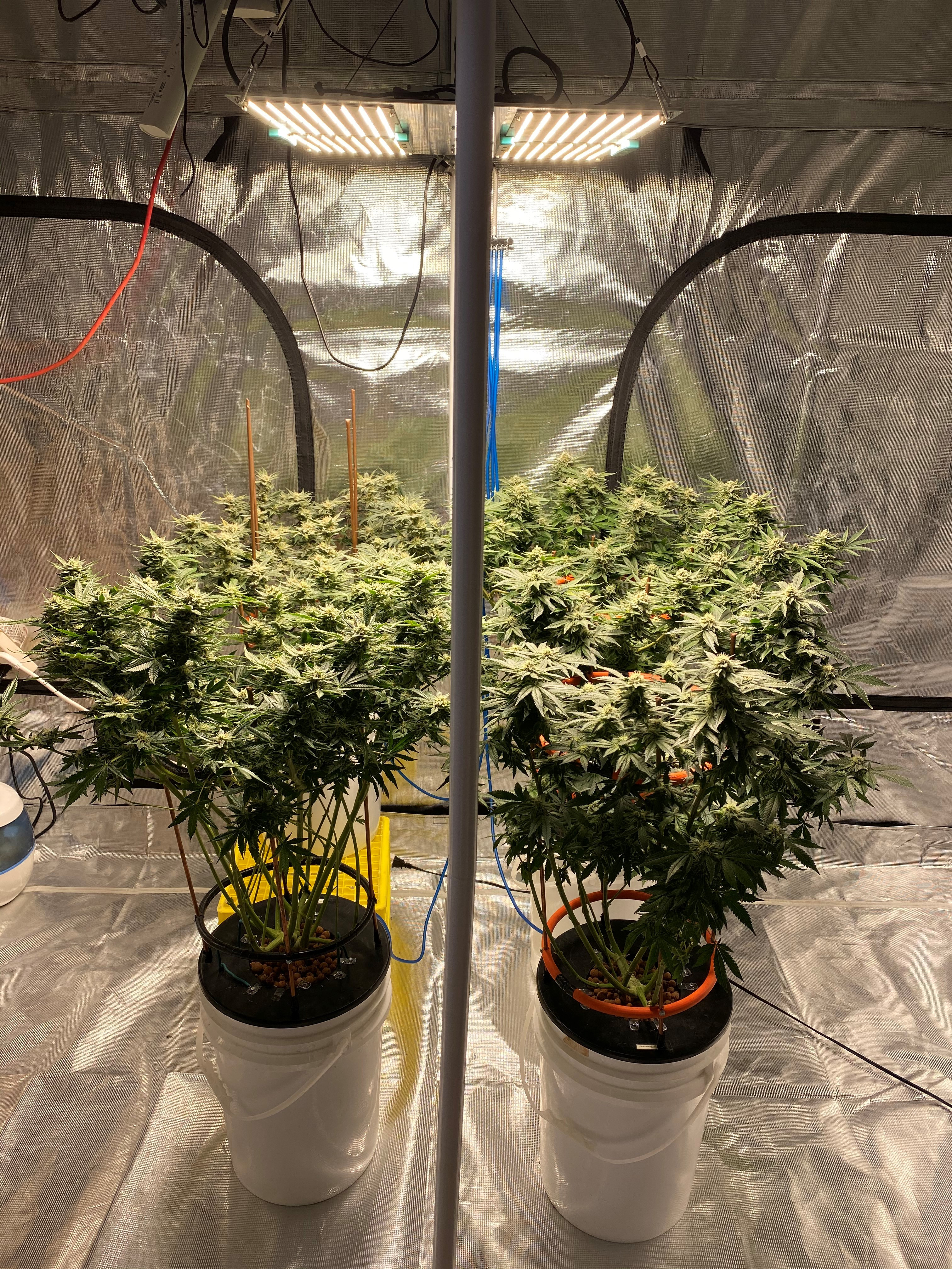 Plants got away from me a bit while on holidays, scrog didn't get filled properly so i took screens off. They not doing to bad all the same. 1 plant is a runt about 1 foot shorter than others but i have it up on a milk crate to try to keep the canopy relatively even. Few weeks away from harvest. seems like only couple of weeks ago i pulled down 19.3 oz on my last grow. Wife still on 1st Jar of 12. This crop won't be anywhere near 19 oz but should be ahead of the curve now so that's good. Wont need to purchase to supplement the grow.