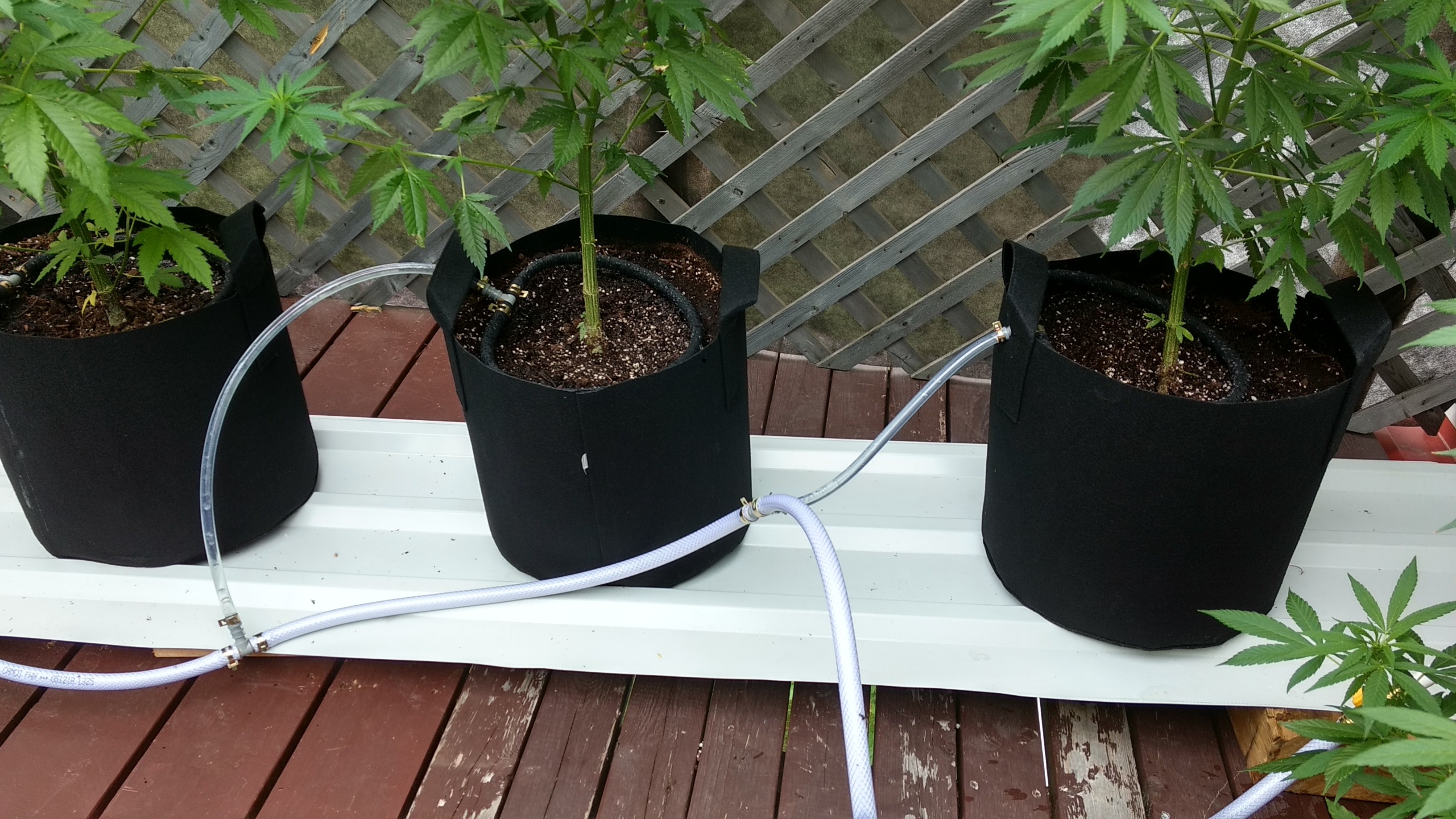 Cheap watering for 5 of my 7 gal. bags. Less than 10' soaker hose, 30" each for me, 10' garden hose. 10 each t's 3/8x3/8x3/8, 1/2x3/8x1/2 + clamps. Use restrictor washer from soaker hose on water end and end cap on 6" of garden hose on the other end if you need to add more later. I had 3/8" clear plastic tubing from bag to water supply. Works wicked good.