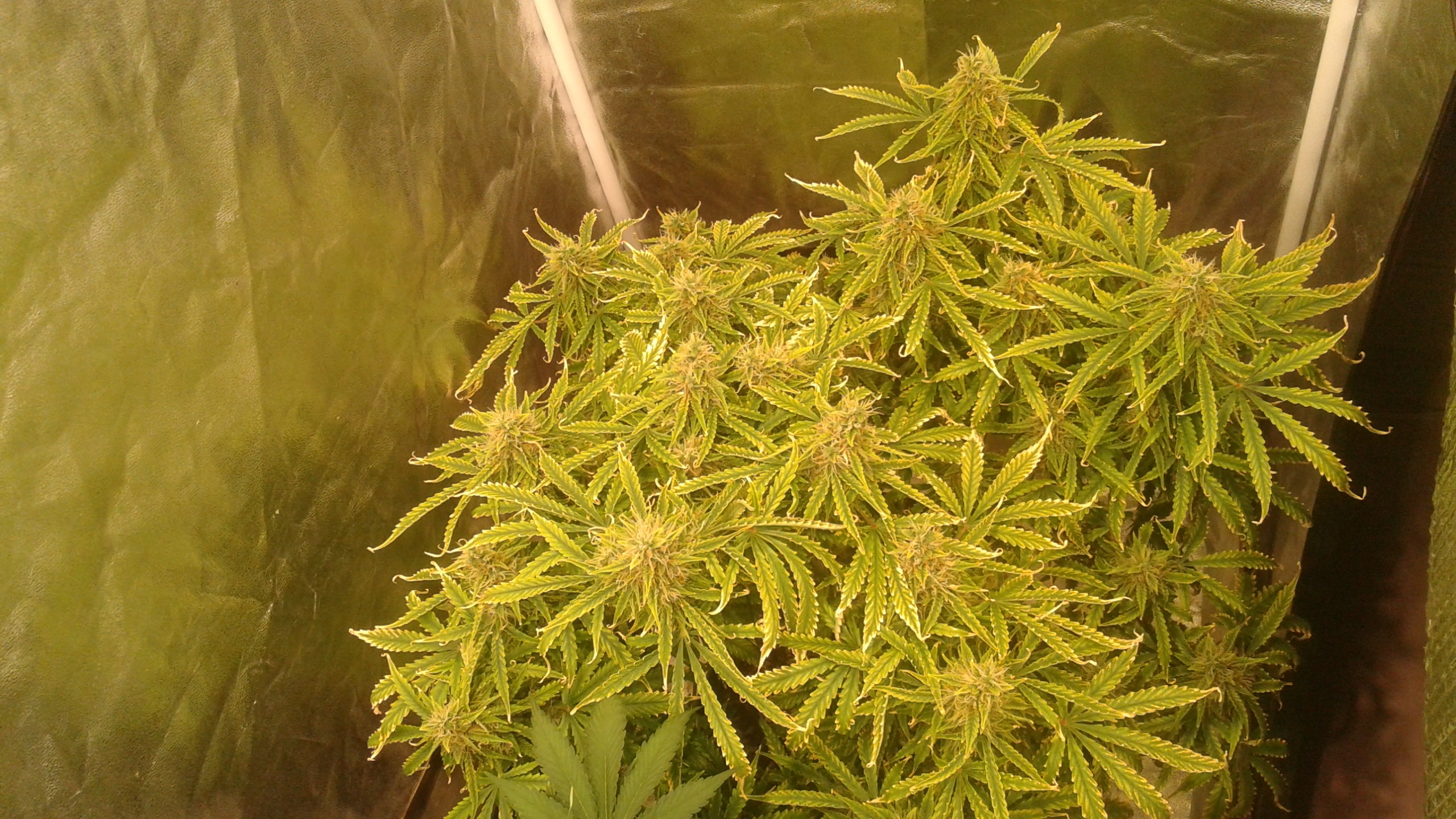 Here some pictures of my very 1st grow. Hydro in small box. I will post more pictures when harvest complete. I had to take tops as they were pretty much done and now the rest of flowers can get more light and develop more.