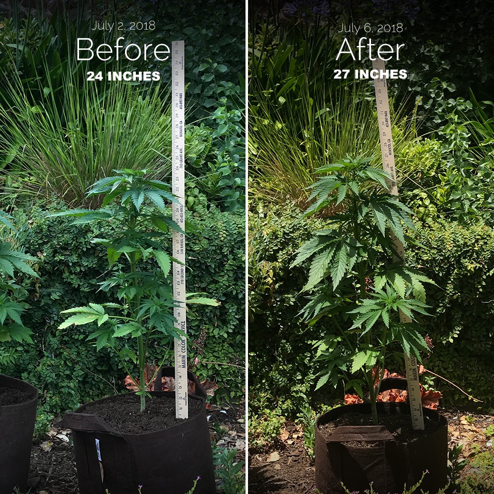 I'm helping a friend with his first time grow. He picked these seeds out of his medical cannabis and planted them. They started to yellow towards the bottom and look unhealthy - I suspected a phosphorus deficiency. I told him it might be time to move them out of a 3 gallon into a 5 gallon. We drove over to a local NorCal gardening chain and got some potting soil, (2) 5-gallon tote pots, and then visited the local hydro store for a Fox Farms trio pack and pH kit. Over the past four days we've observed the foliage turn back to a stable color and after plucking the yellow leaves which came off easily, the plant began to grow and look healthier. In four days it grew thicker, healthier foliage, and shot up 3 inches! I wanted to share the success story with the community and vouch for the power of pH balancing water, using properly dosed nutrients, and bigger pots.