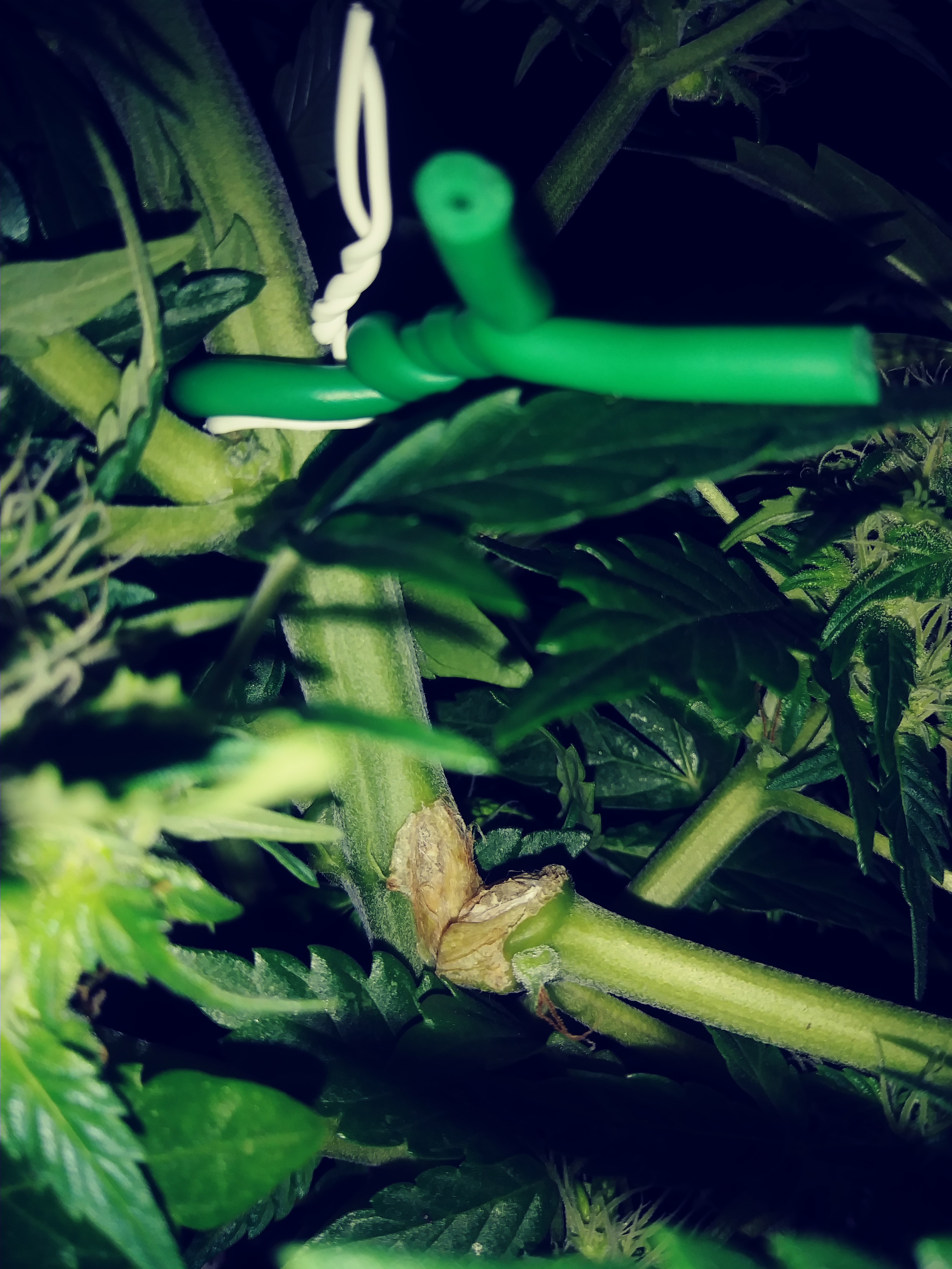 GG auto, sprouted 6/2. While trying to correct EC imbalance, noticed a lower branch that has broken off the main stem. To my untrained eye (1st grow), it looks like it happened more than a day or 2 ago. Have noticed some rust-red leaf spotting that started 3 dsys ago & now seems to be spreading by the hour. While investigating this, I noticed the damaged branch. In a very precarious spot, hard to directly address without bending, manipulating surrounding branches. Broken branch is holding significant bud, but if severing branch will save rest of plant so be it. Not sure how to proceed. Open to suggestions