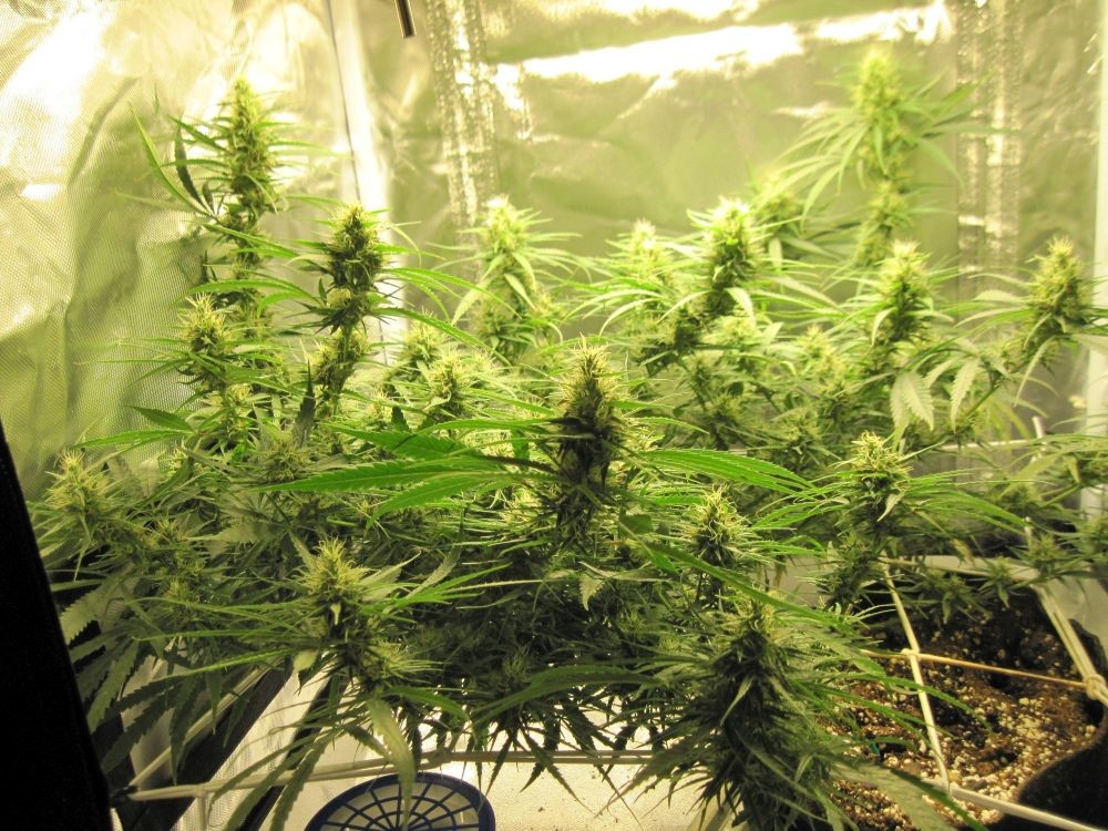 Week 7 now (I'm only counting weeks in flower as this girl was in veg for WAY too long). Some buds look closer than others (the last closeup pic is about an inch from the soil level--I'm surprised those buds are even developing). Temps are between 68-73F; RH is around 50-55 (methinks the Damprid wasn't the greatest idea) I have a dehumidifier but not enough outlets but I also have air movement in the tent, so I hope I'm OK. I cut off a few popcorn buds near the soil line that were getting soaked during watering--and that's how I realized I really should wear gloves when working with her (sticky). There's very little odor; occasionally I can get a very faint whiff of cannabis in the front hall (opposite end of the apartment) when I come home from work but otherwise there's almost no smell unless I stick my head in the tent.