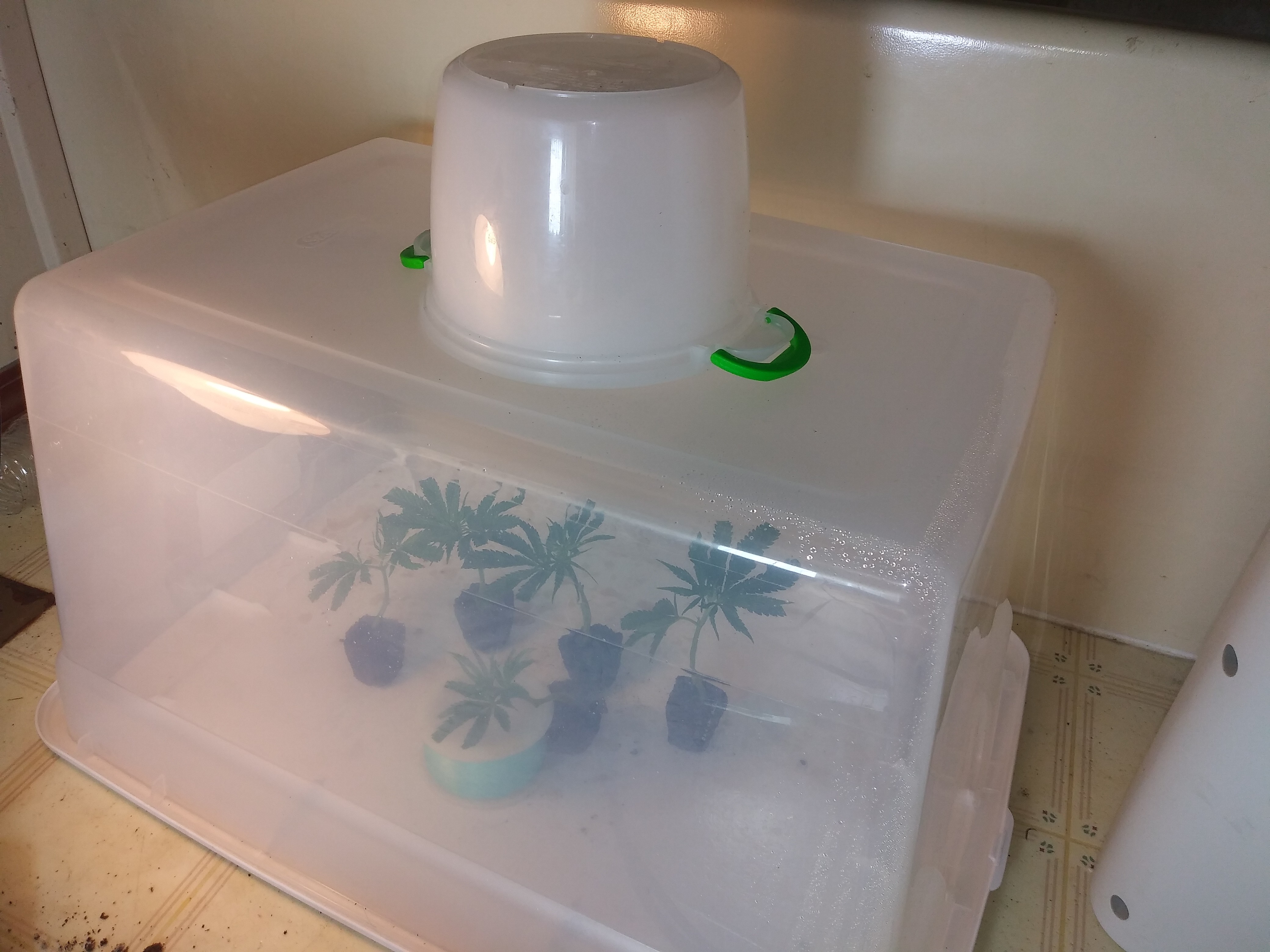 Clones are looking good, better then previous attempts. Definitely think it's the root riots that are keeping them happy. I've tried in jiffy pellets before but still had to cover them inside my make shift dome. They would just limp over in those. I've tried planting directly into medium and they don't much care for that either. I like how perky they are in the root riots and my dome is just fine for them.
