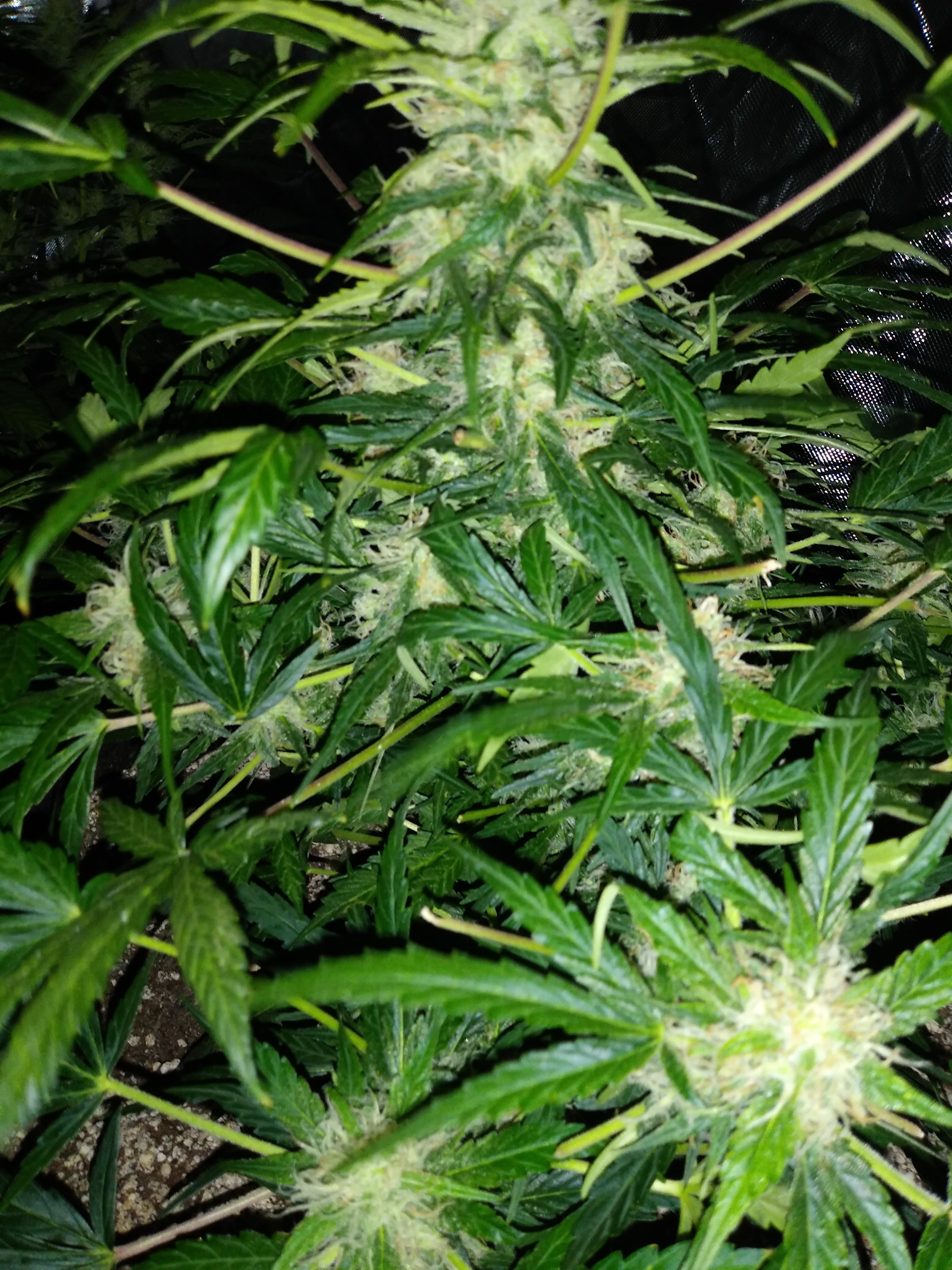 Battling some gnats atm that rain stirred them up laid down some bti, hung fly strips, and made a trap with apple cider vinegar. I'll be getting in there tomorrow with an alcohol solution and try not to soak my buds. I'll have to wait to de since they need watered tomorrow too. Not sure how they're getting in though since the room is pretty much sealed. I've taken IPM steps for my soil that's under the top soil and forgot about treating the top. Note to self treat the top soil after you transplant 😆. So they may have inhabited my open bag before I potted up on my clones I threw in there facepalm. Another lesson learned 😉. Well can't go without giving you guys some pics 😃.6 Photoshttps://forum.growweedeasy.com/forum...-she-s-a-beast