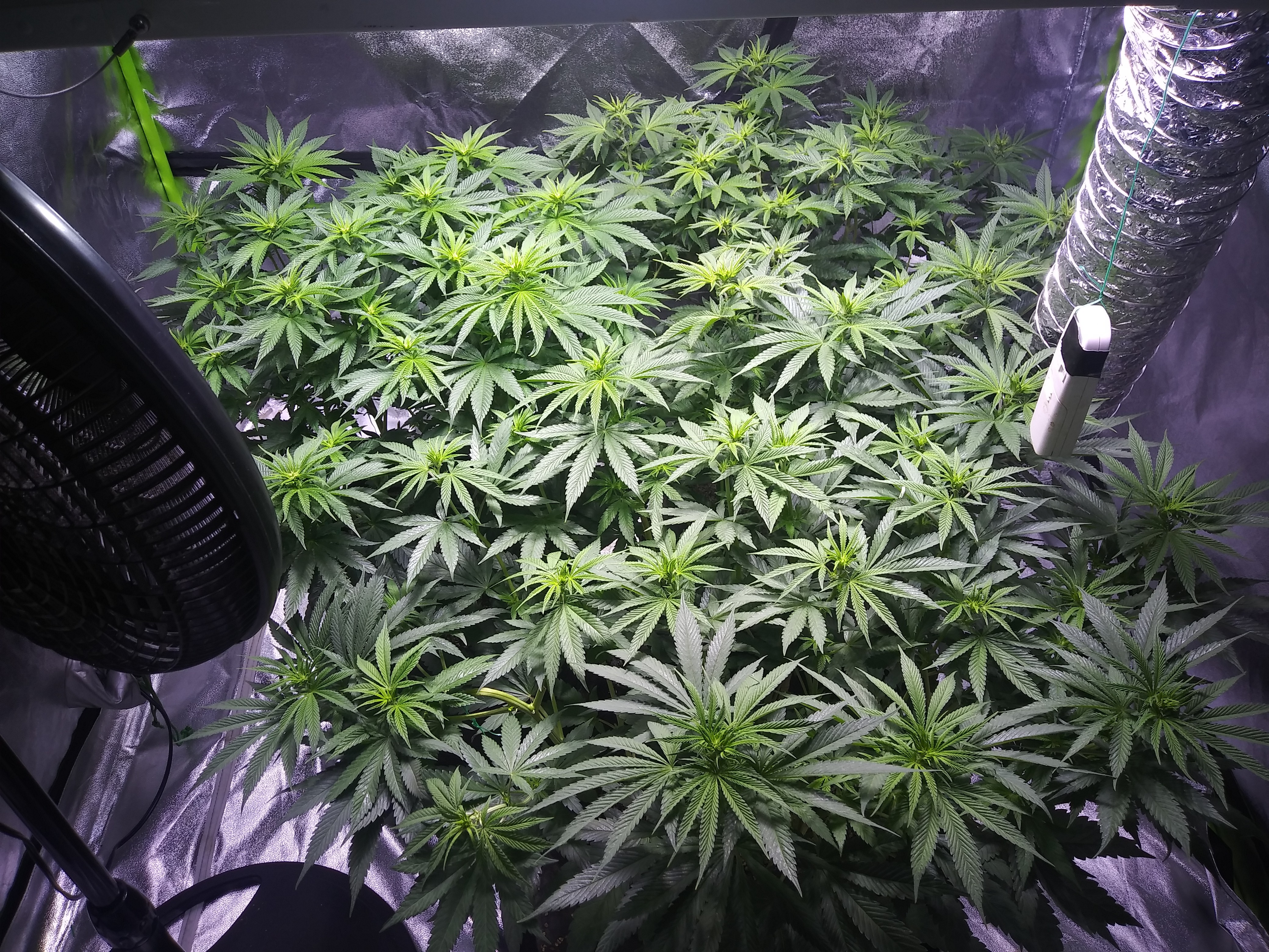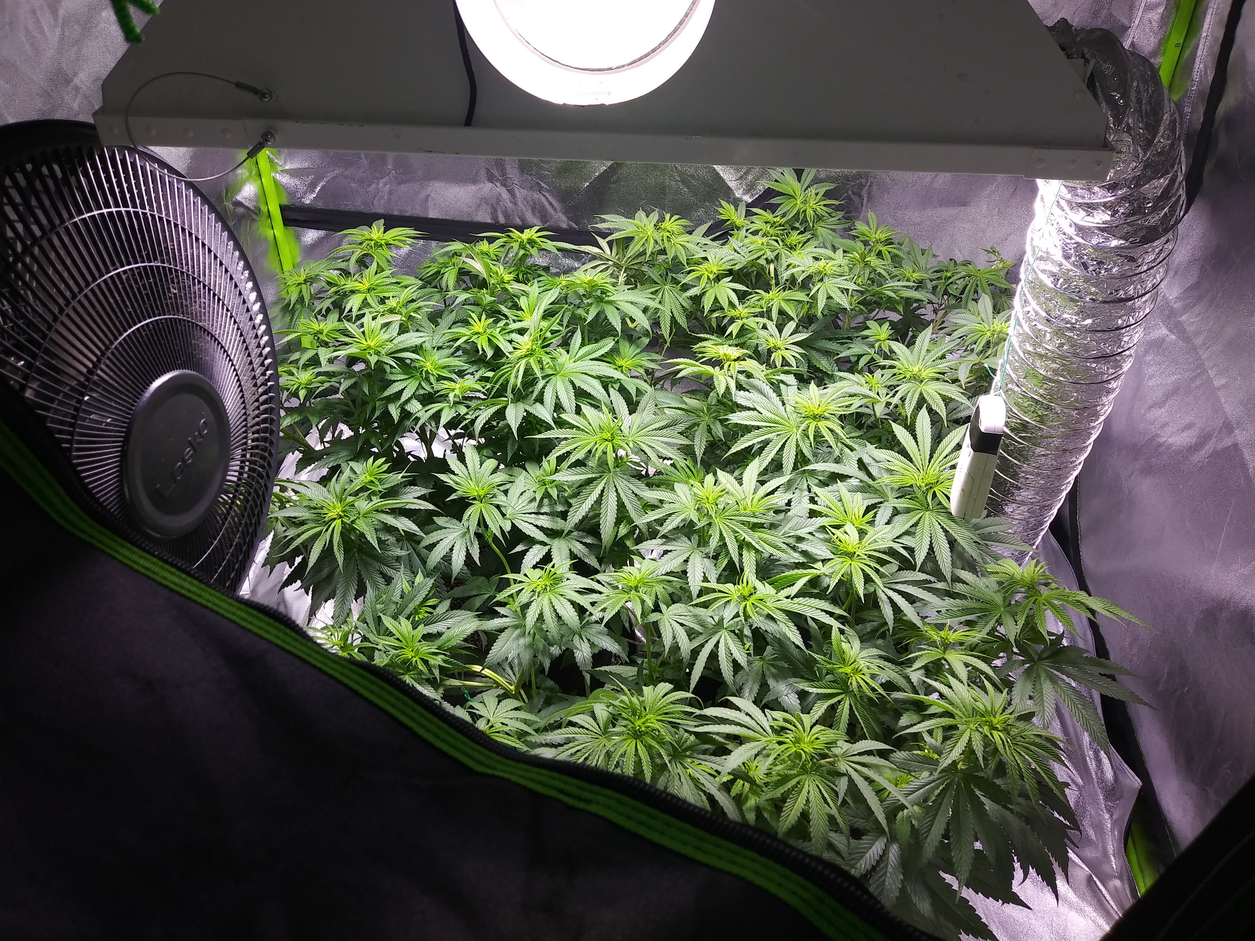 Dgth. Switched to hps today, going to get in there and do a little training and haircut when it's time for lights on. Raised the light a bit and will be setting the ballast to 1100 watts for the first time ever πŸ˜†. Was thinking of picking up a new bulb too. Top dressed bti, kelp meal, granulated humic acids, epson salt, roots organics uprising foundation and bloom, and rock phosphate 5 days before flowering started. Watered in and added molasses to today's watering. Will be brewing ewc tea soon. After haircut I'm adding de/silica/ipm to top soil, still having a gnat issue. Pics right after lights out and bulb change. Click image for larger version