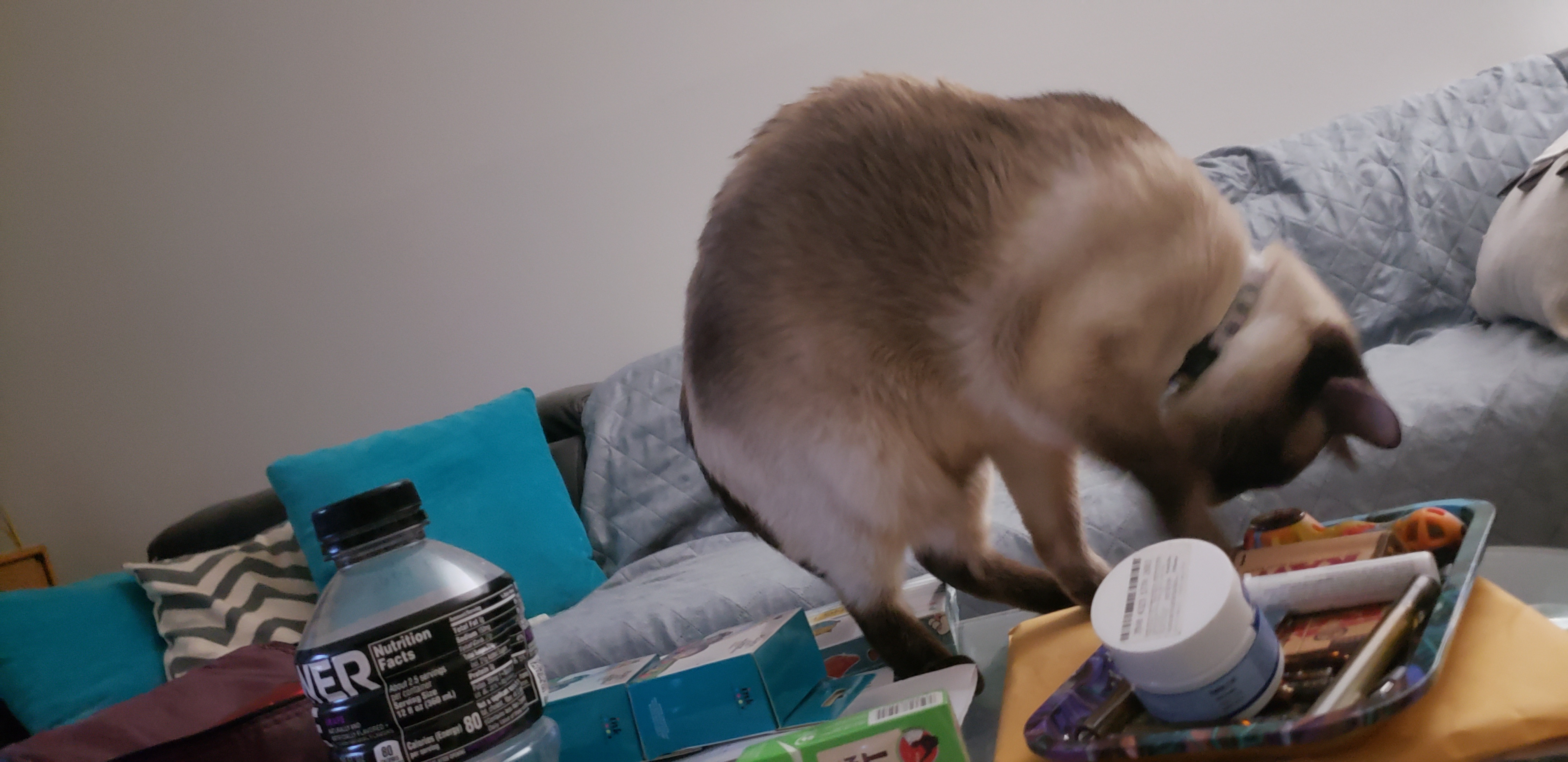 Anyone need a Weed Eater? He almost pushed the tray off the table while grazing. The night before he was obsessed with taking the dab tool off of my nightstand, after he looked through the drawer. He could be a dastardly cannabis-detecting cat. Click image for larger version