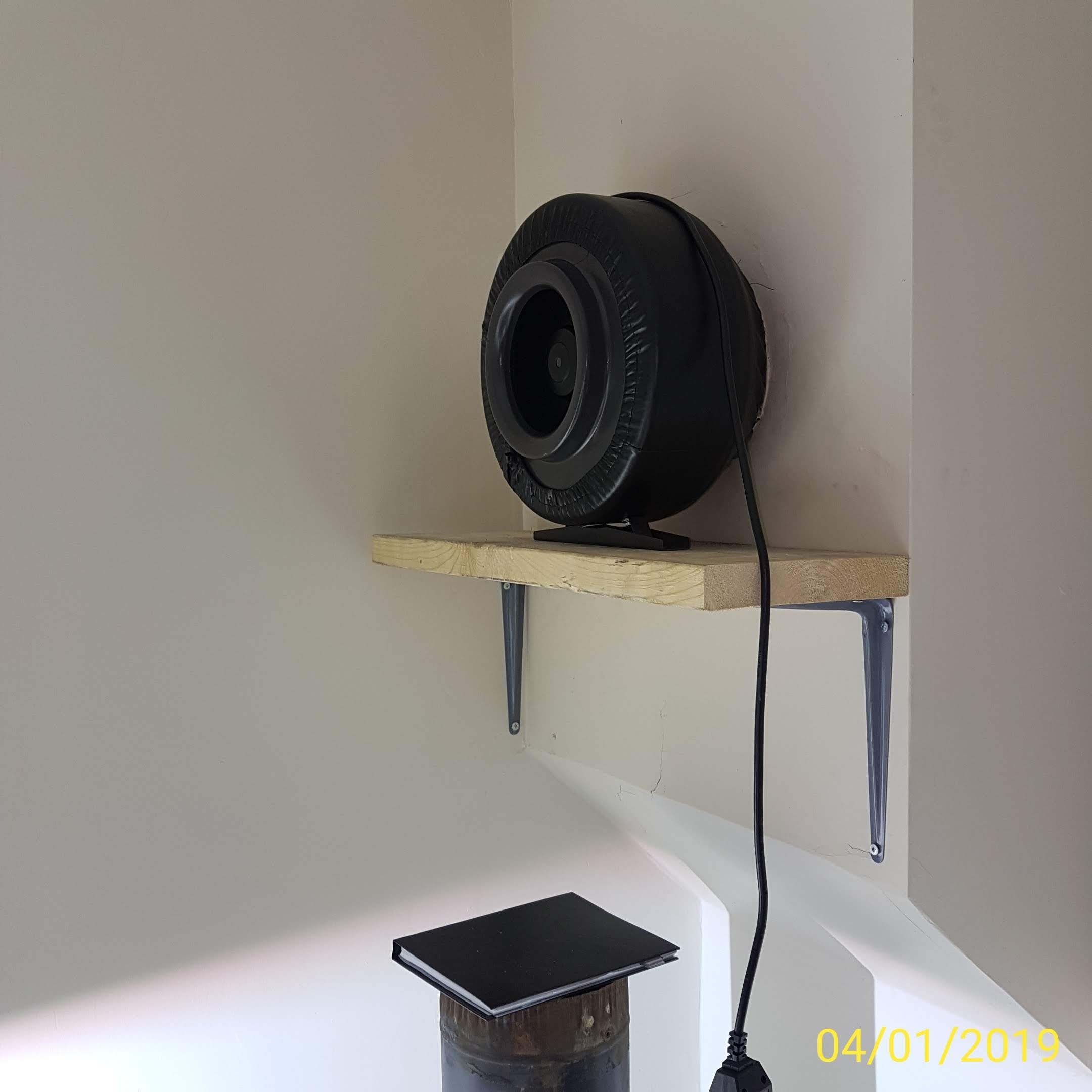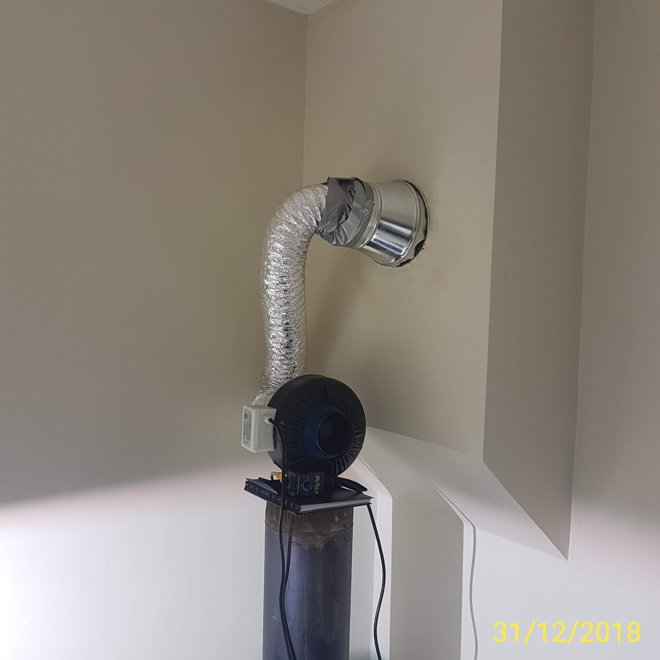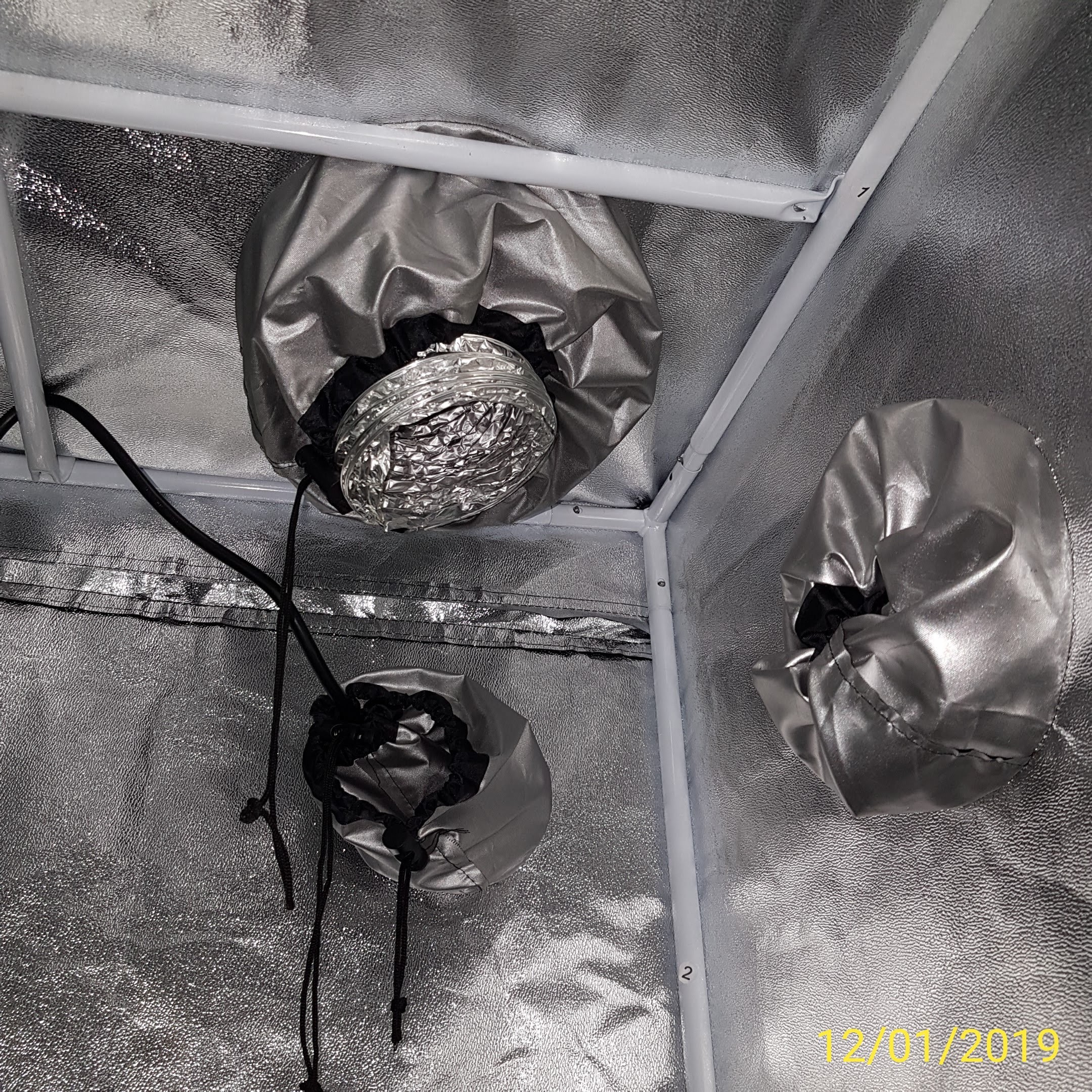 and 4" passive intake, pipe running along back wall to prevent light leak and allow intake to be diagonally opposite the extraction vent (extraction = top right of tent, intake = bottom left of tent)