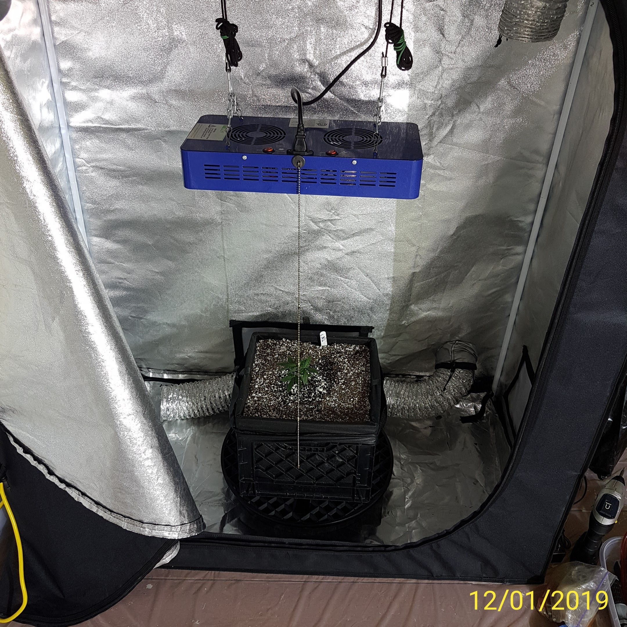 she is living in the 2x4x5 tent, under my blurple LED (Meizhi r450 - 197W draw)