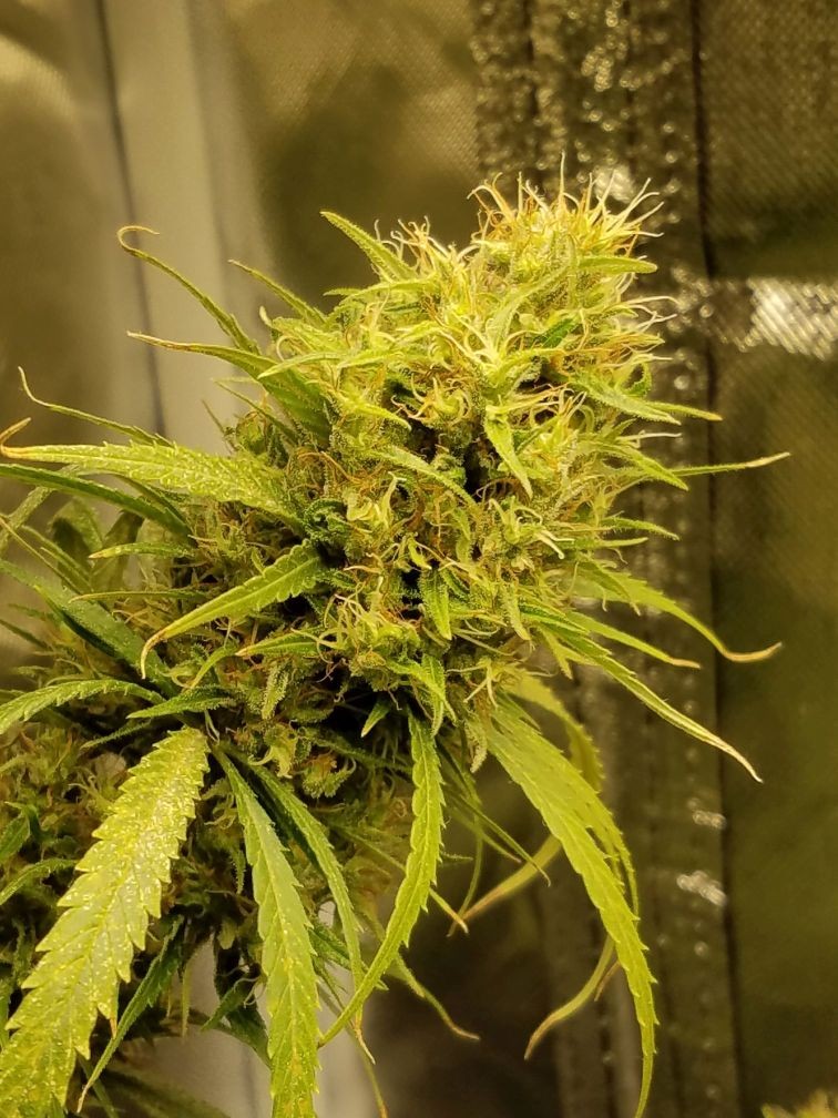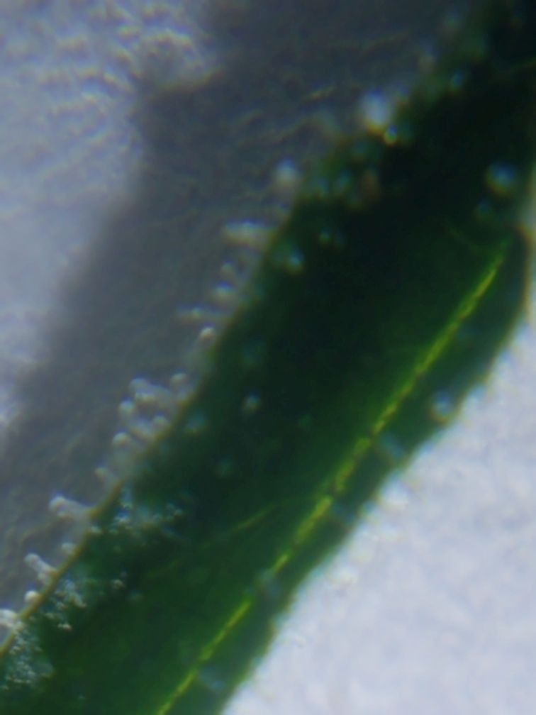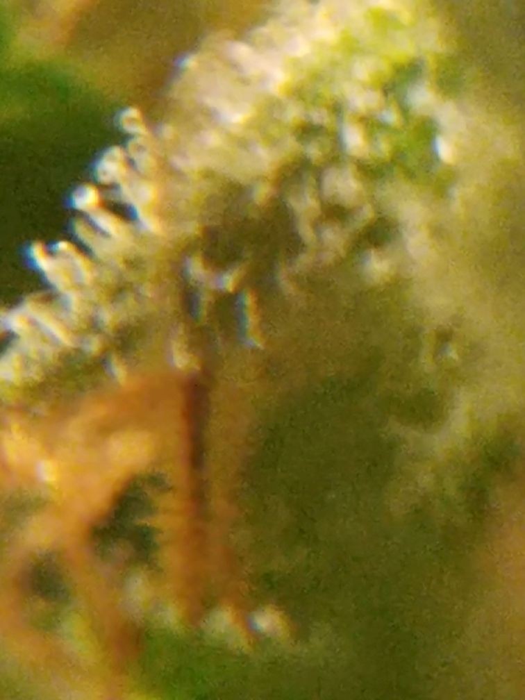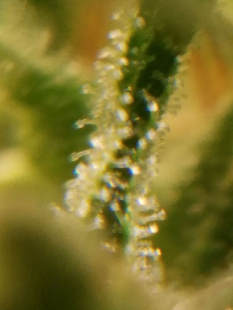 This thing is in week 12 of flower (I think...things got crazy here for a week or 2 and I lost track). I'm using the FF flower feeding schedule, added a bit of molasses. I'm still trying to get the hang of photographing with a loupe; my cellphone seems to play best with it. For the last pic I snipped a sugar leaf and put it on a piece of paper. Thoughts? Most look cloudy to me but I'm no expert. She is getting fragrant at times but it's not objectionable; roomie says it smells almost like Old Spice with a hint of weed